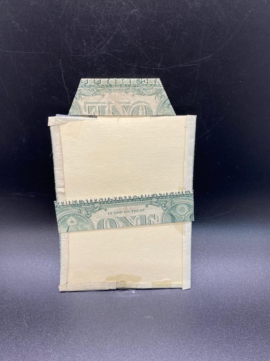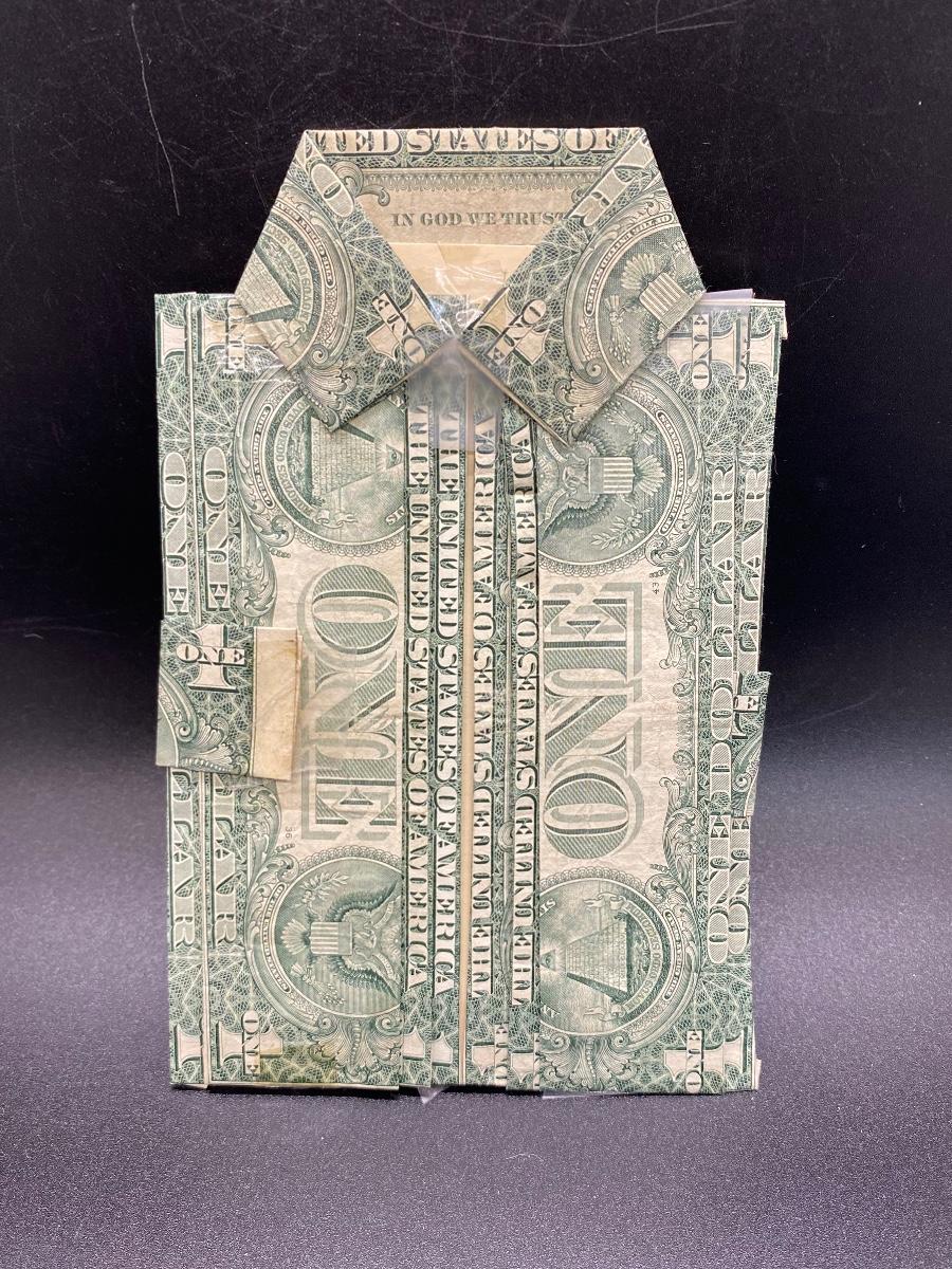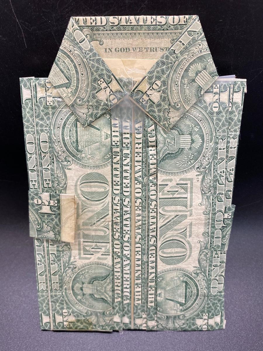 Folded dollar bill origami shirt. Made of 6 $1 bills.