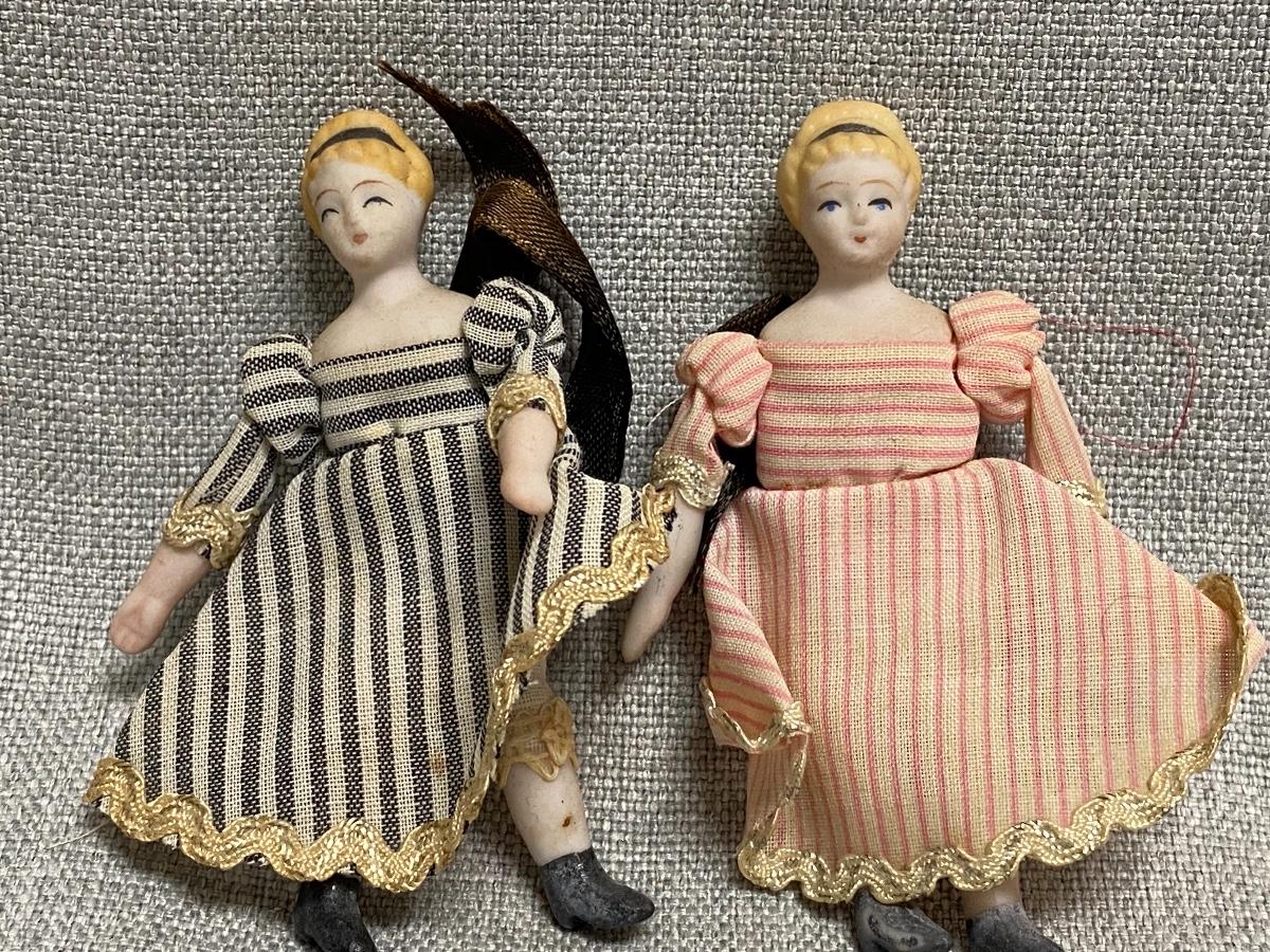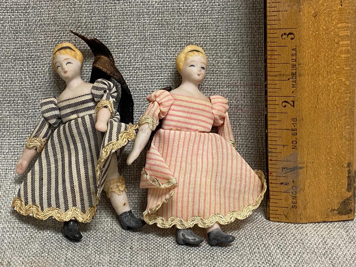 Pair of 3" bisque/porcelain dollhouse dolls. Similar jointed dolls, faces are painted a little different. Jointed. Unmarked.