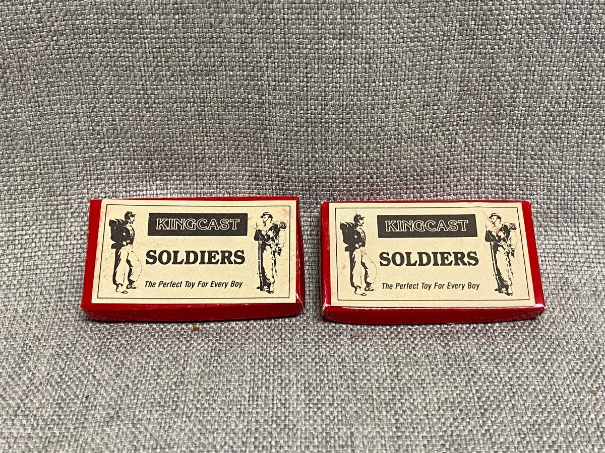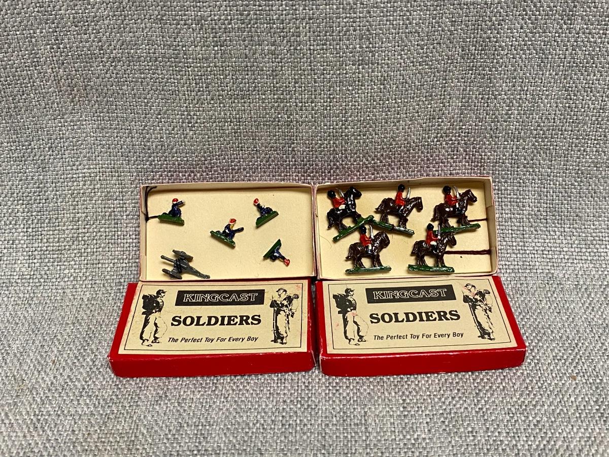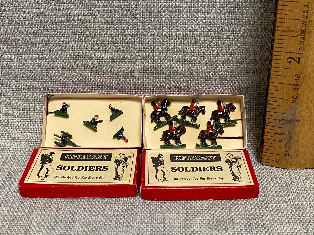 Vintage dollhouse miniatures Kingcast Soldier Set. Two boxes, one with soldiers on horseback, the other a cannon and ground soldiers. Under 1/4" size each. Painted nicely.