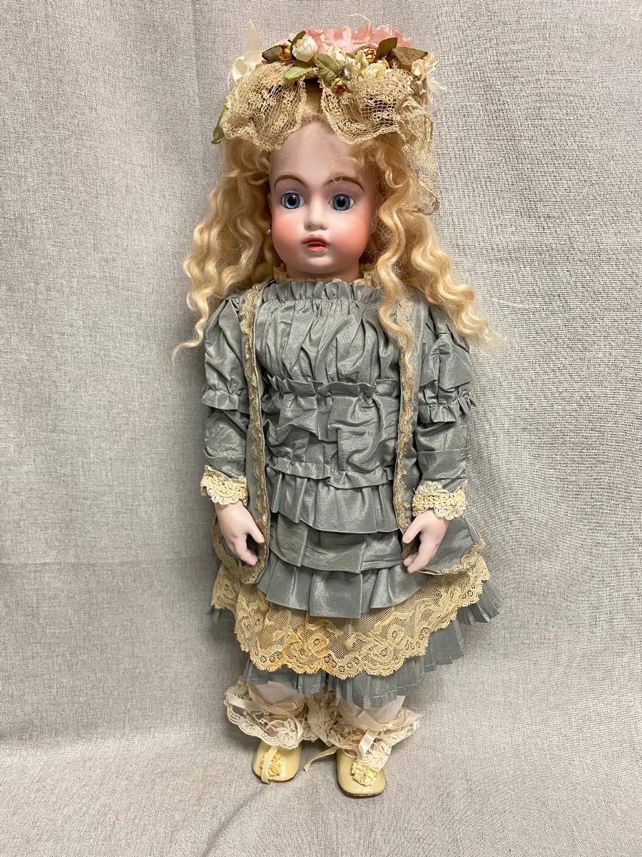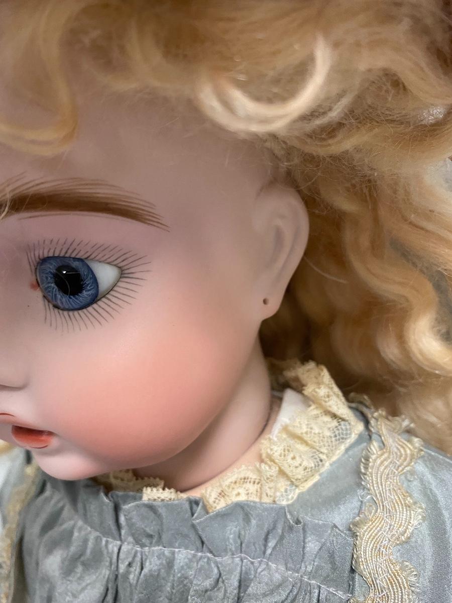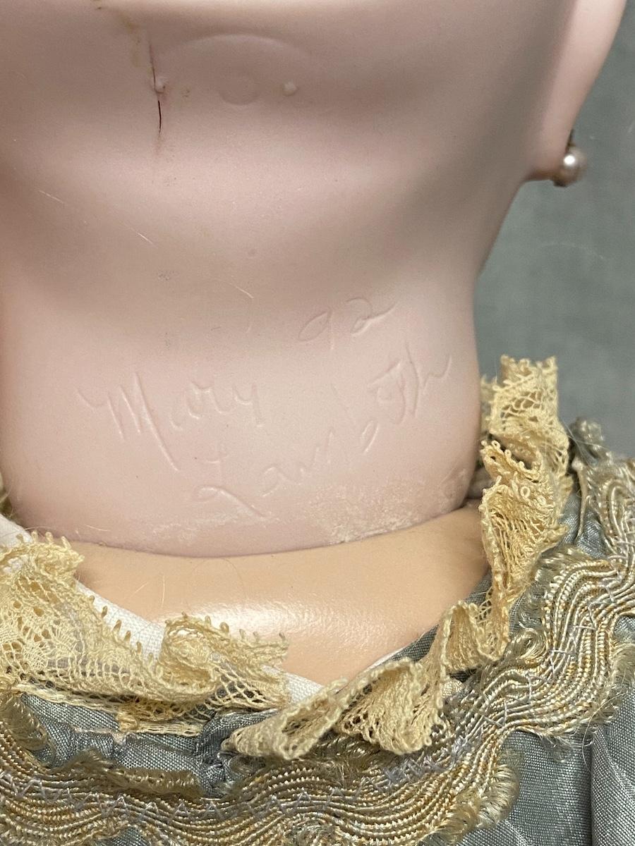 1992 Mary Lambeth bisque and composite doll. Dressed in a Victorian styled outfit. About 24" tall. Beautiful face. Fixed eyes. Body is composite except forearms and hands are porcelain.