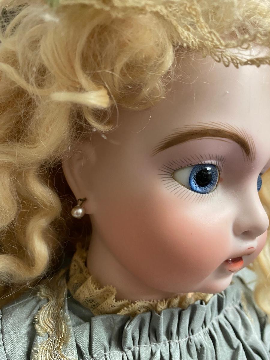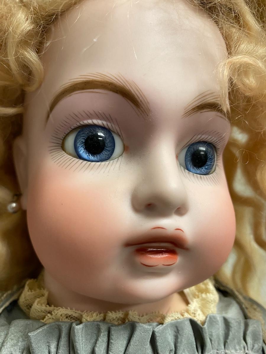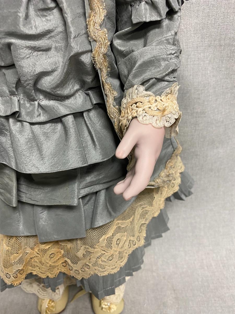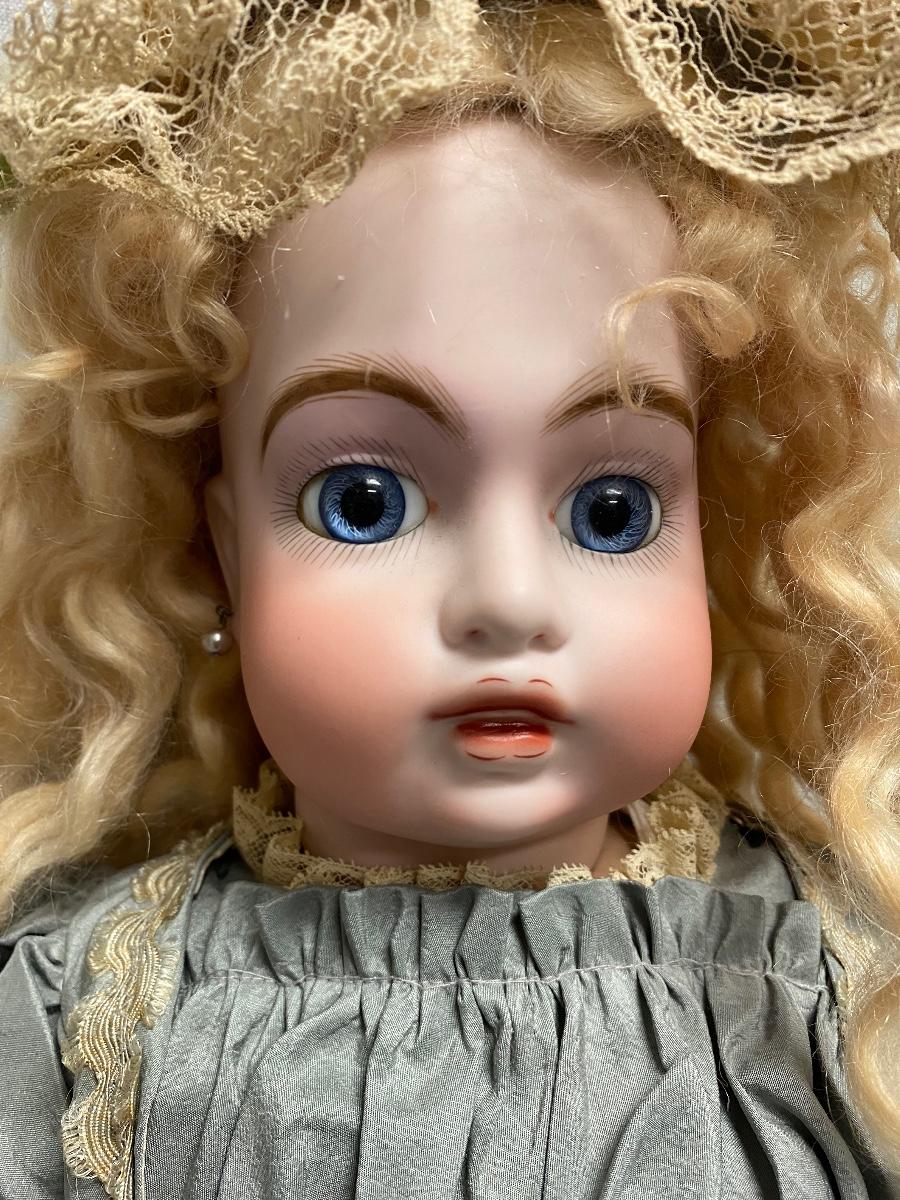 1992 Mary Lambeth bisque and composite doll. Dressed in a Victorian styled outfit. About 24" tall. Beautiful face. Fixed eyes. Body is composite except forearms and hands are porcelain.