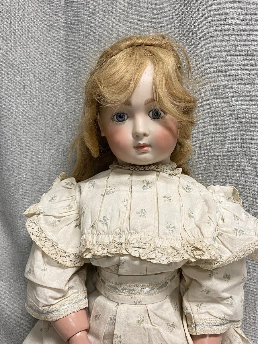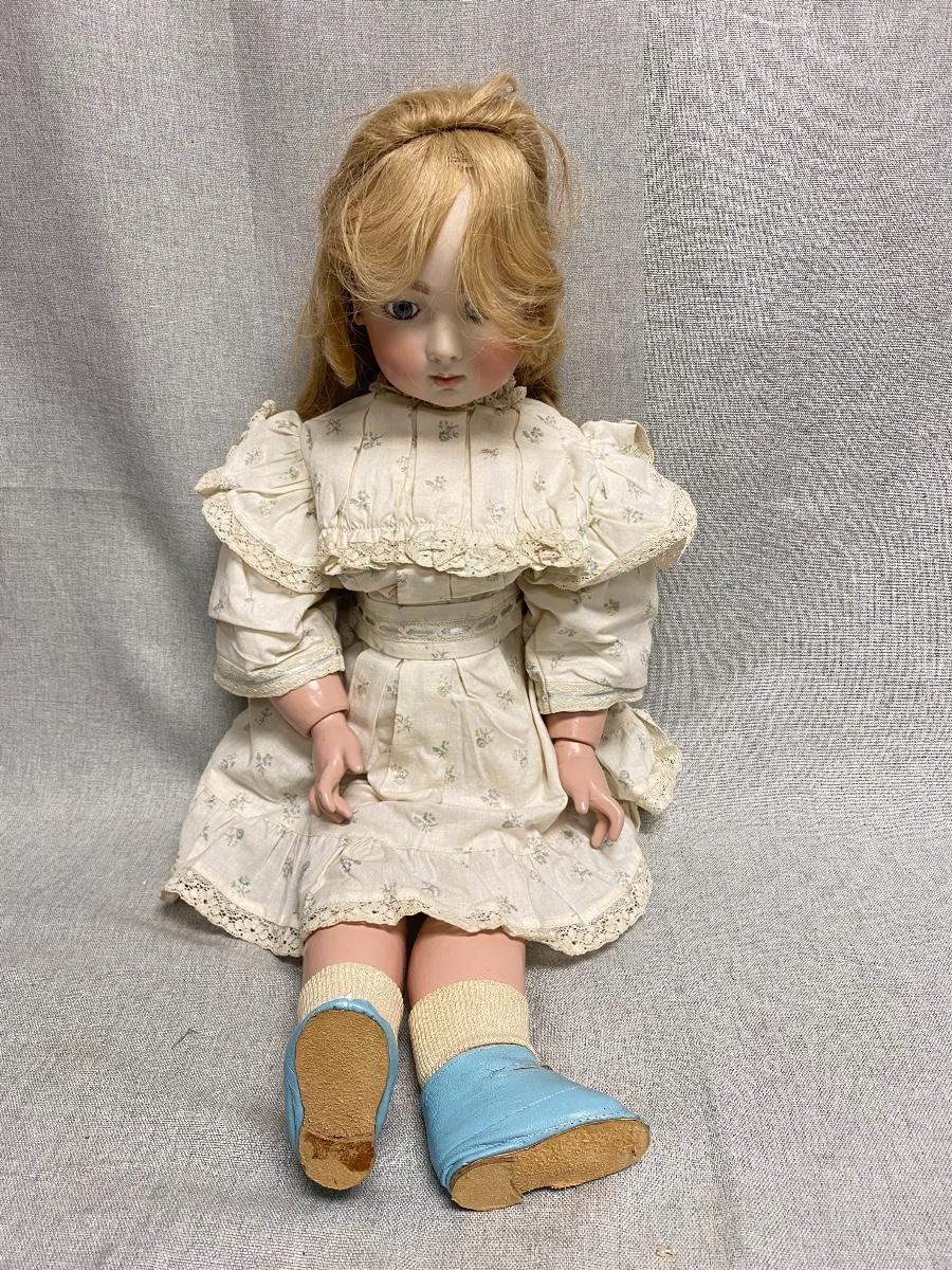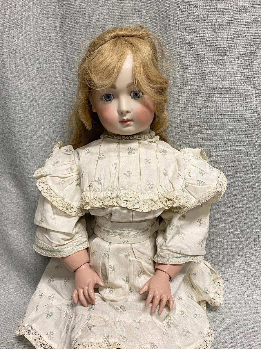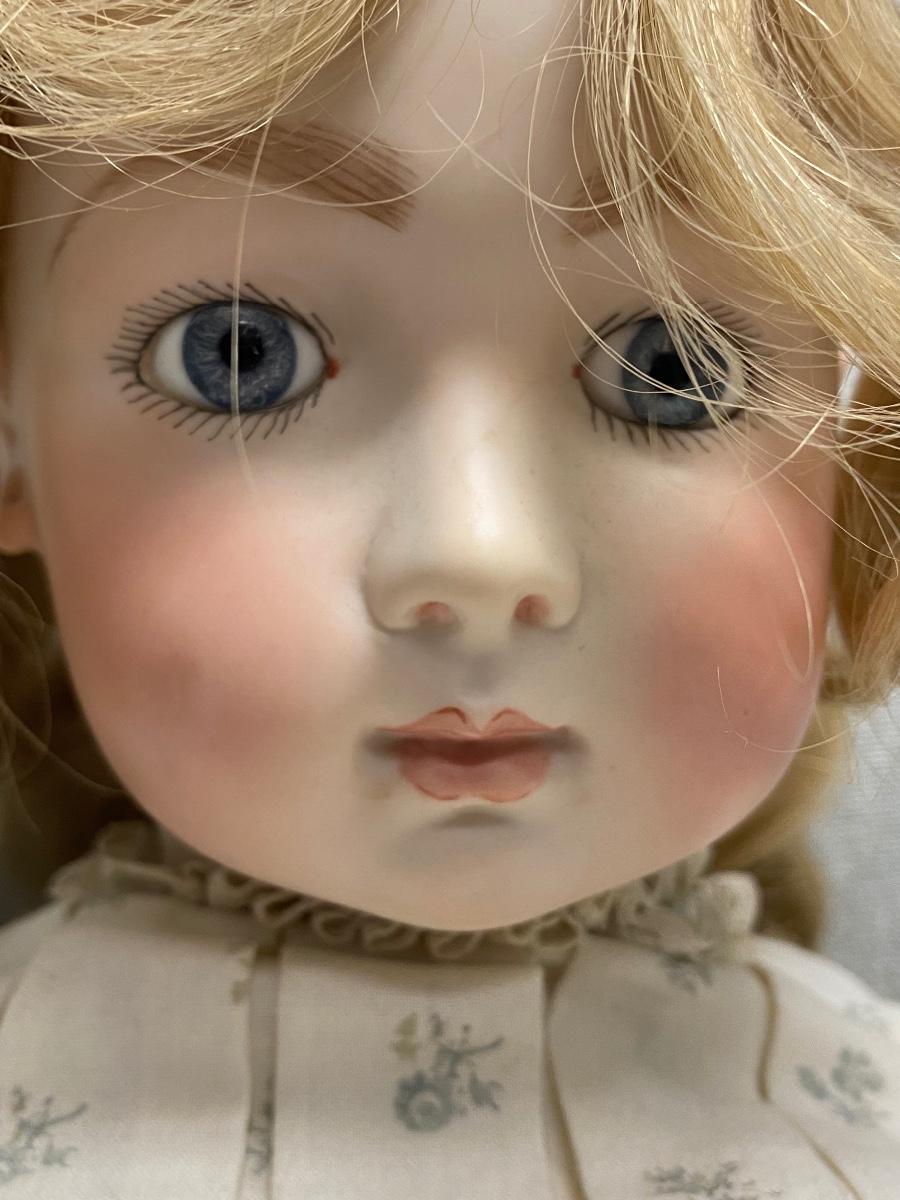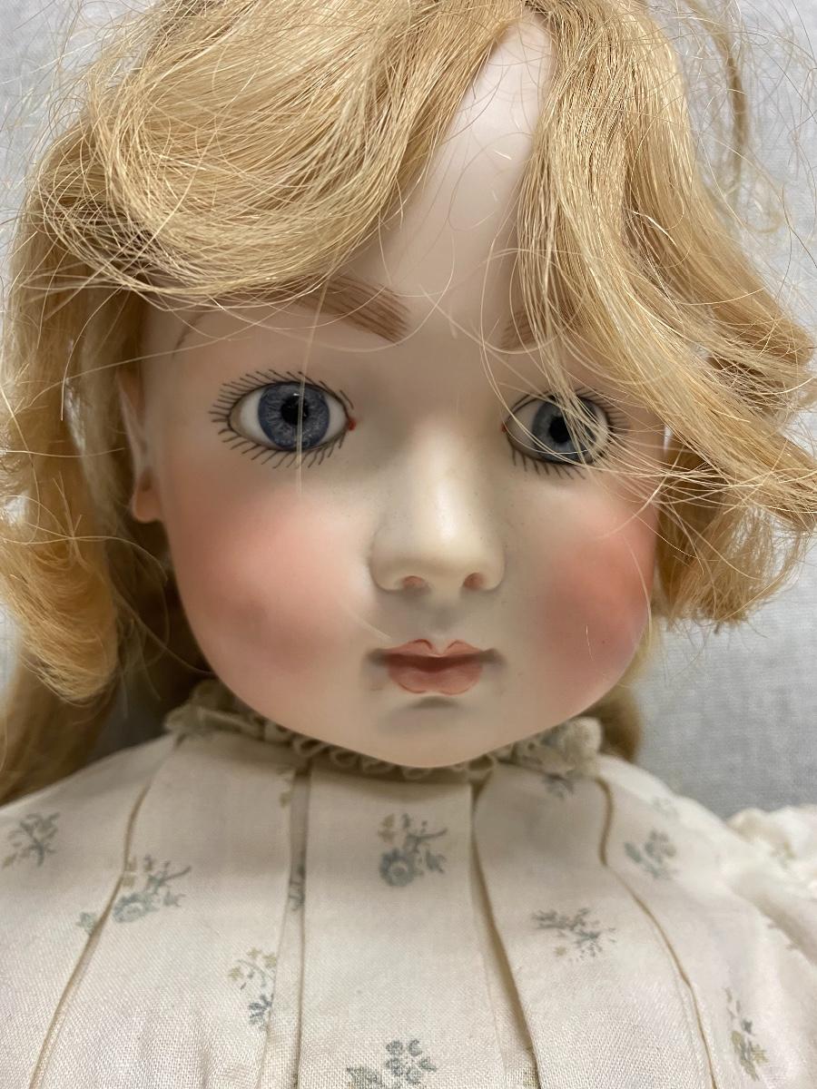 Pale bisque and composite Marian Mosser repro doll. Pale face with rosy cheeks, blond wig, fixed eyes. About 24" size. Good condition.
