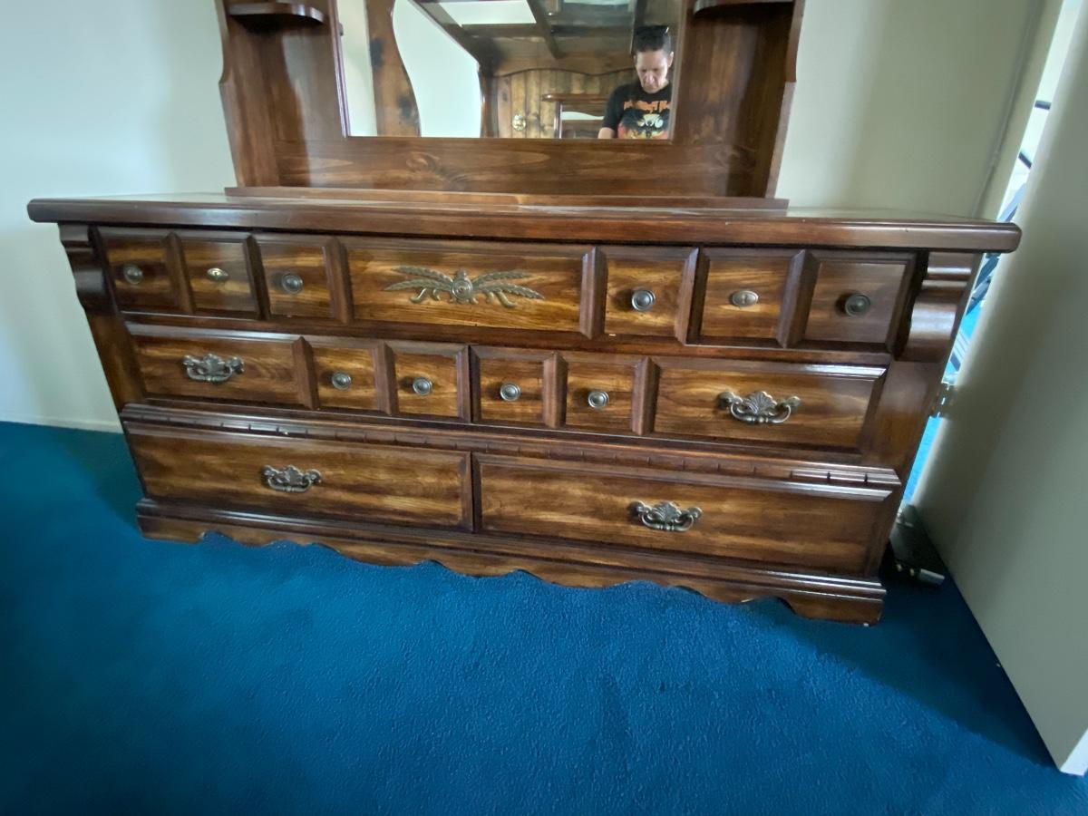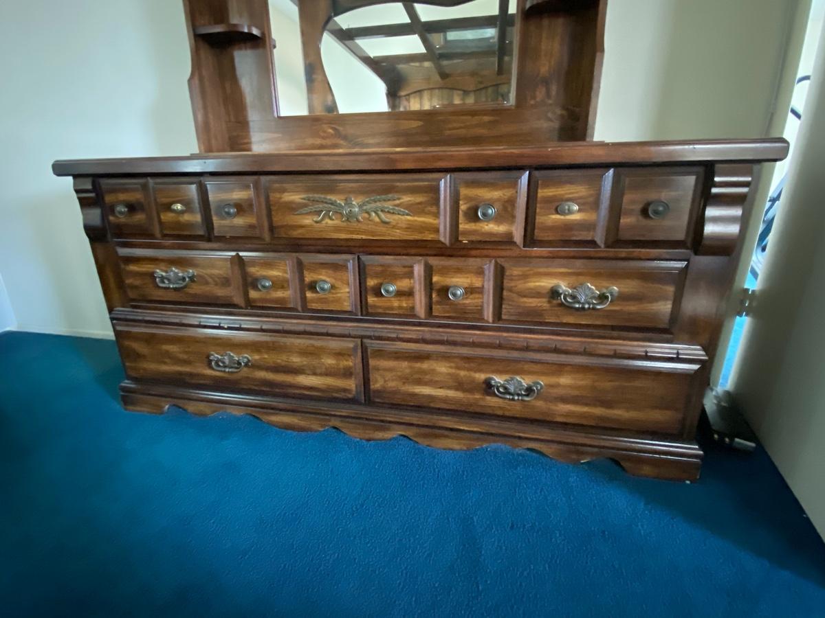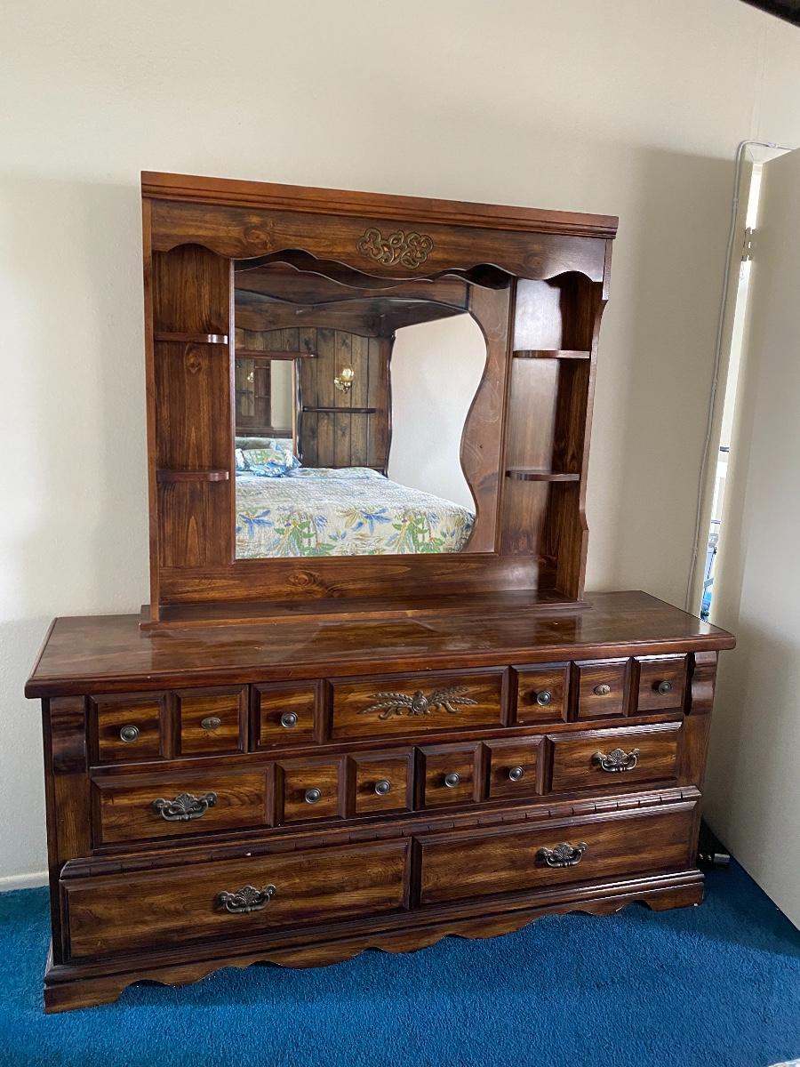 Vintage Dark Wood Dresser with Mirror. In good condition. Measures about 66" across.