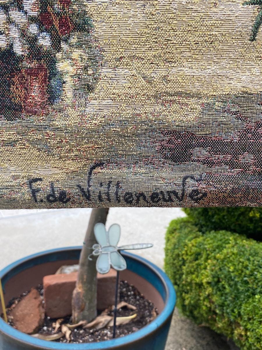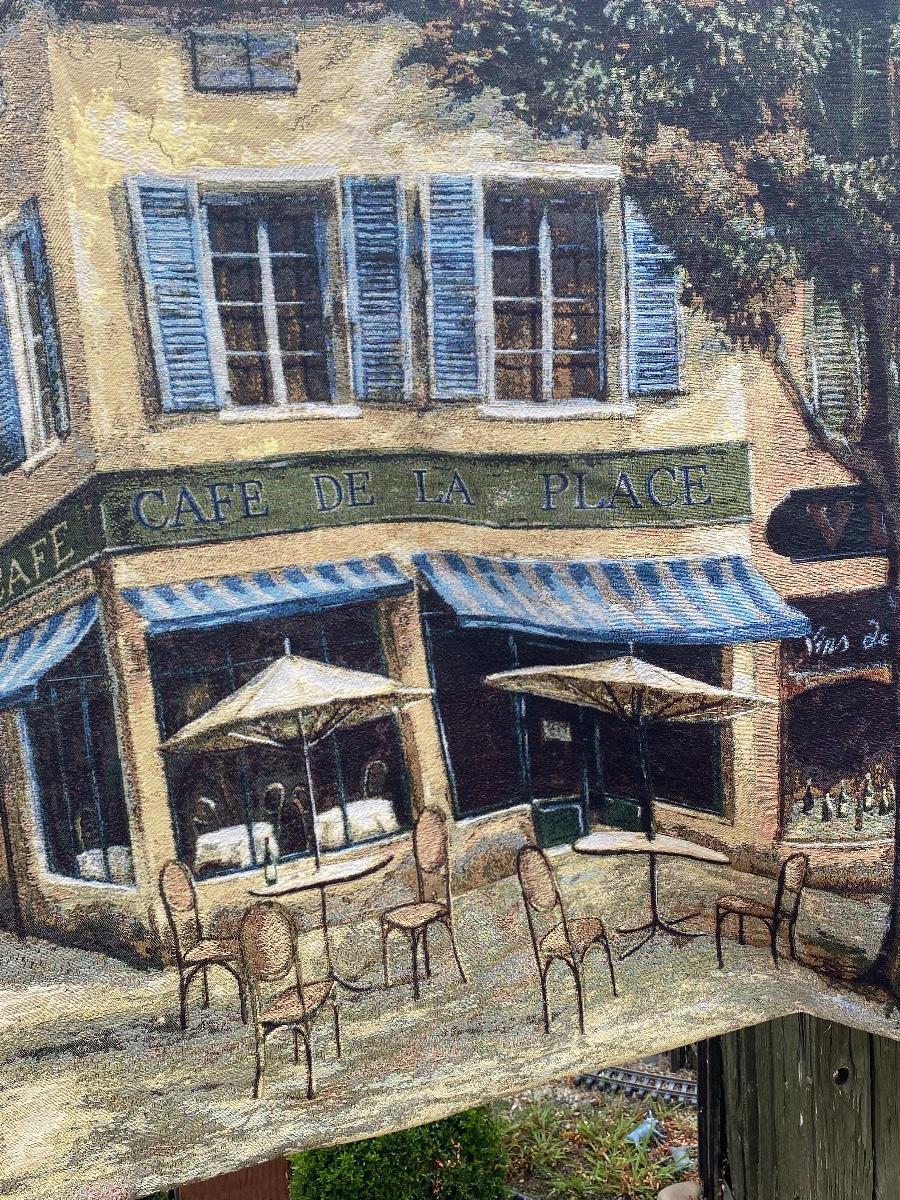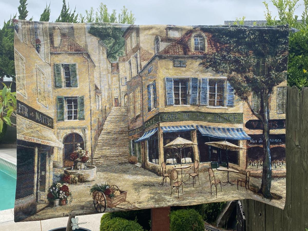 Large French Town Wall Hanging Tapestry Art. Newer. Comes with rod for hanging. About 5' length. A little dusty.
