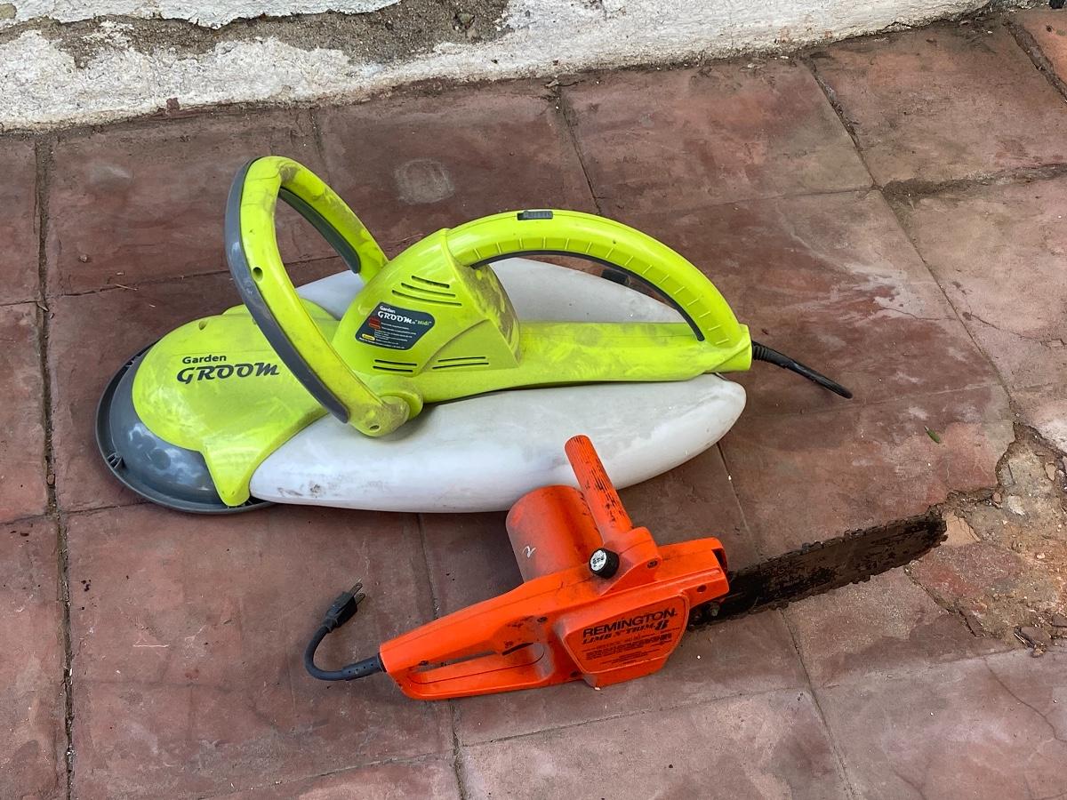 Remington Limb N Trim electric chainsaw & Garden Groom Midi electric hedger, there is some use and wear on both of these machines. Untested.