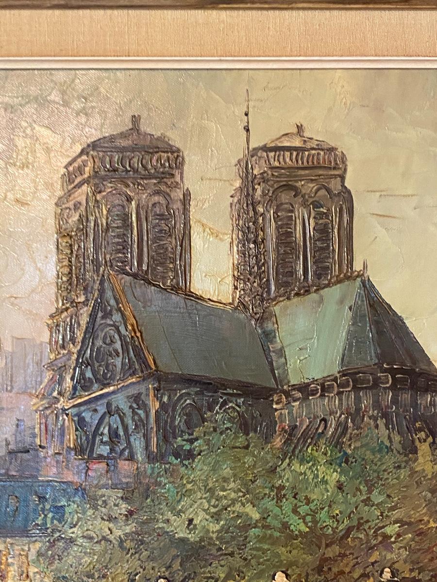 Wonderfully done painting of French cityscape with Norte Dame in background. Framed. Signed by artist. W. Mann. About 38"x31" size.