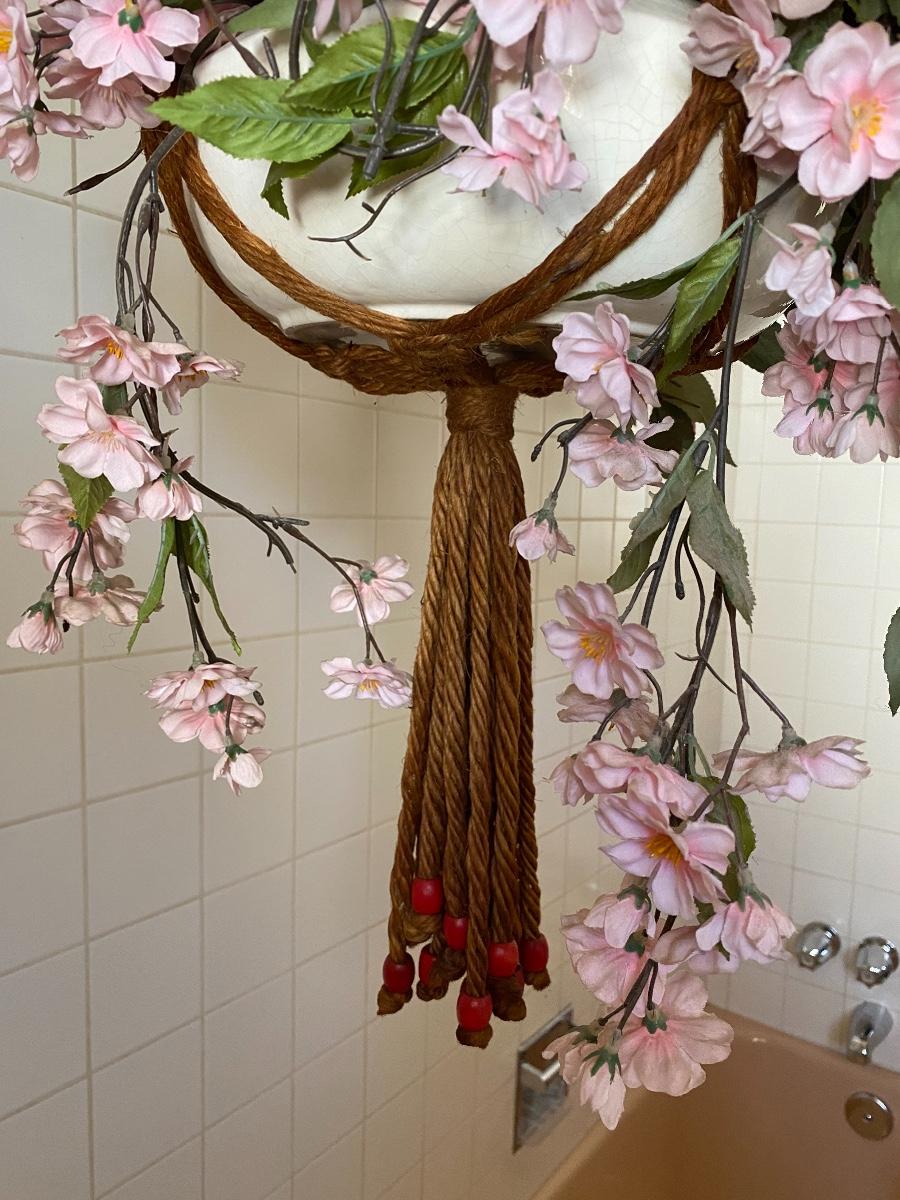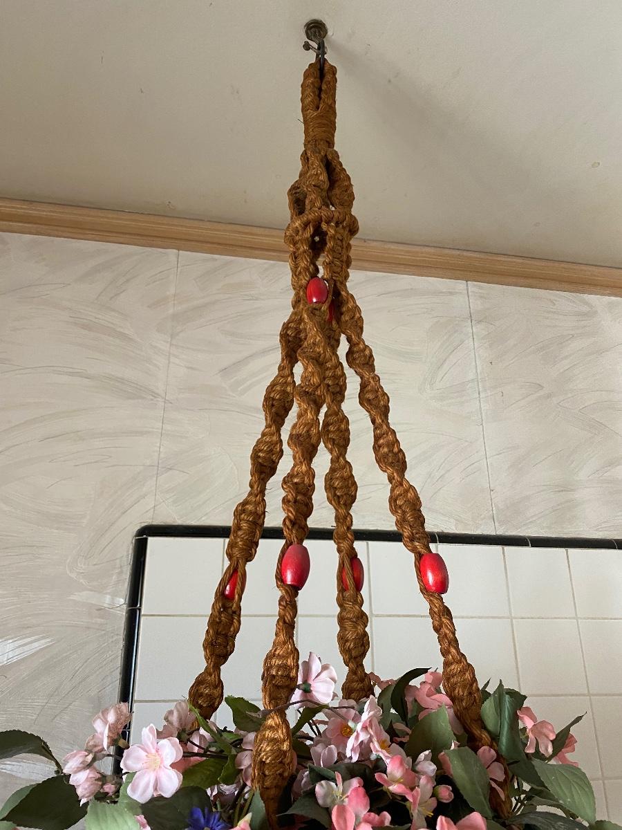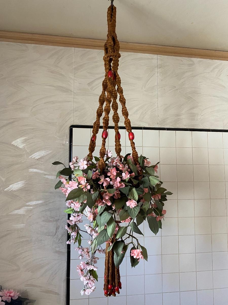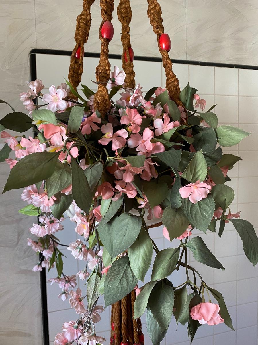 Hanging Artificial Faux Flowering Plant. Pale pink flowers. Dusty but good condition.
