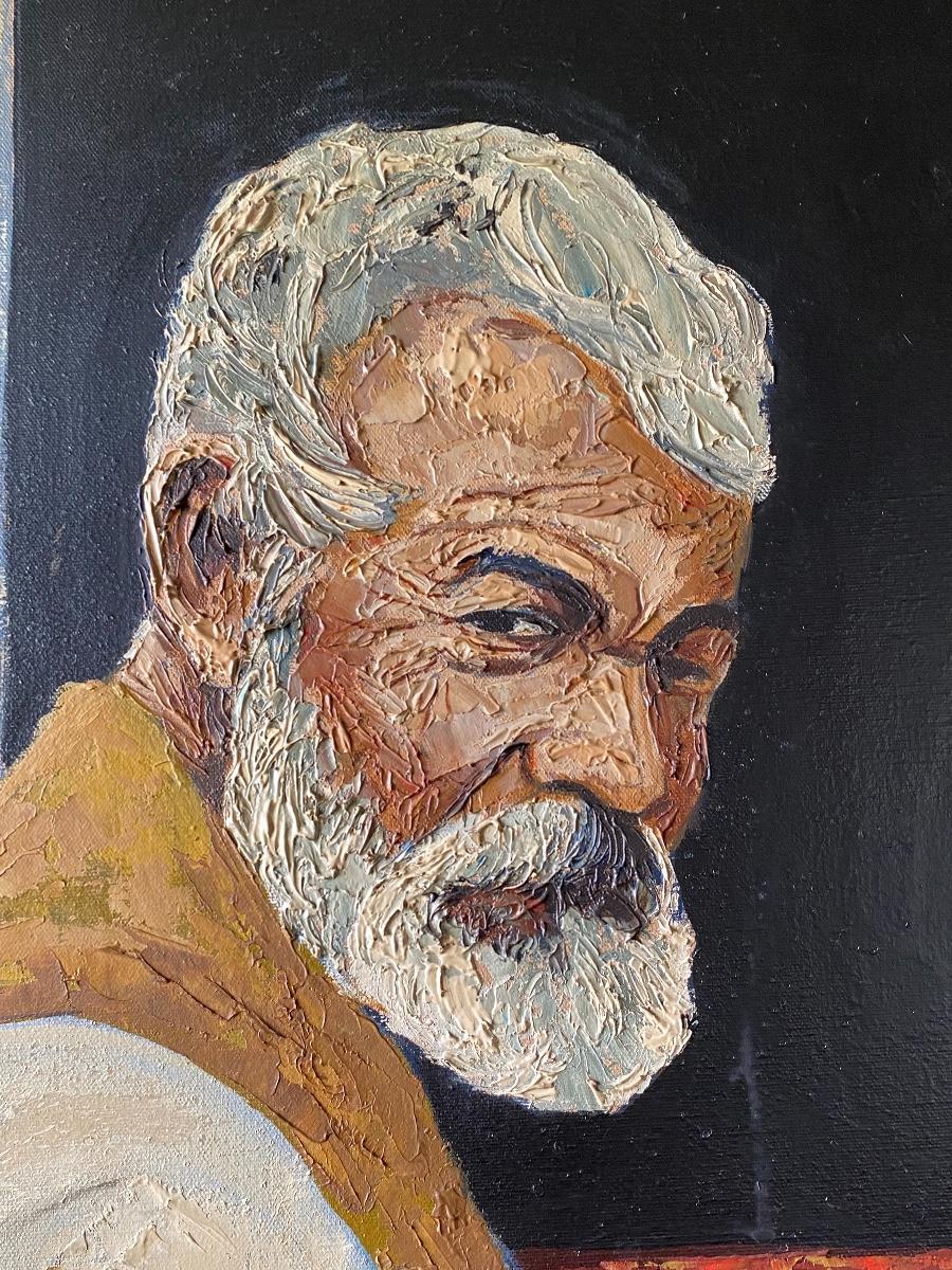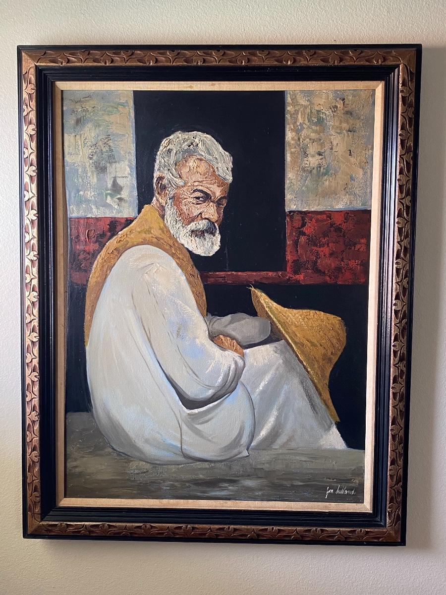 Vintage Spanish Man Sitting Painting by Jon Helland. Measures about 3' by 4'. In good condition