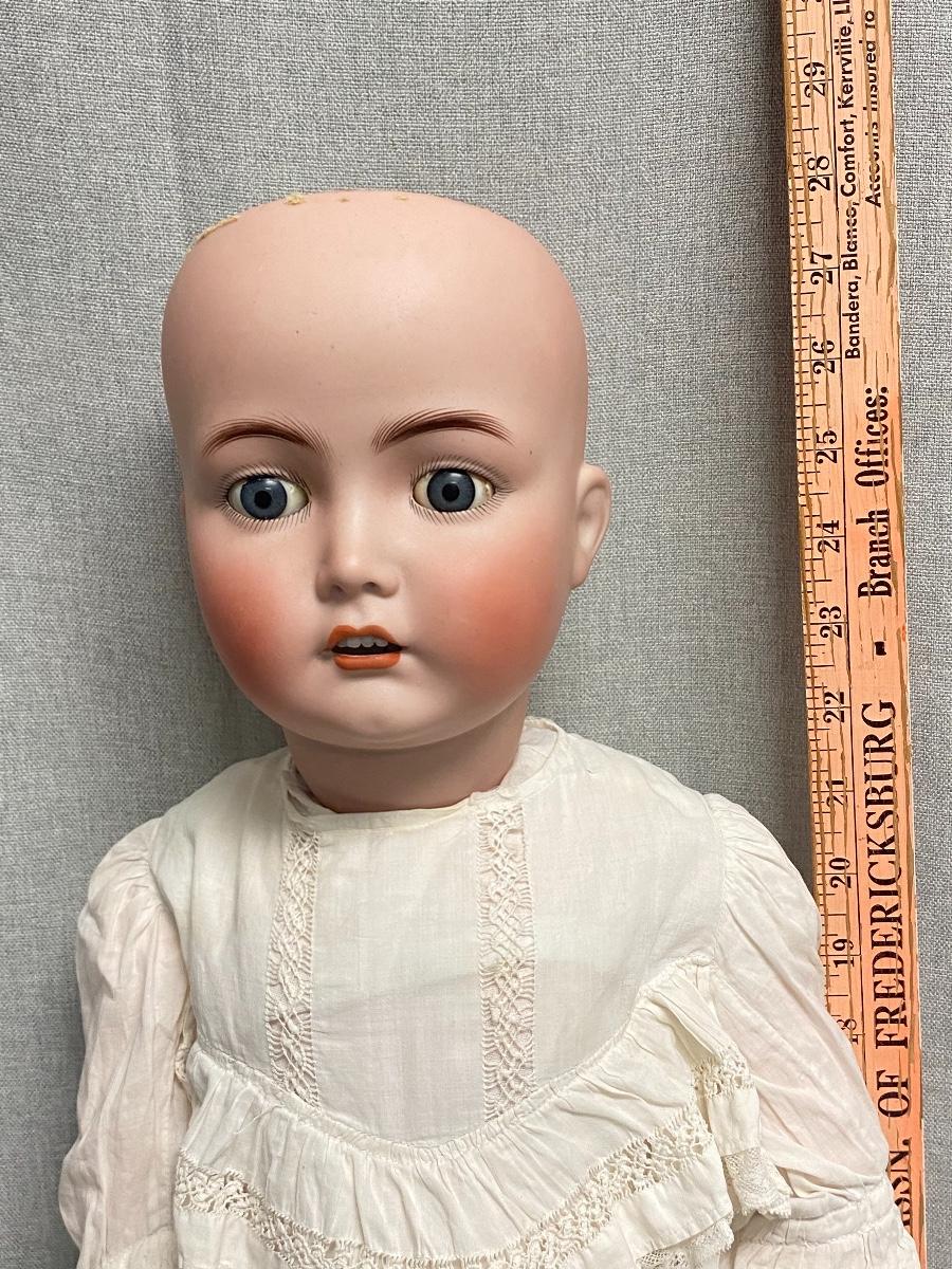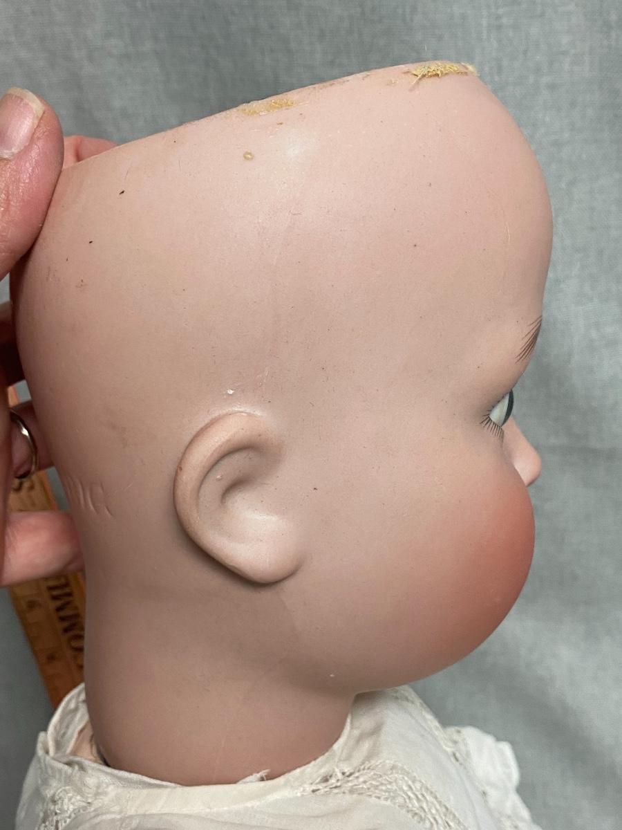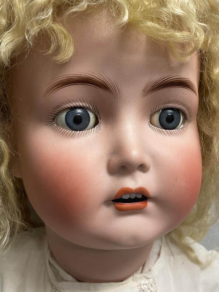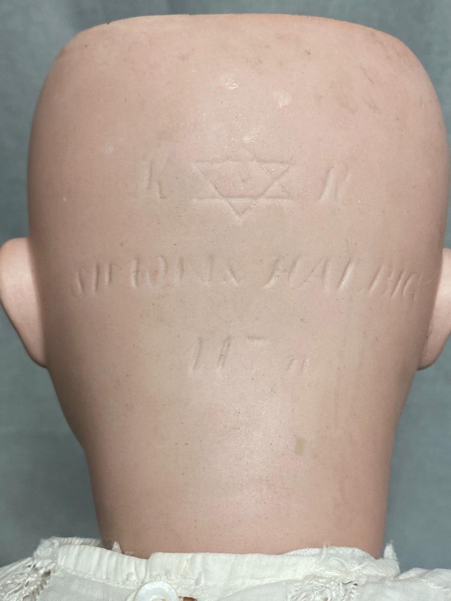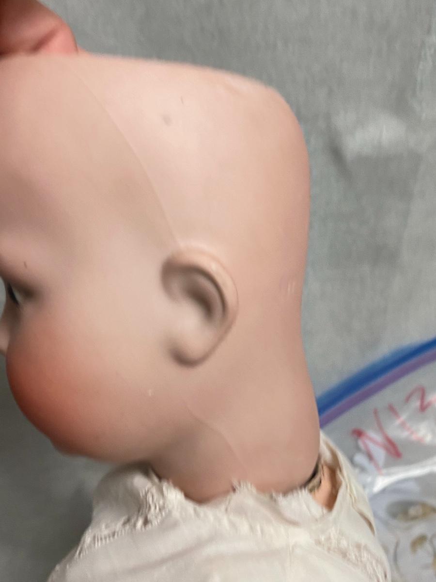 Cute chubby cheek K⭐R Simon & Halbig girl doll. Open mouth, dimple chin. She has blue sleepy eyes and blonde mohair wig. Back of head is marked. In good condition but you can see the seam on the side of the head, one side more then the other. Some wear to the composite as you would see with age. About 27" size.
