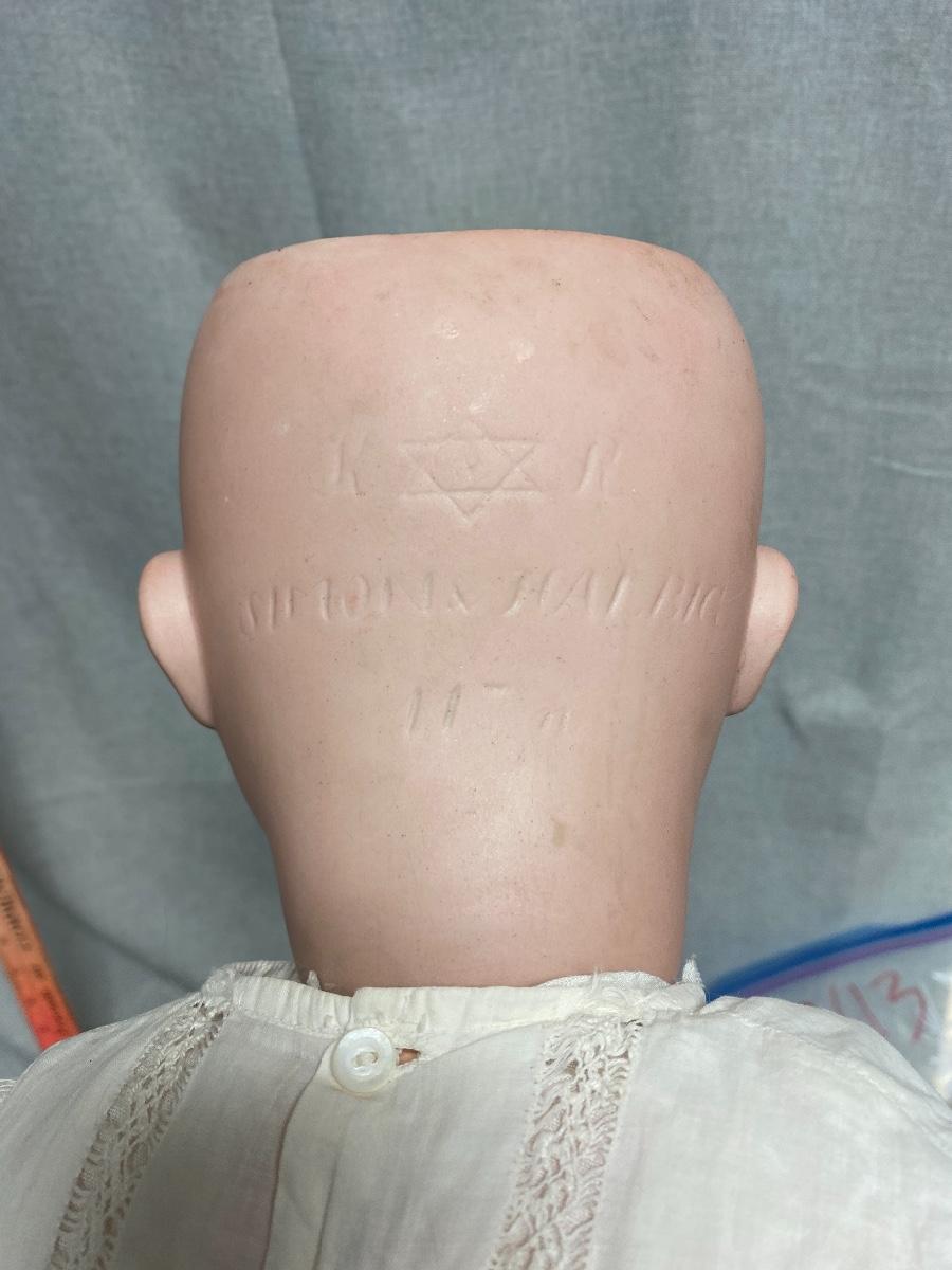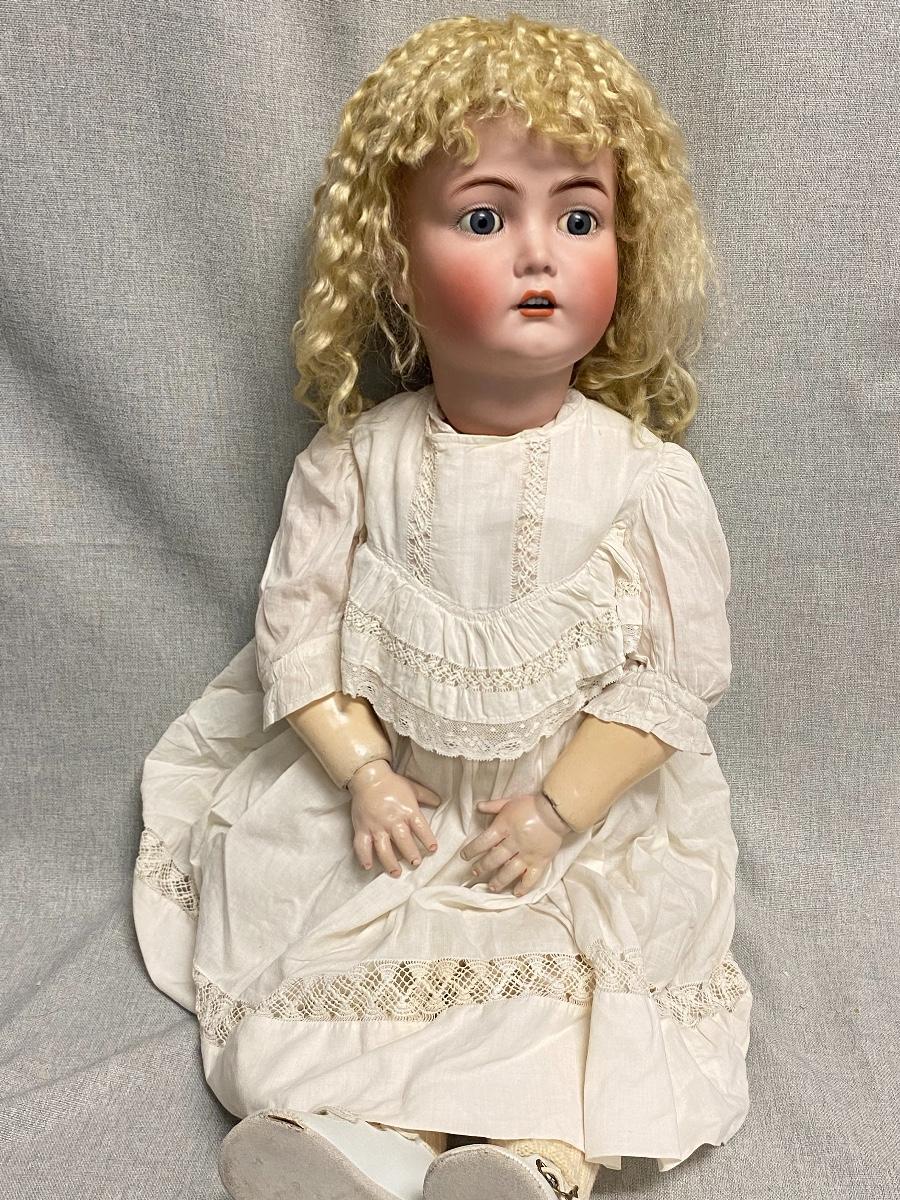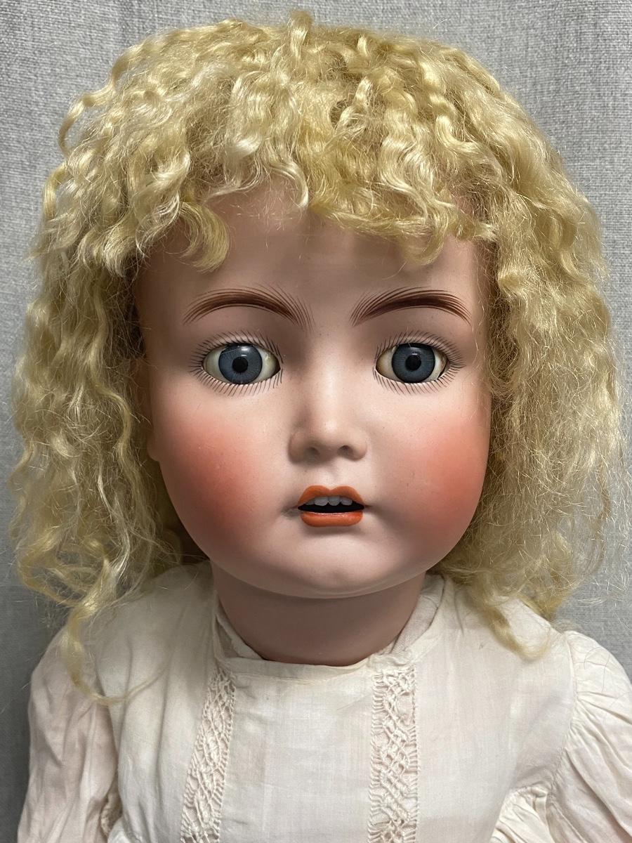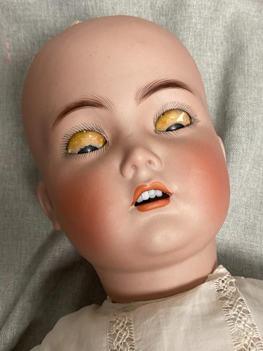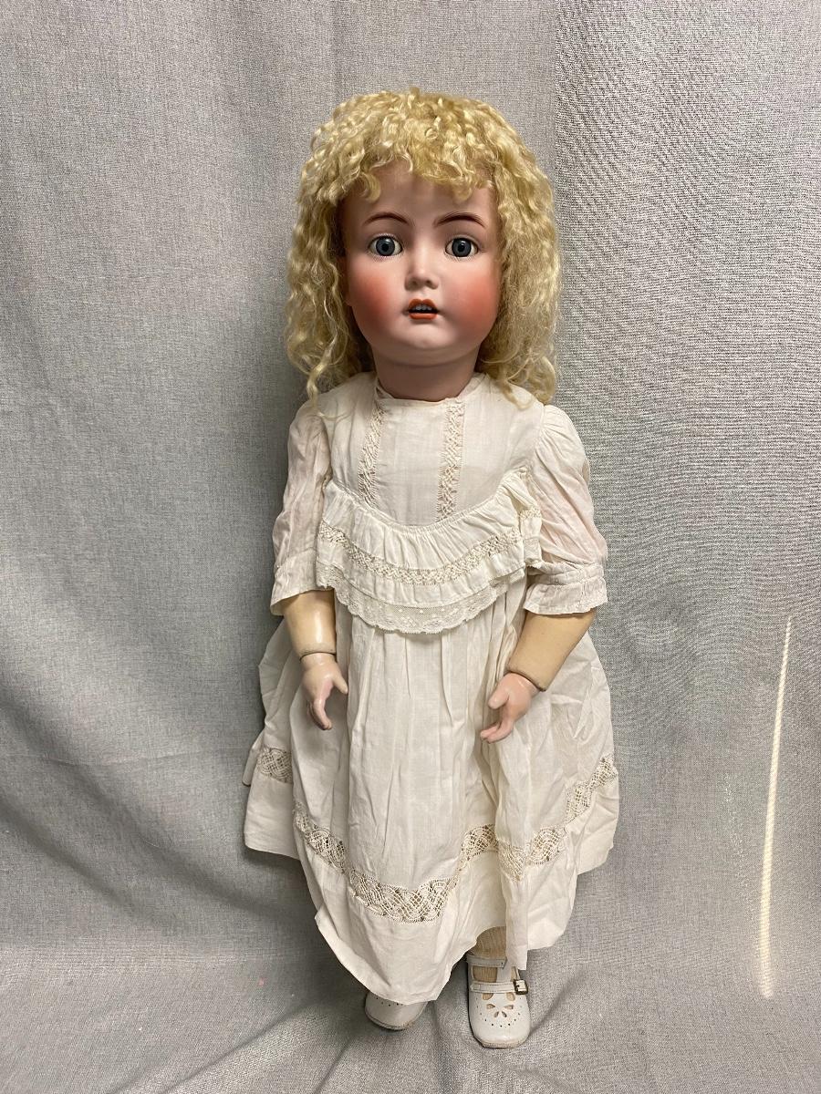 Cute chubby cheek K⭐R Simon & Halbig girl doll. Open mouth, dimple chin. She has blue sleepy eyes and blonde mohair wig. Back of head is marked. In good condition but you can see the seam on the side of the head, one side more then the other. Some wear to the composite as you would see with age. About 27" size.
