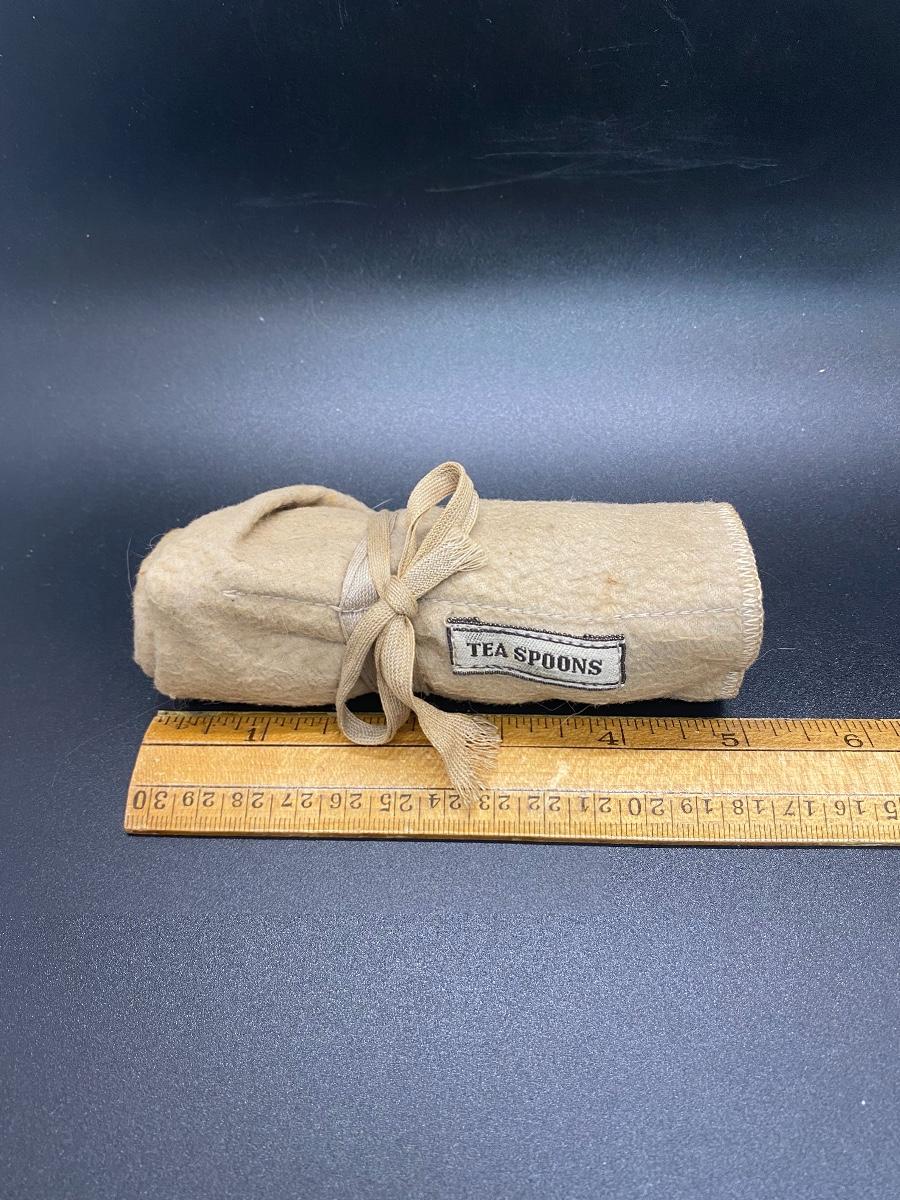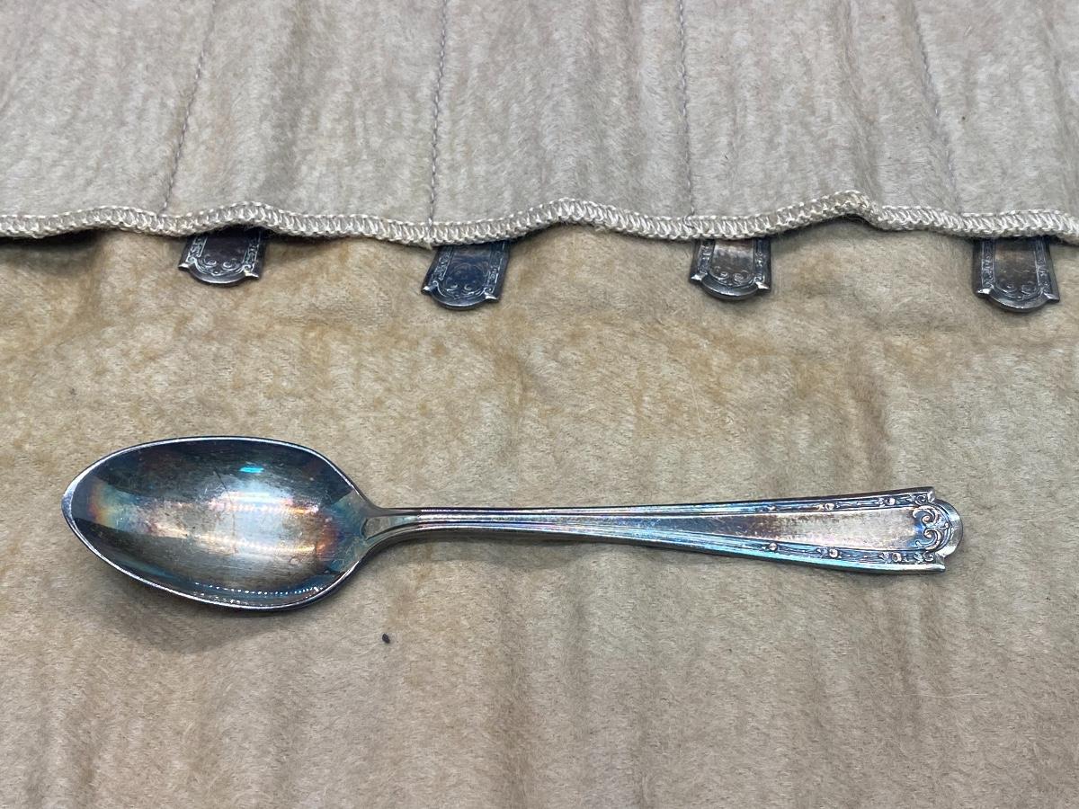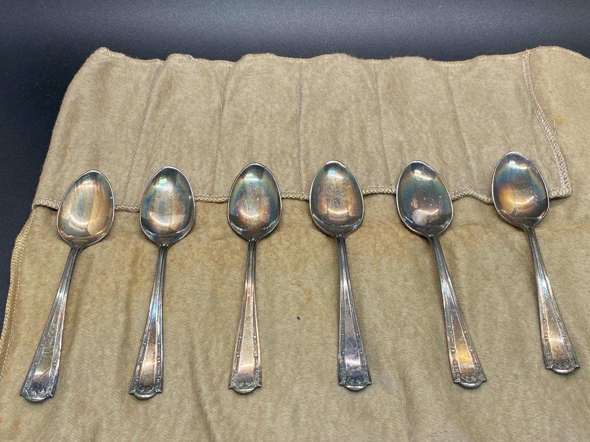 Set of 6 Vintage Pattern Plated Tea Spoons with Cloth Storage. No sterling marks, look like silver plate, made by Wallace.