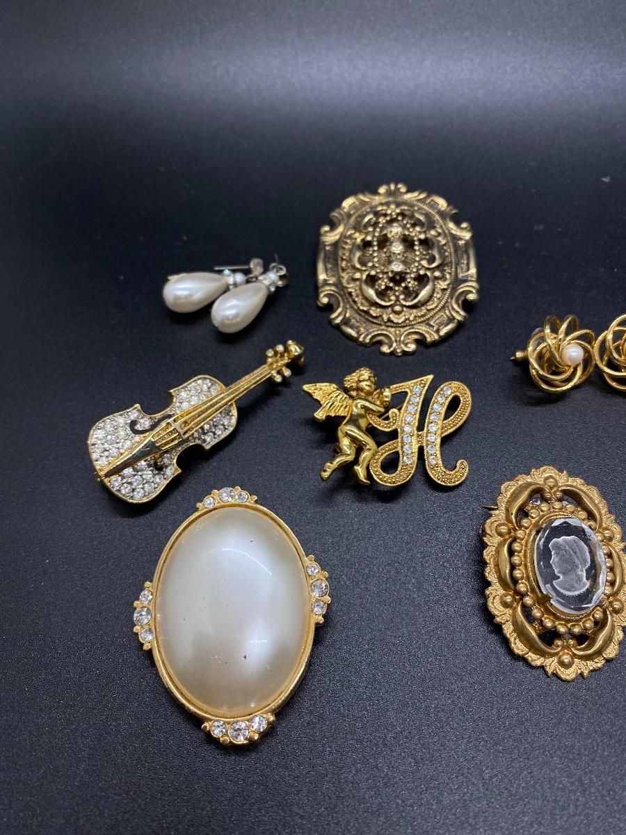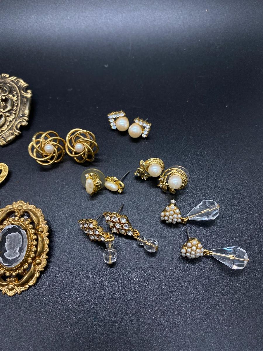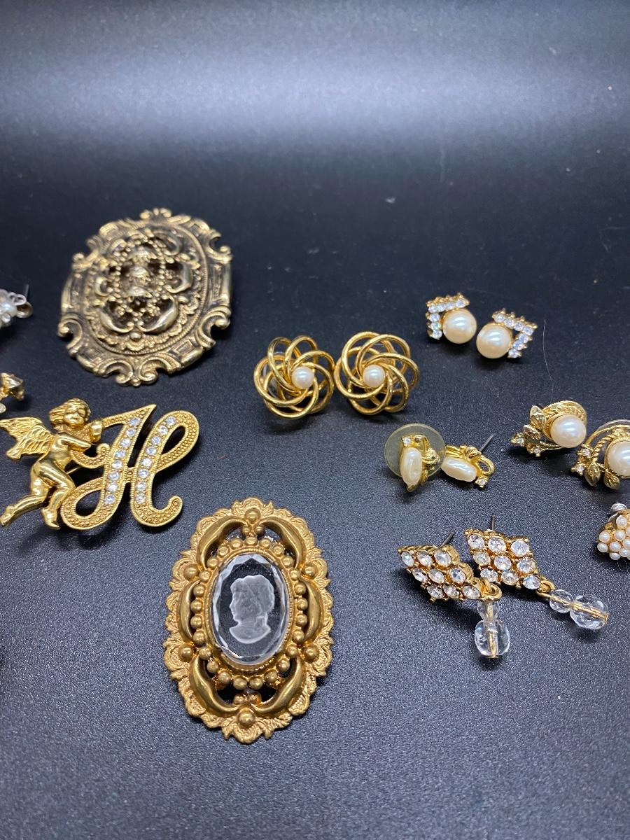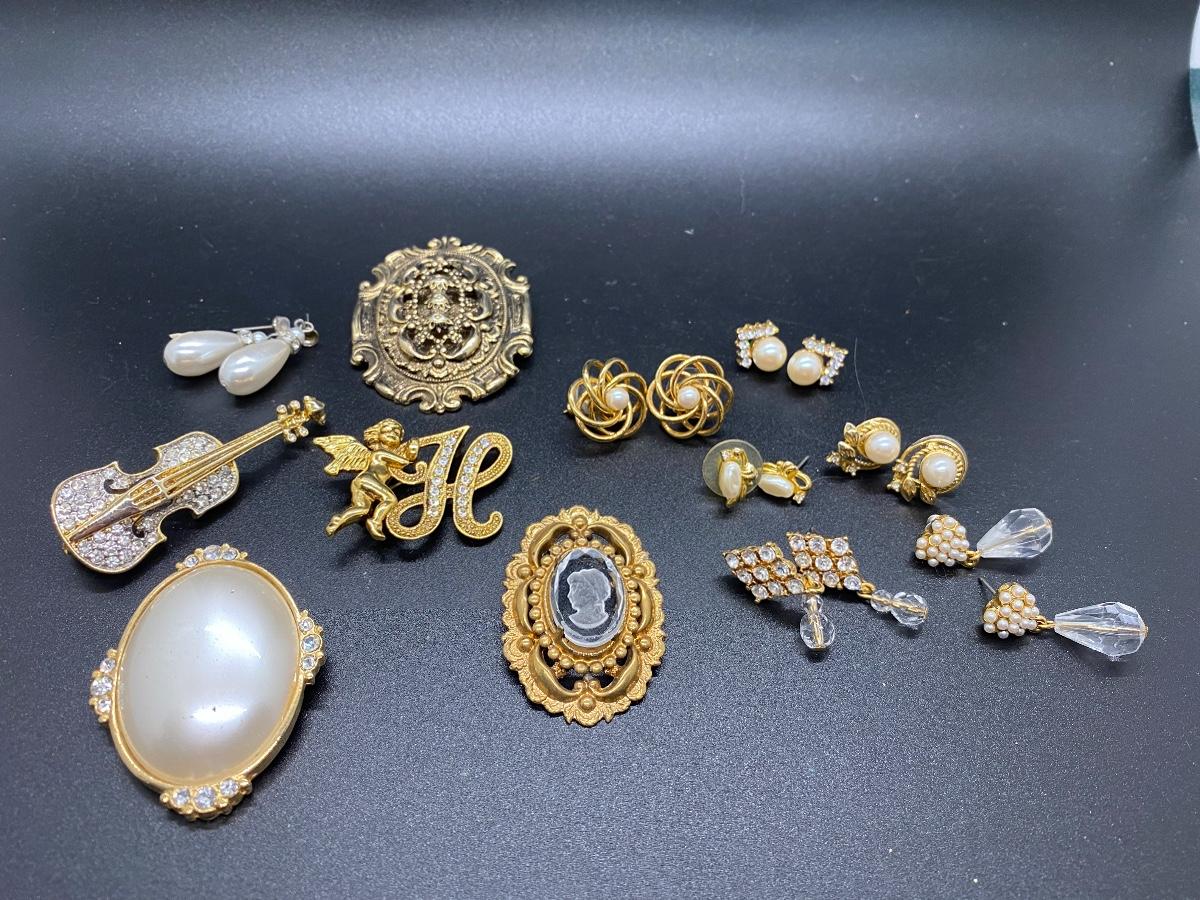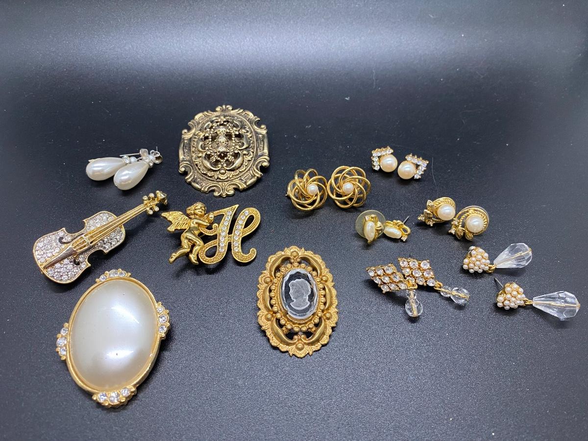 Gold Tone Pin Brooch Earring Lot - Rhinestone and Faux Pearl