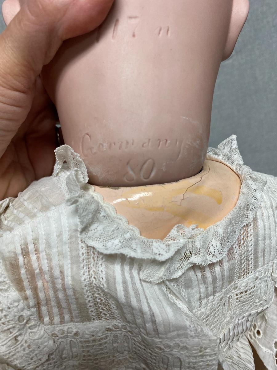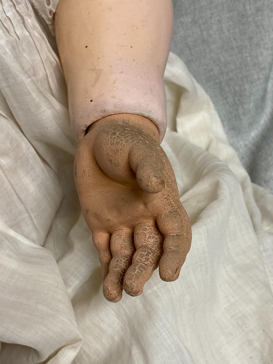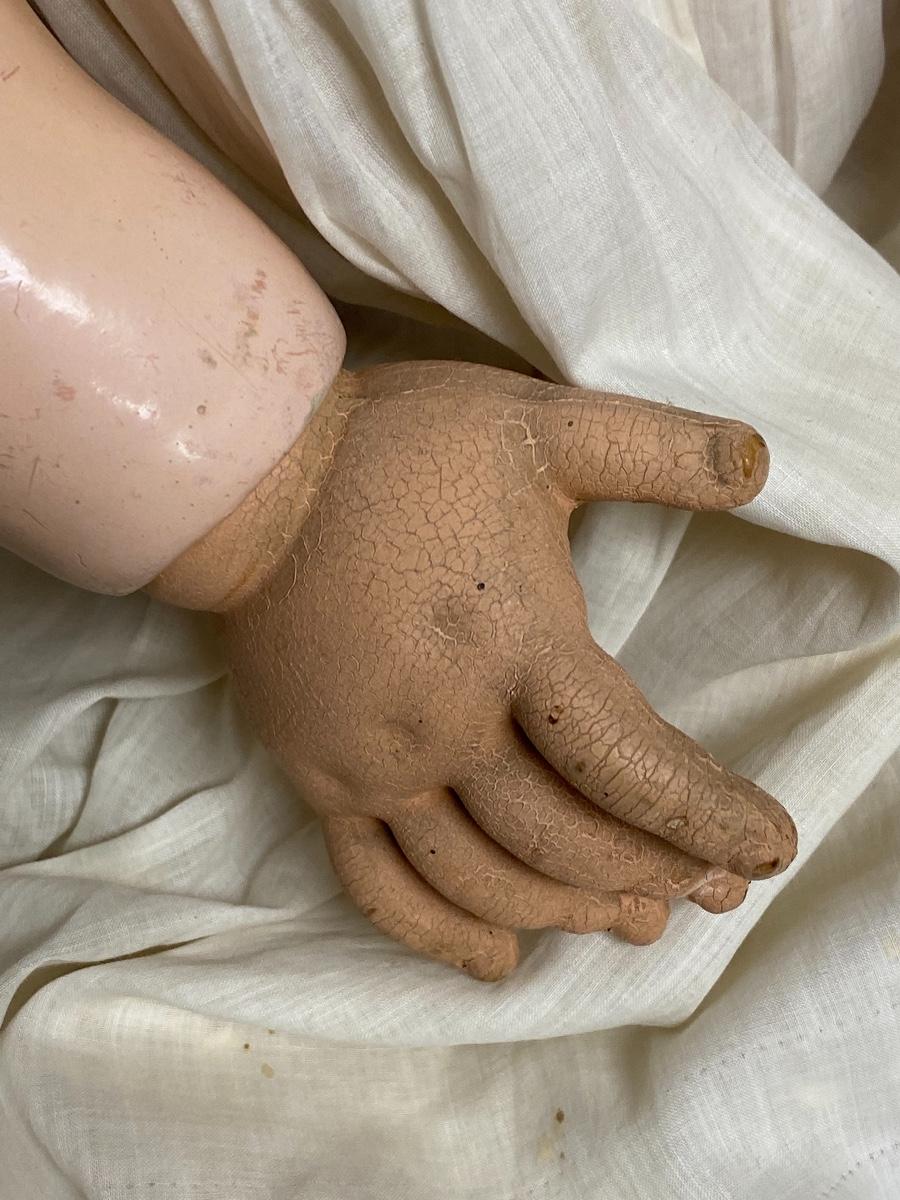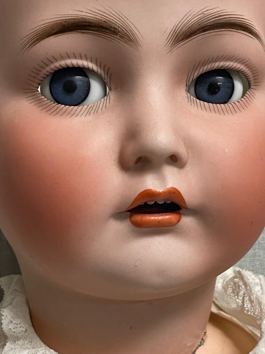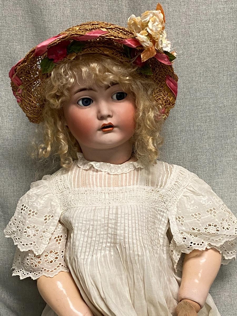 Antique K⭐R Simon & Halbig bisque and composite doll. Blue flirty eyes with lids that close. Eyes work. Head marked K⭐R Simon & Halbig 117 n Germany 80. Beautiful face. Composite has worn oddly on hands. About 31" size. Does look like a small crack near ear, not too badly.