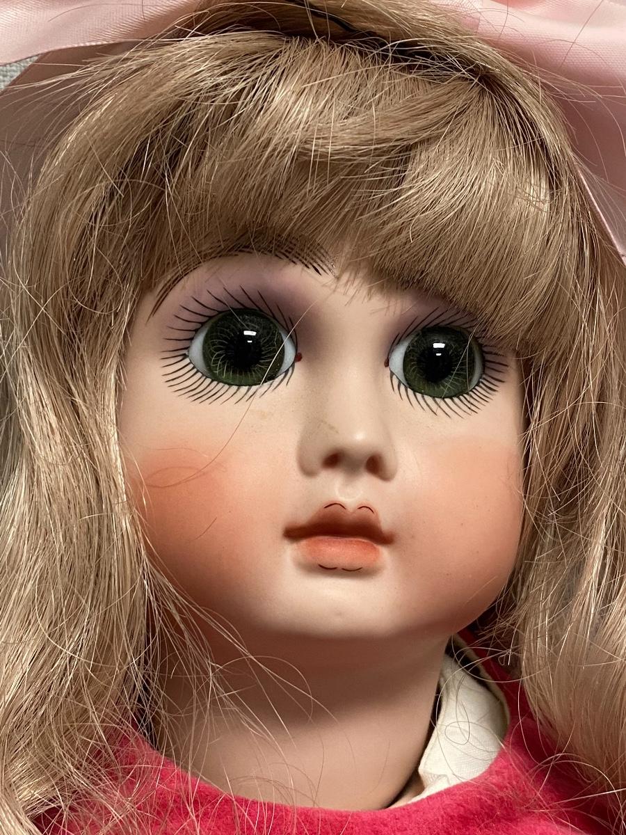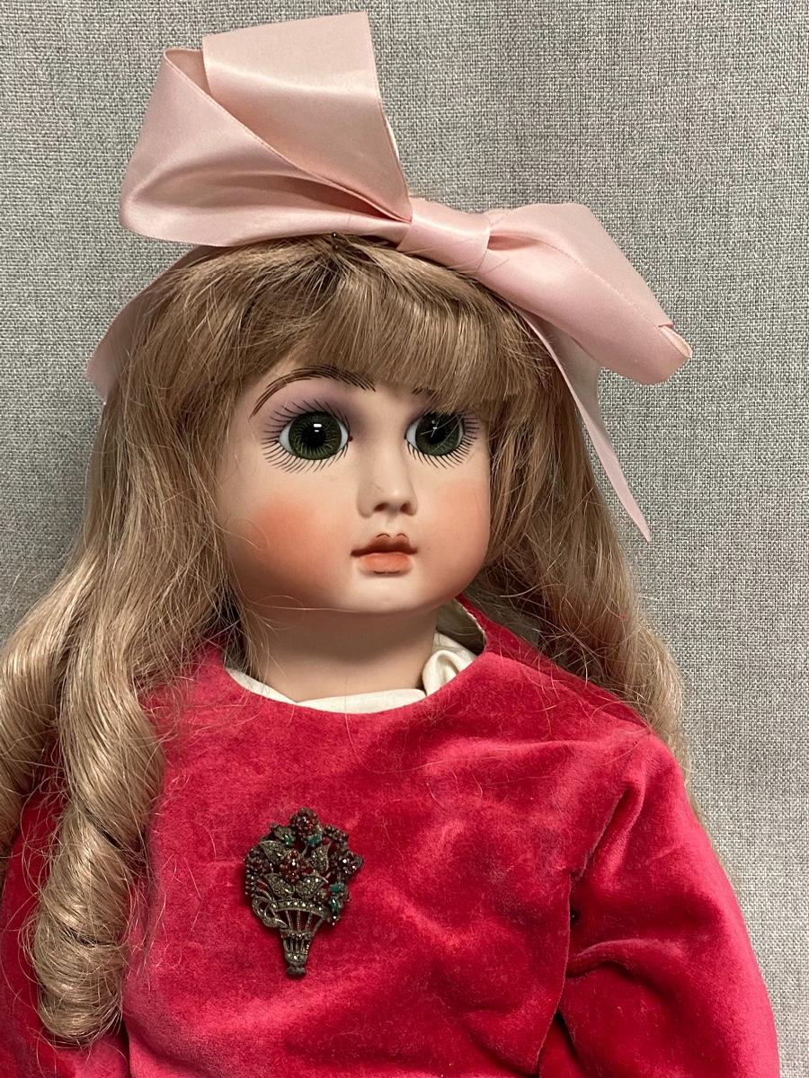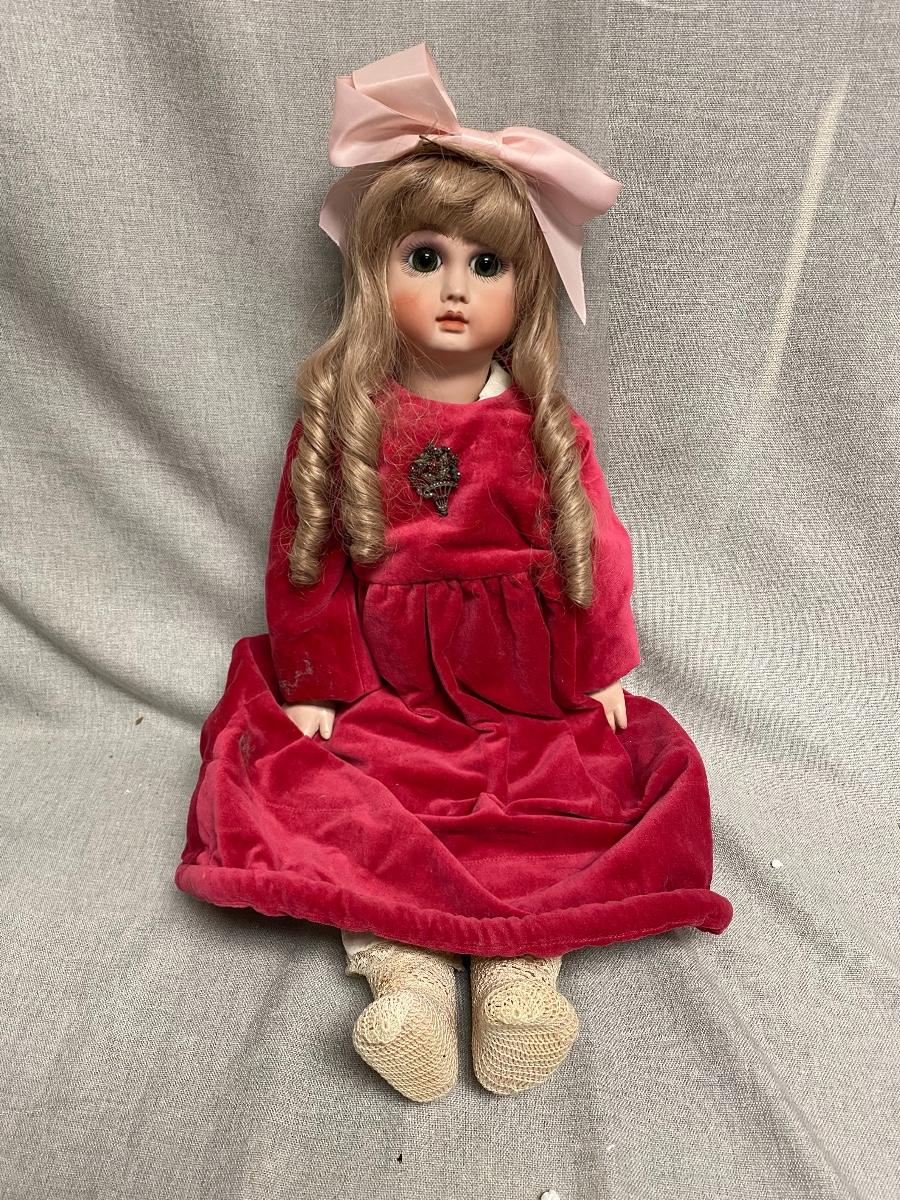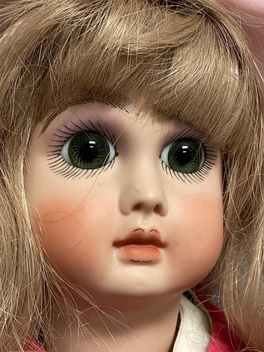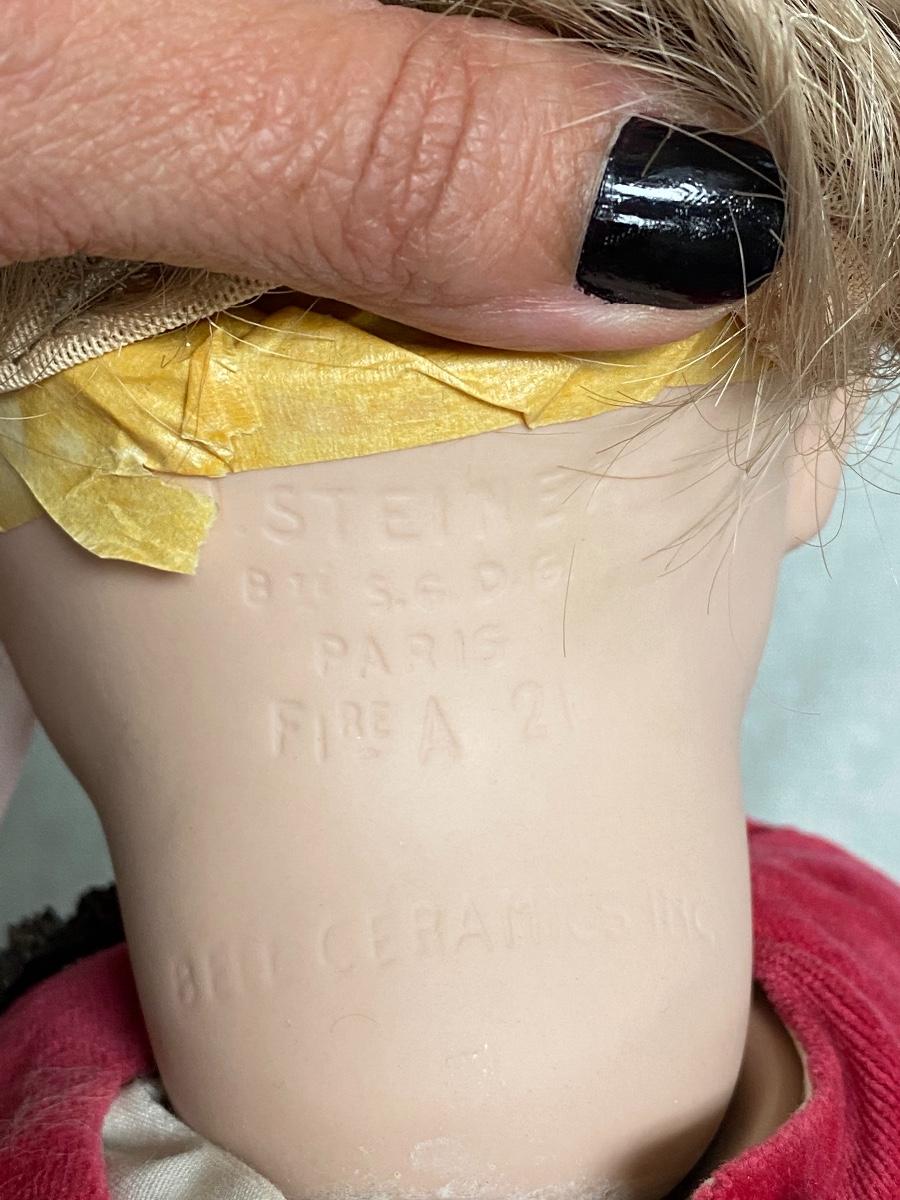 Wide eye J Steiner repro doll. Head is from Bell Ceramics. Nicely done. Large brown eyes. About 23" size. Composite in good condition.