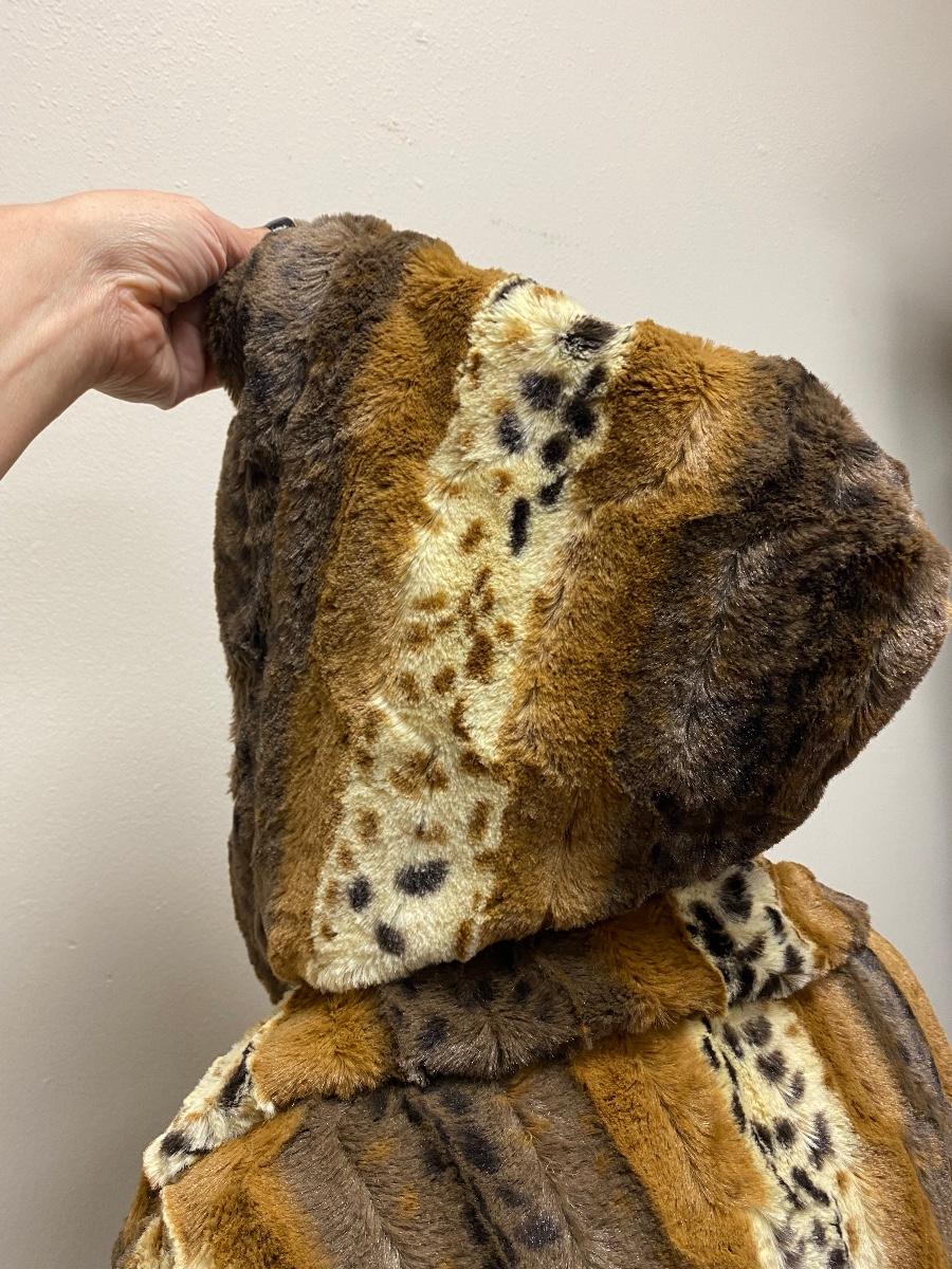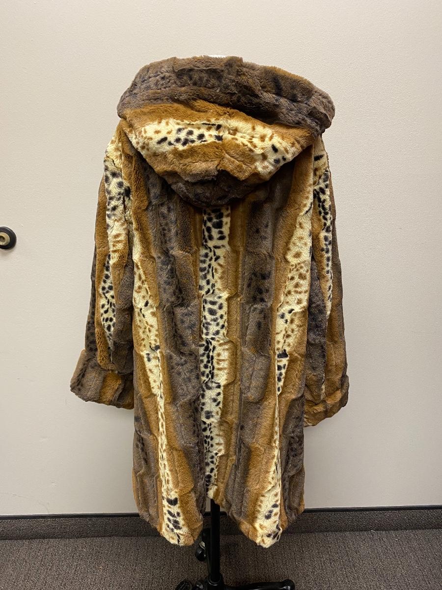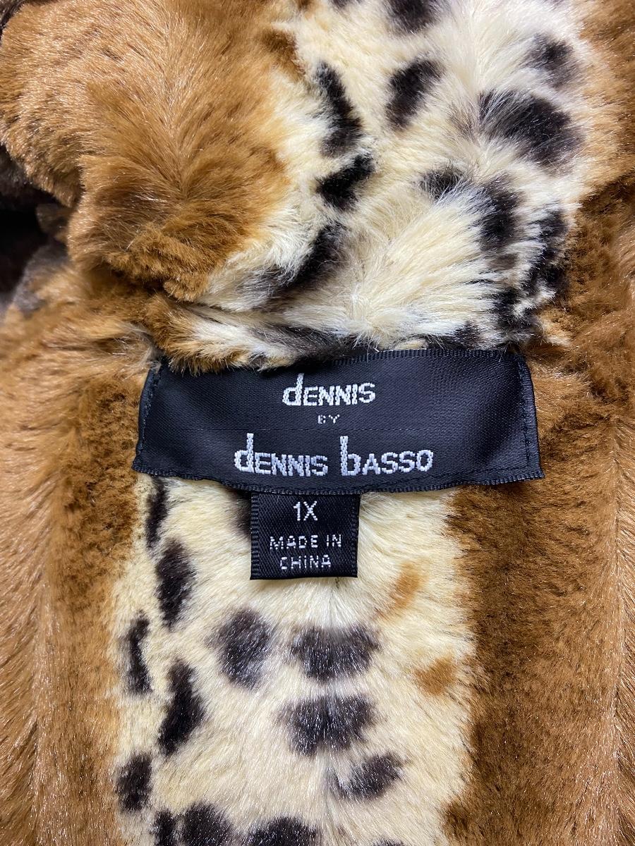 Reversible Faux Fur Coat Rain Jacket from Dennis Basso. Super soft faux fur on one side, weather proof coat on other, can be turned either way, Has a detachable hood that is reversible as well. In good condition. Size 1X.