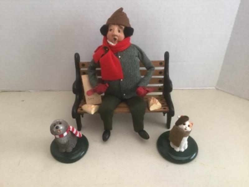 Byer’s Caroler on a Bench with a Cat & a Dog