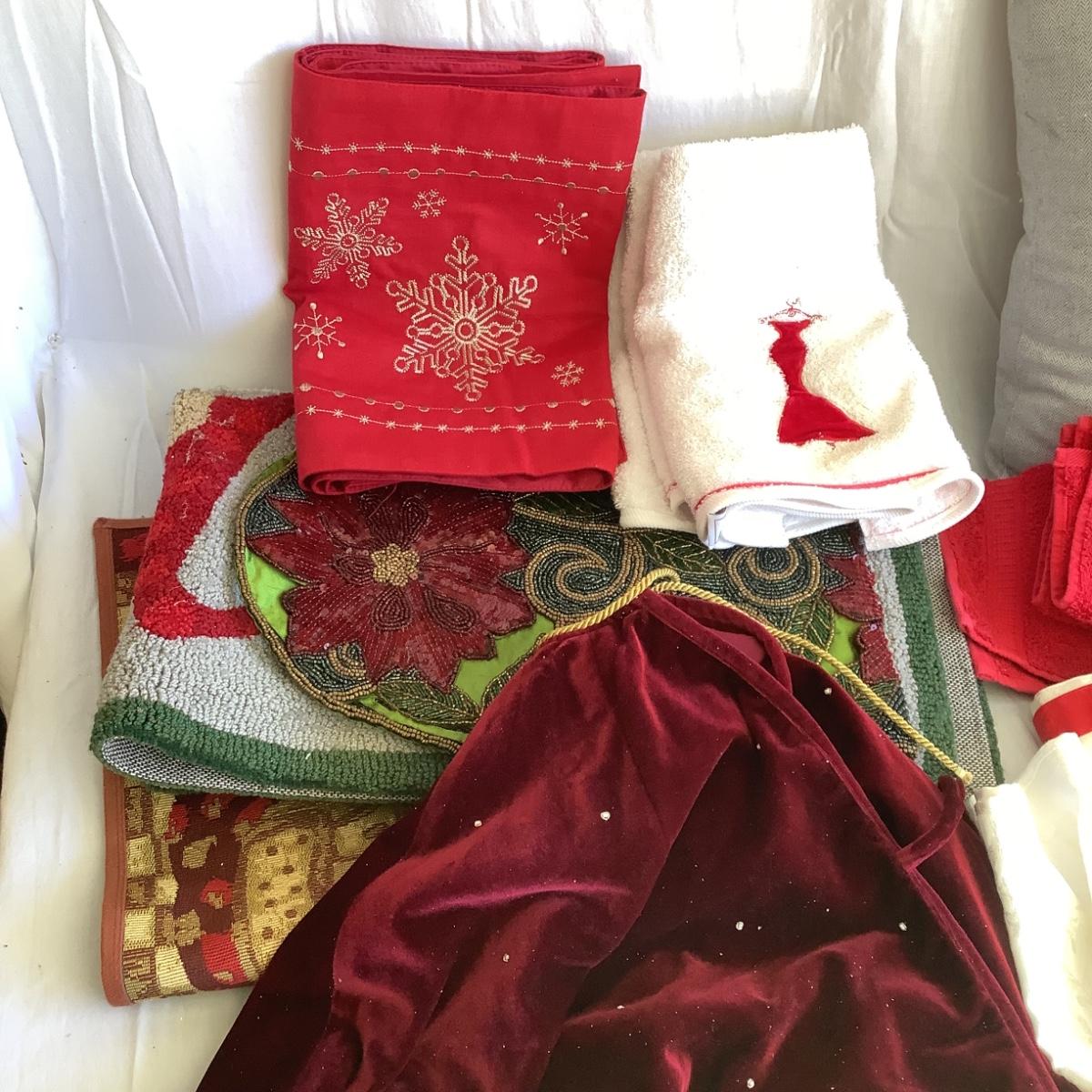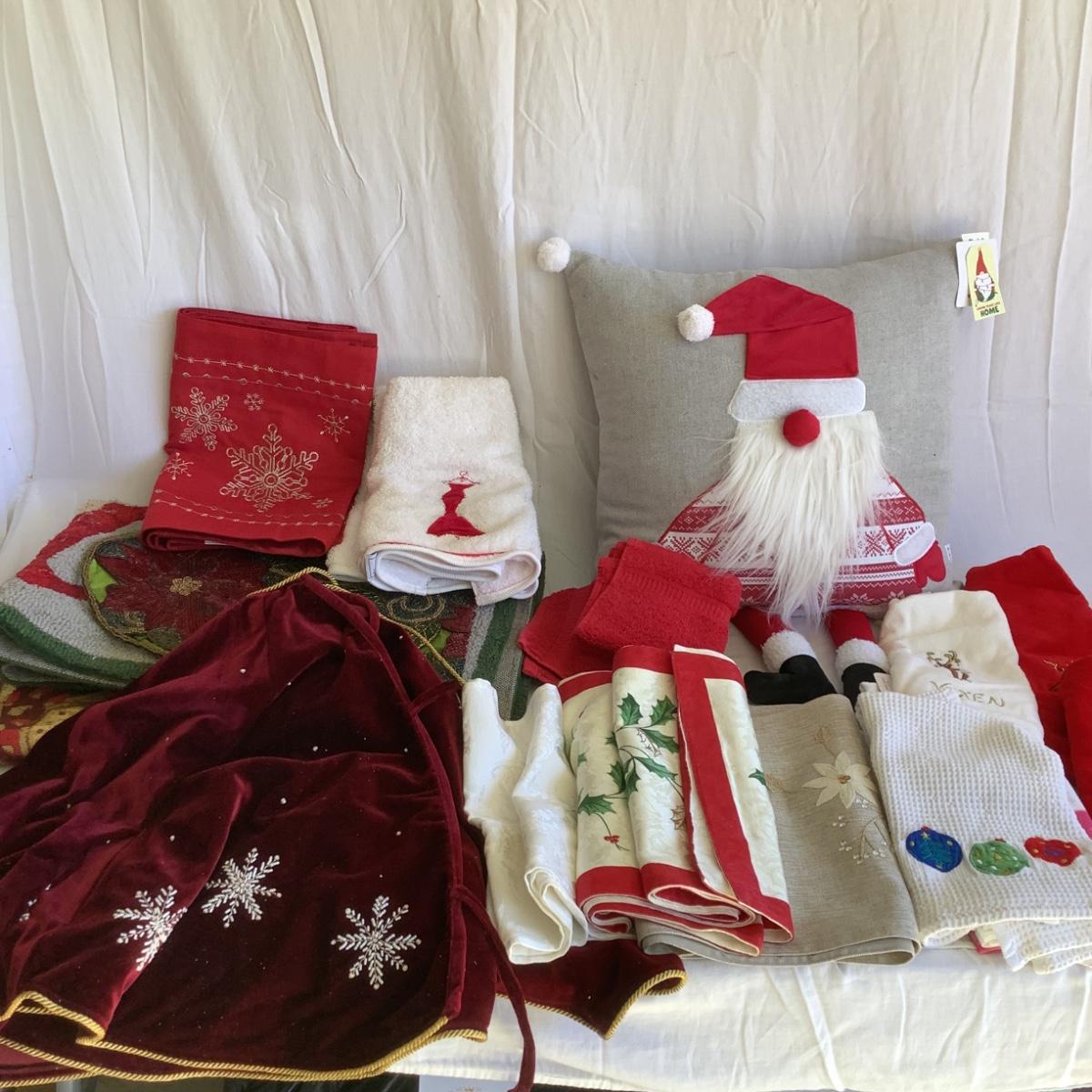 Comes with santa gnome pillow, 5 table runners, 2 rugs and one tree skirt