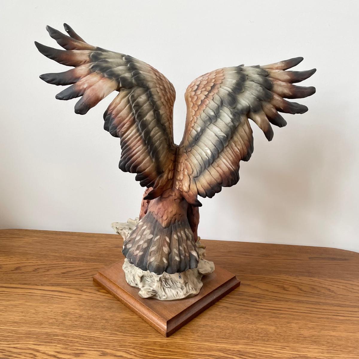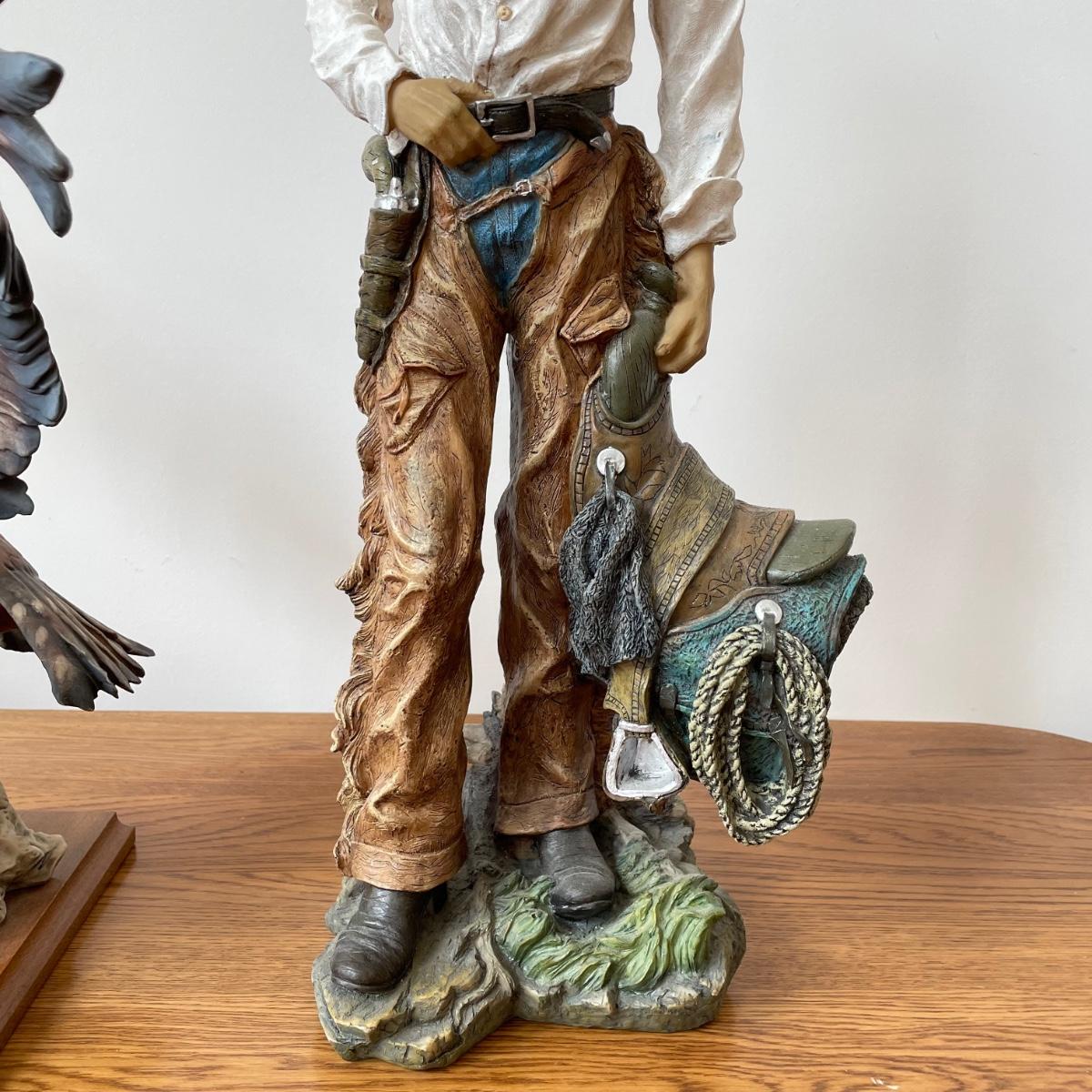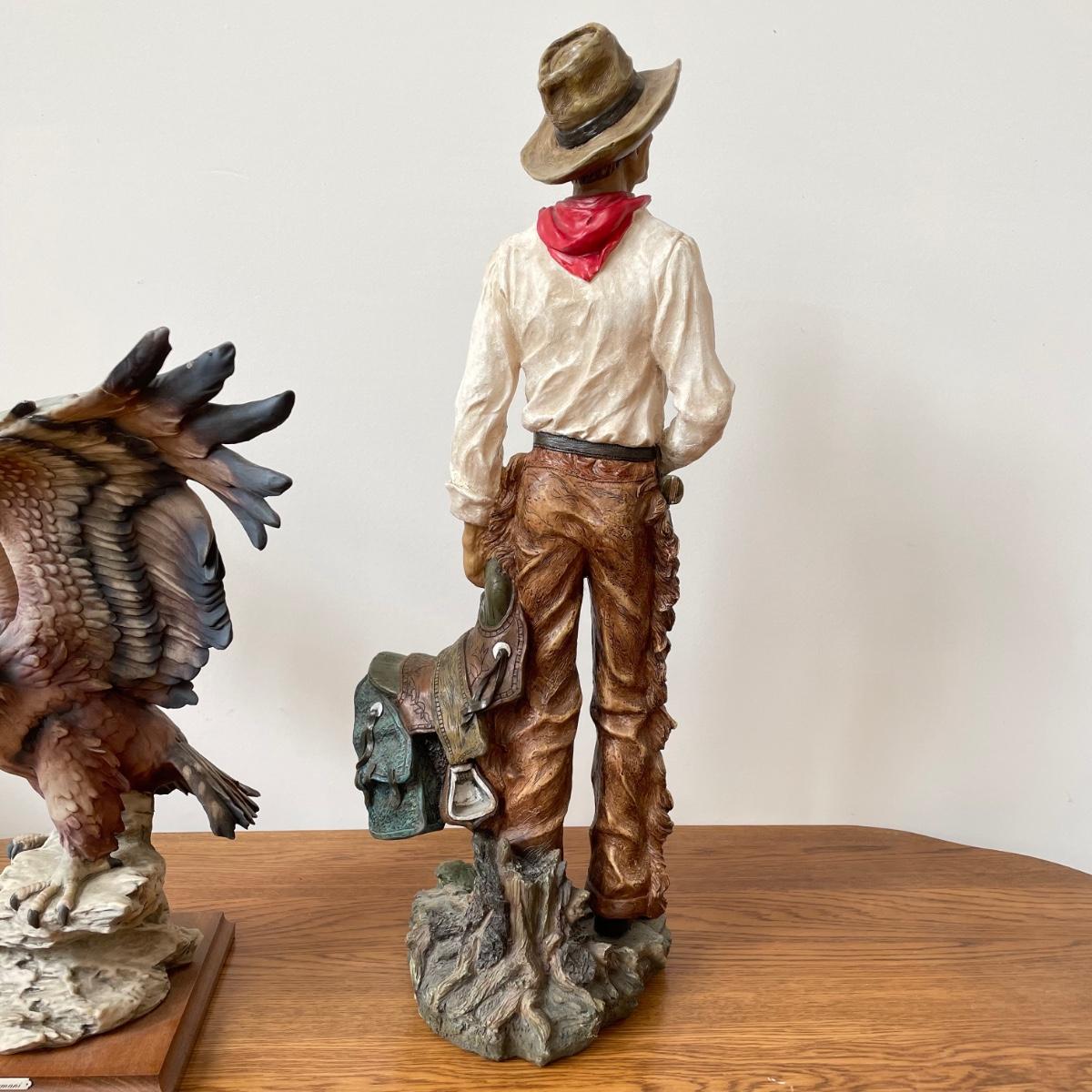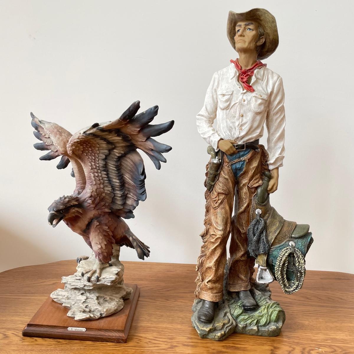Giuseppe Armani red tailed hawk statue on a wooden base with name plate. Statue has a 16” wing span and it’s about 16.5” tall. There is one small chip on its beak and it appears that two tail feathers have been repaired. The accompanying rustic cowboy is made from resin and in great shape. He stands 24” tall. See images. Shipping available.