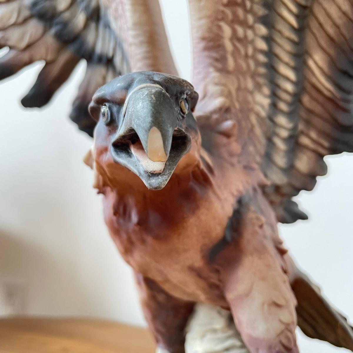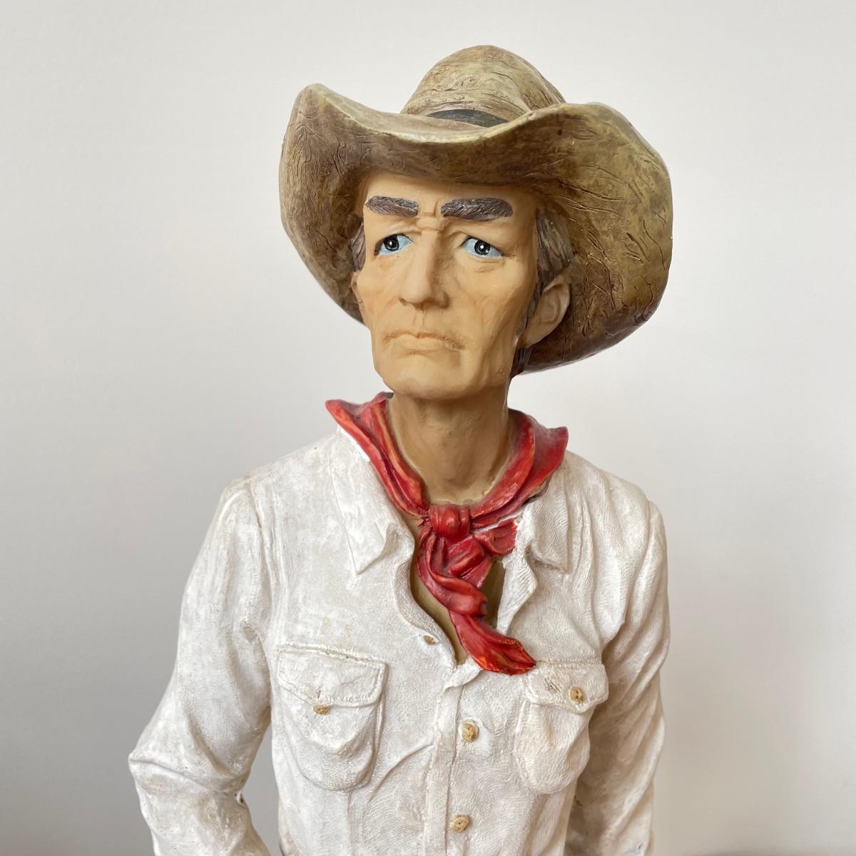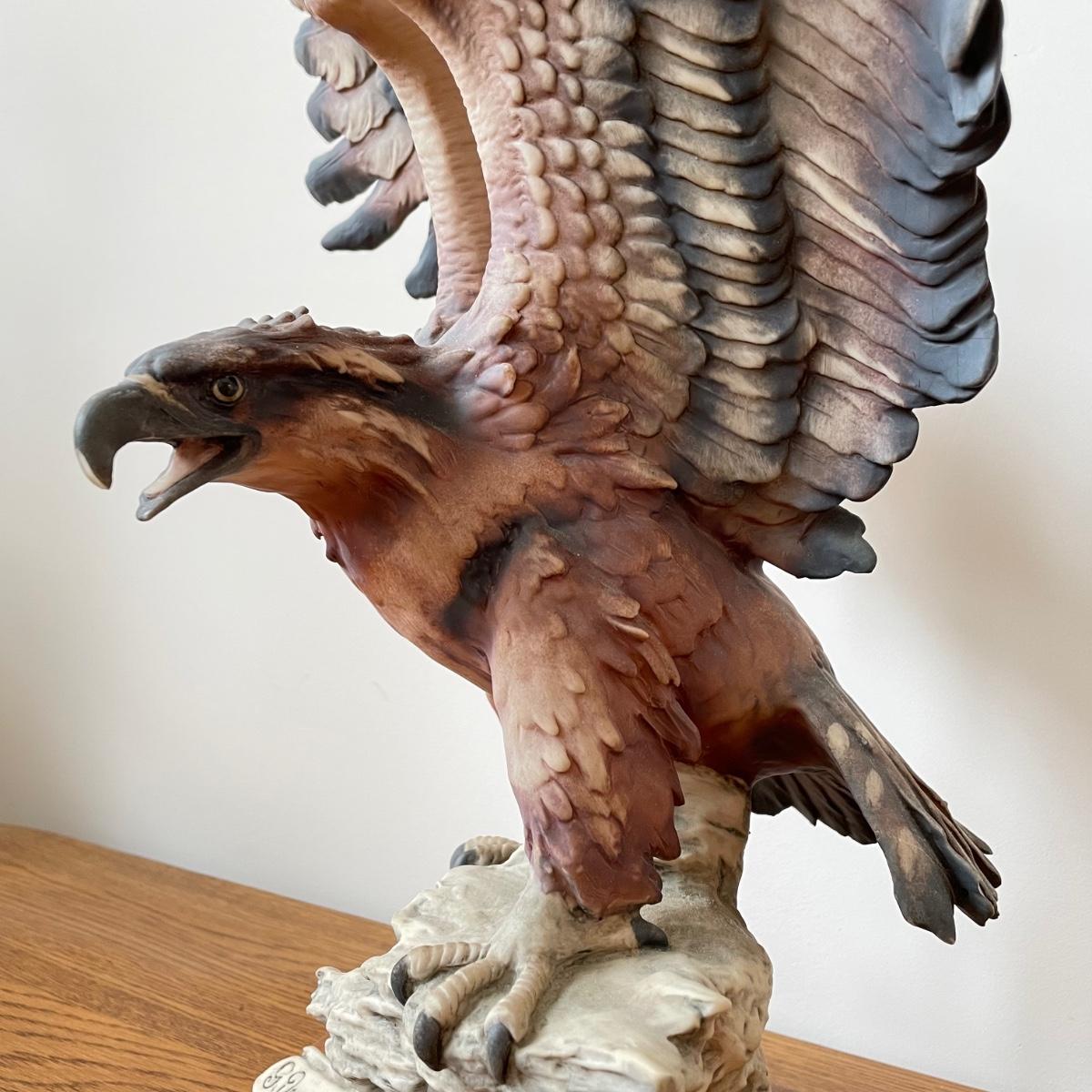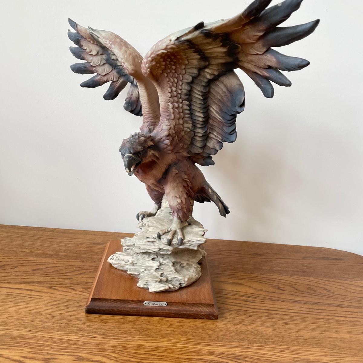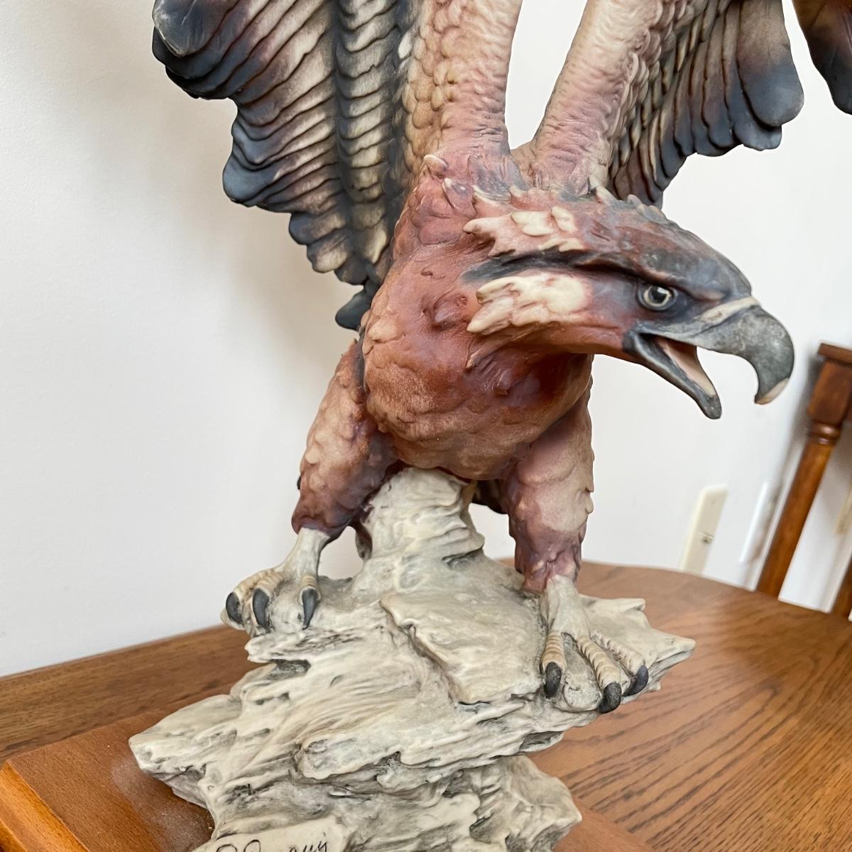 Giuseppe Armani red tailed hawk statue on a wooden base with name plate. Statue has a 16” wing span and it’s about 16.5” tall. There is one small chip on its beak and it appears that two tail feathers have been repaired. The accompanying rustic cowboy is made from resin and in great shape. He stands 24” tall. See images. Shipping available.