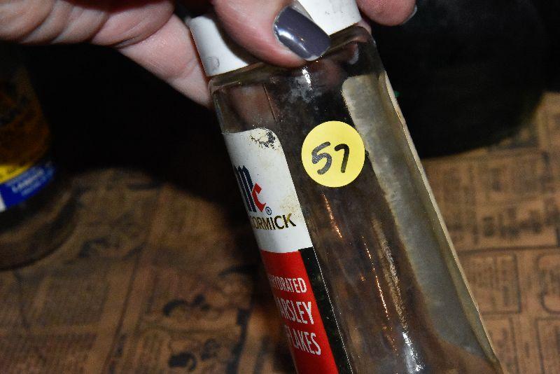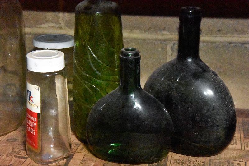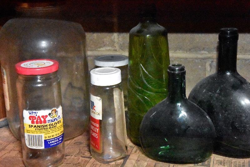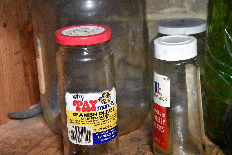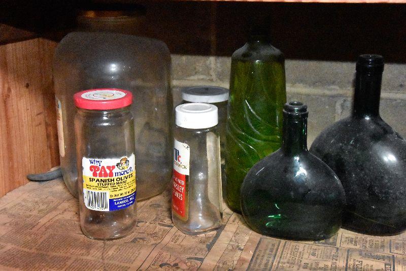 Vintage wine bottles, spice bottles, a one gallon jar, and more. Bring box for moving.