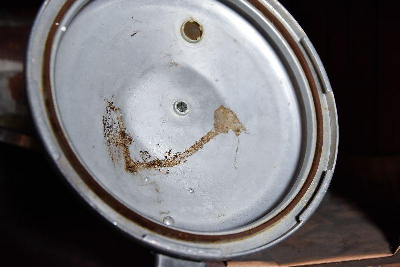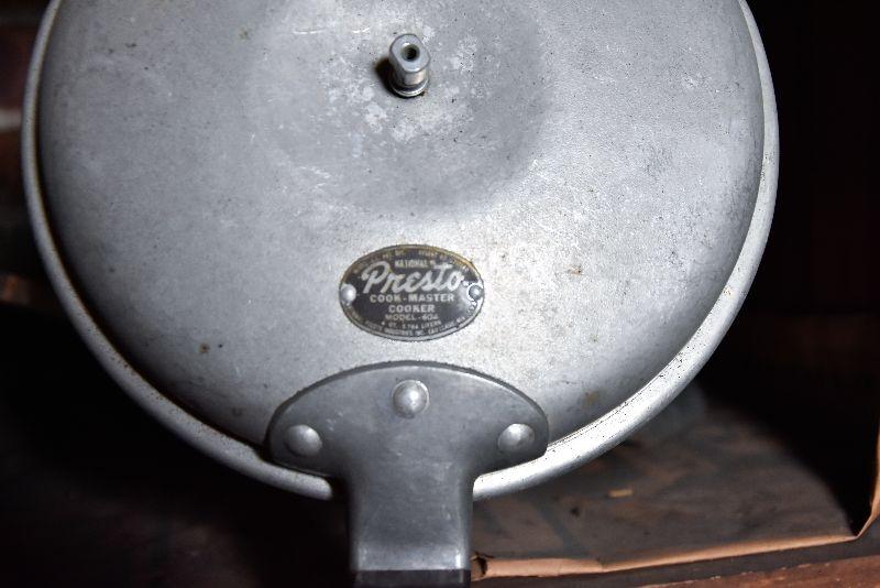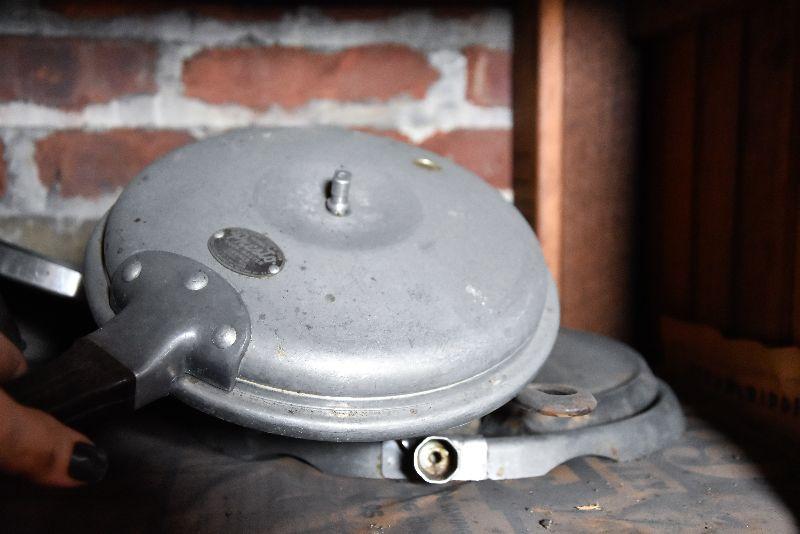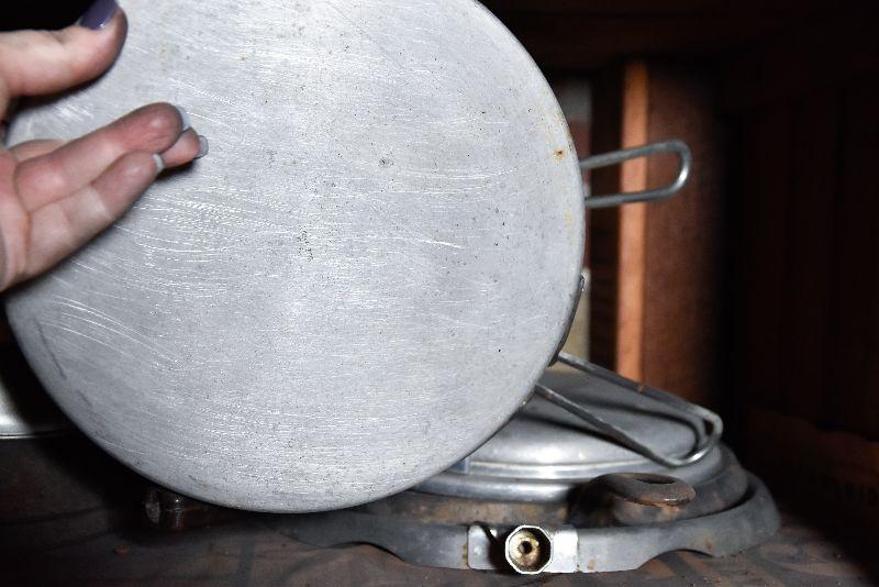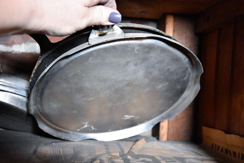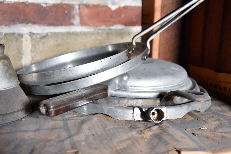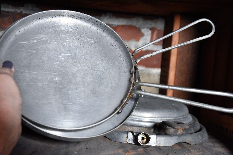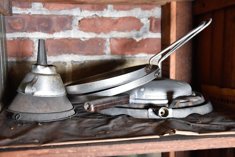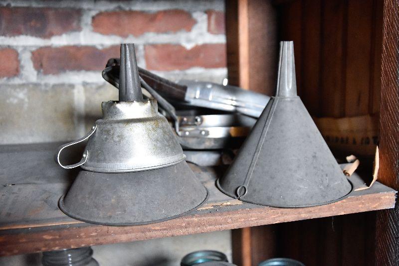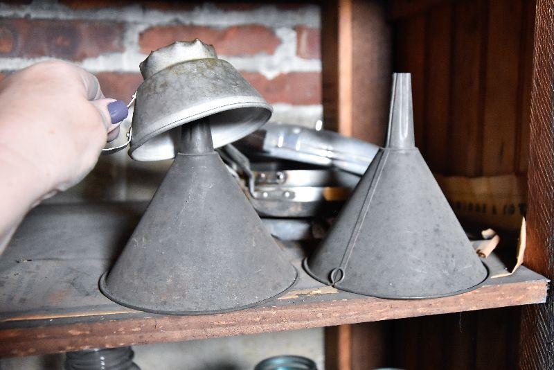 Vintage frying pans with lids, and two funnels. Bring box to move from basement.