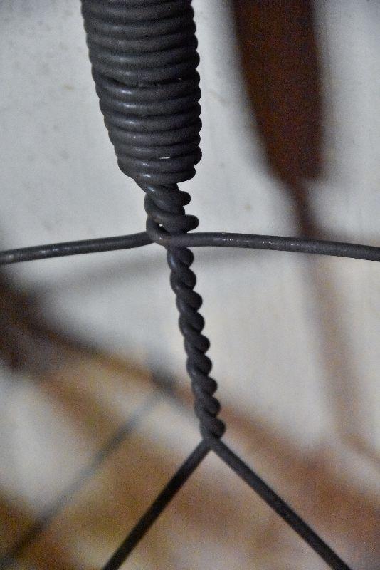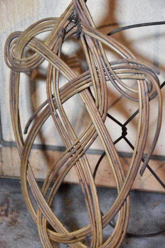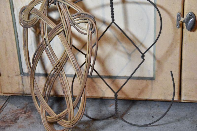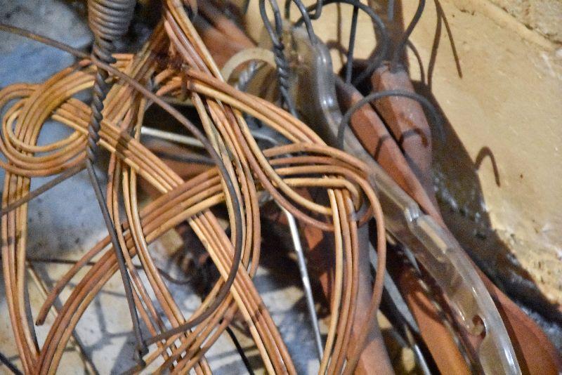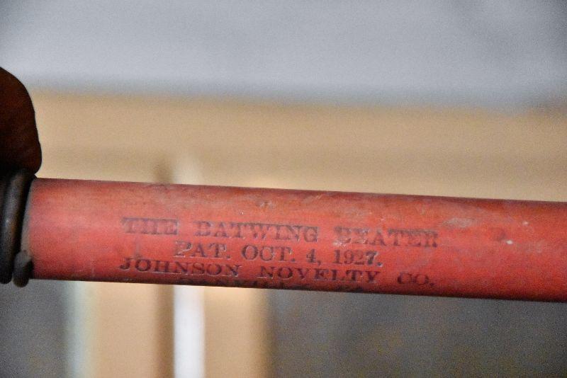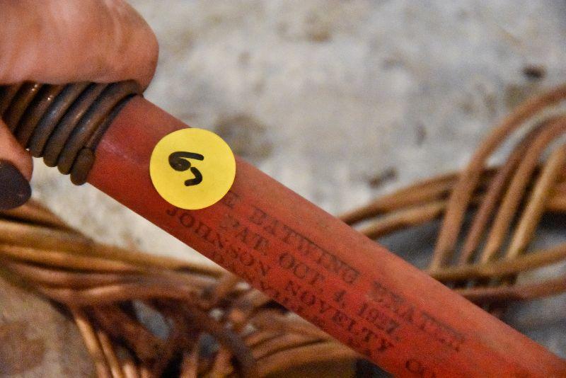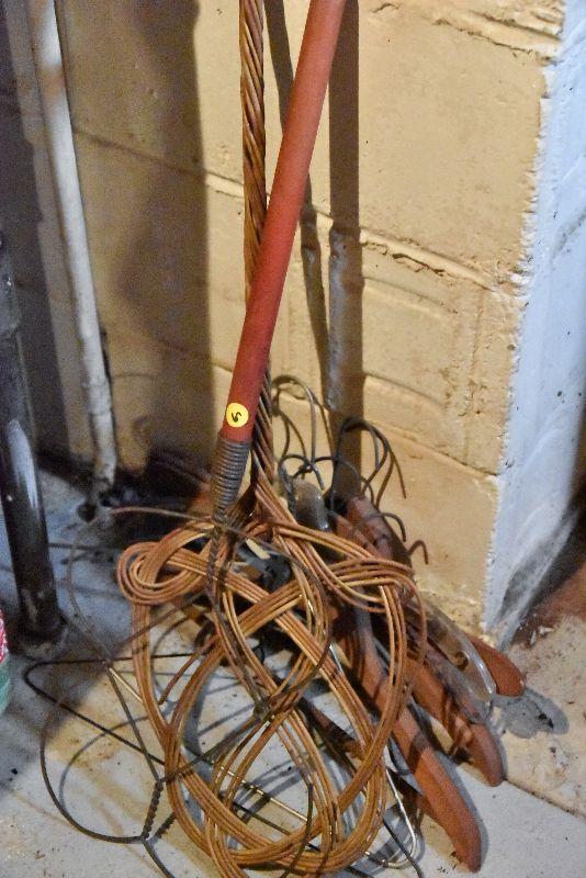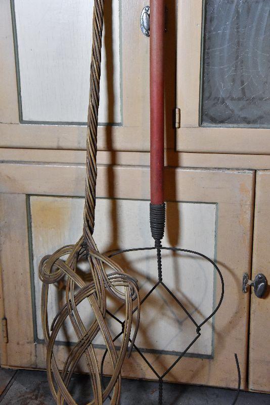 Wire and bamboo rug beaters. Also, vintage wooden hangers.