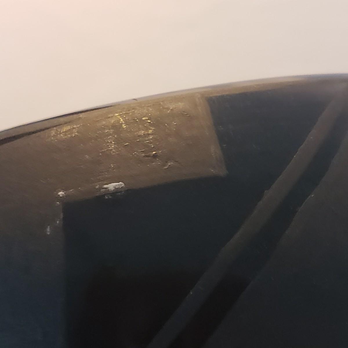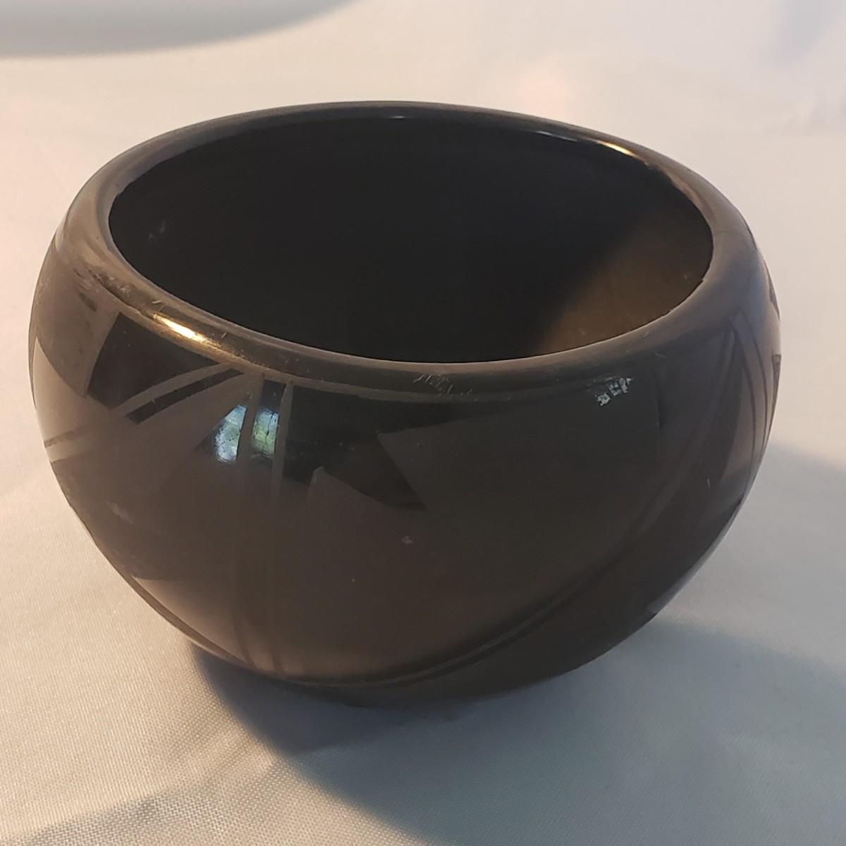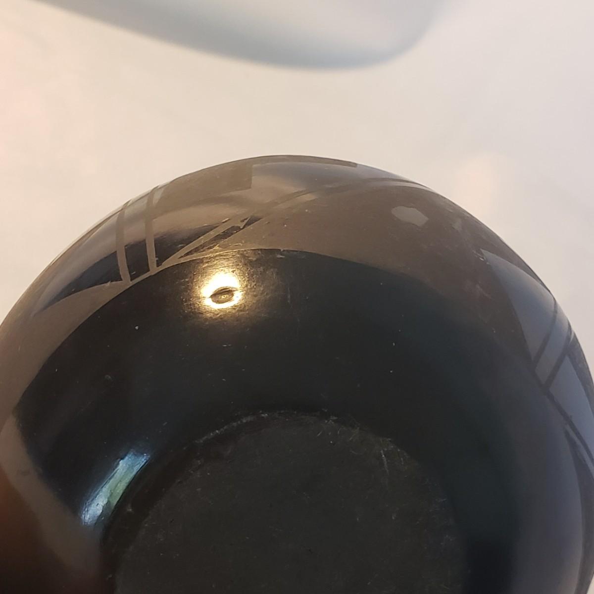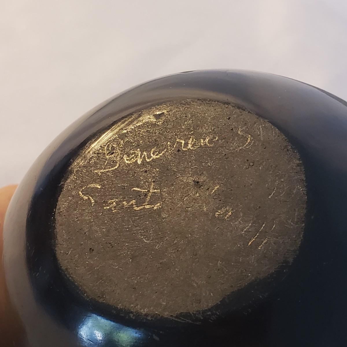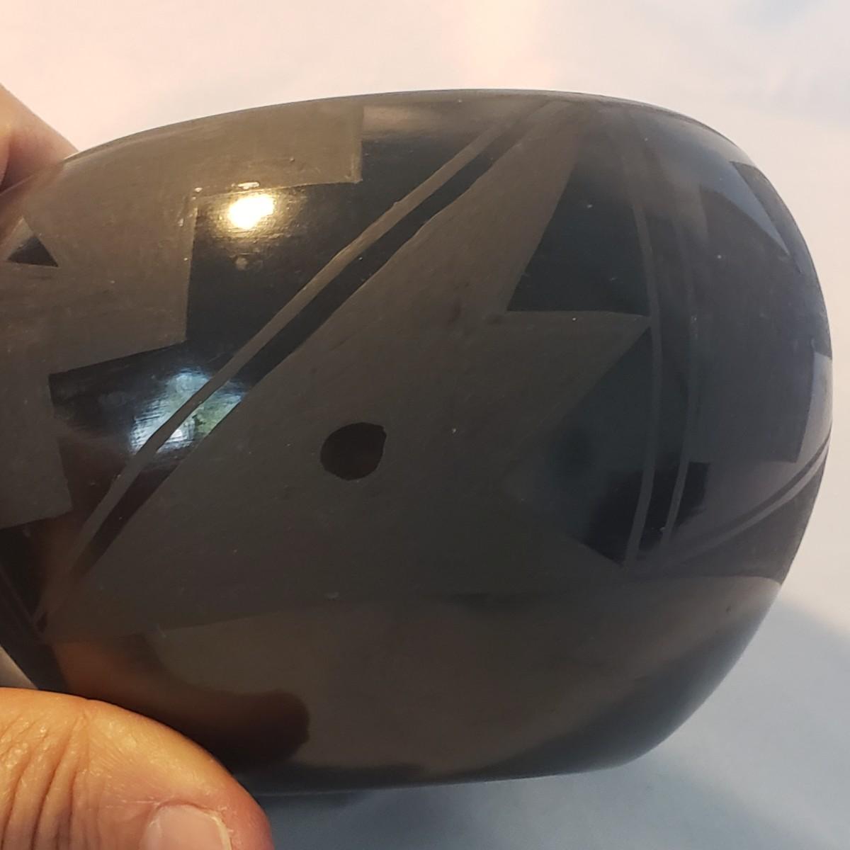 This small bowl is marked Genevieve Suazo Santa Clara. This Blackwater pottery piece measures 4.5" x 3.5". It appears to have a two tone glaze with geometric patterns in high gloss with the remainder a matte or possibly unglazed sections. There are a few scuff marks on the bowl, see pictures.