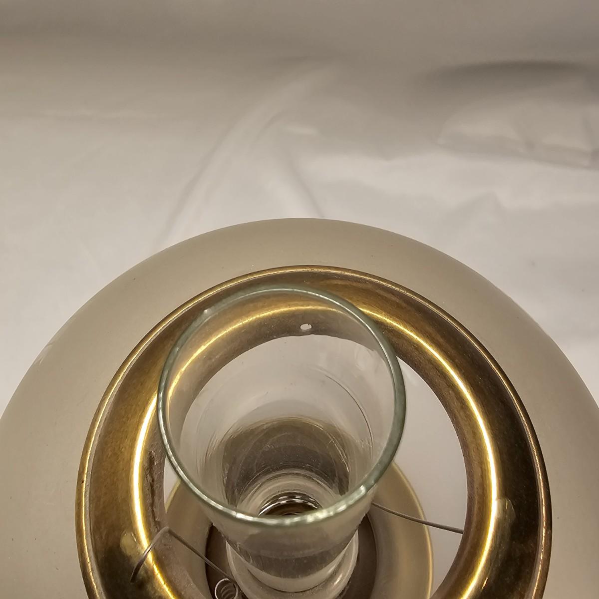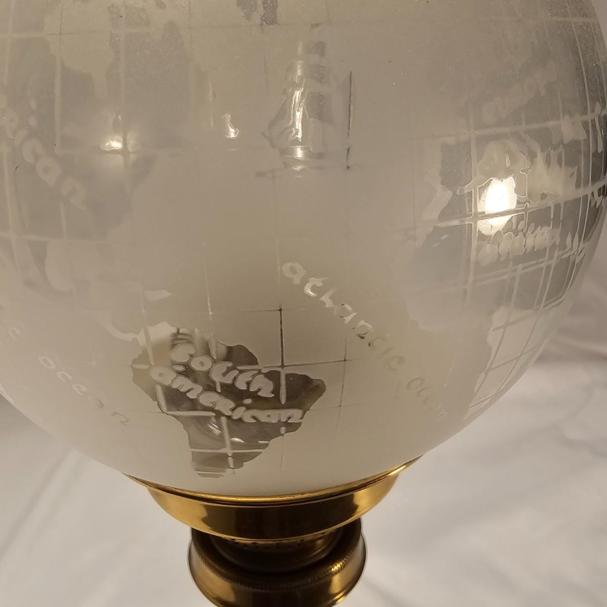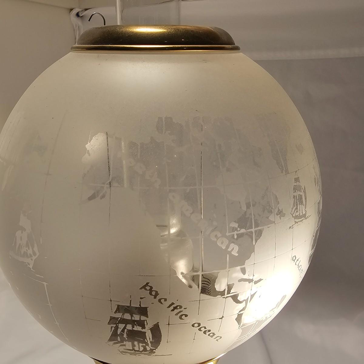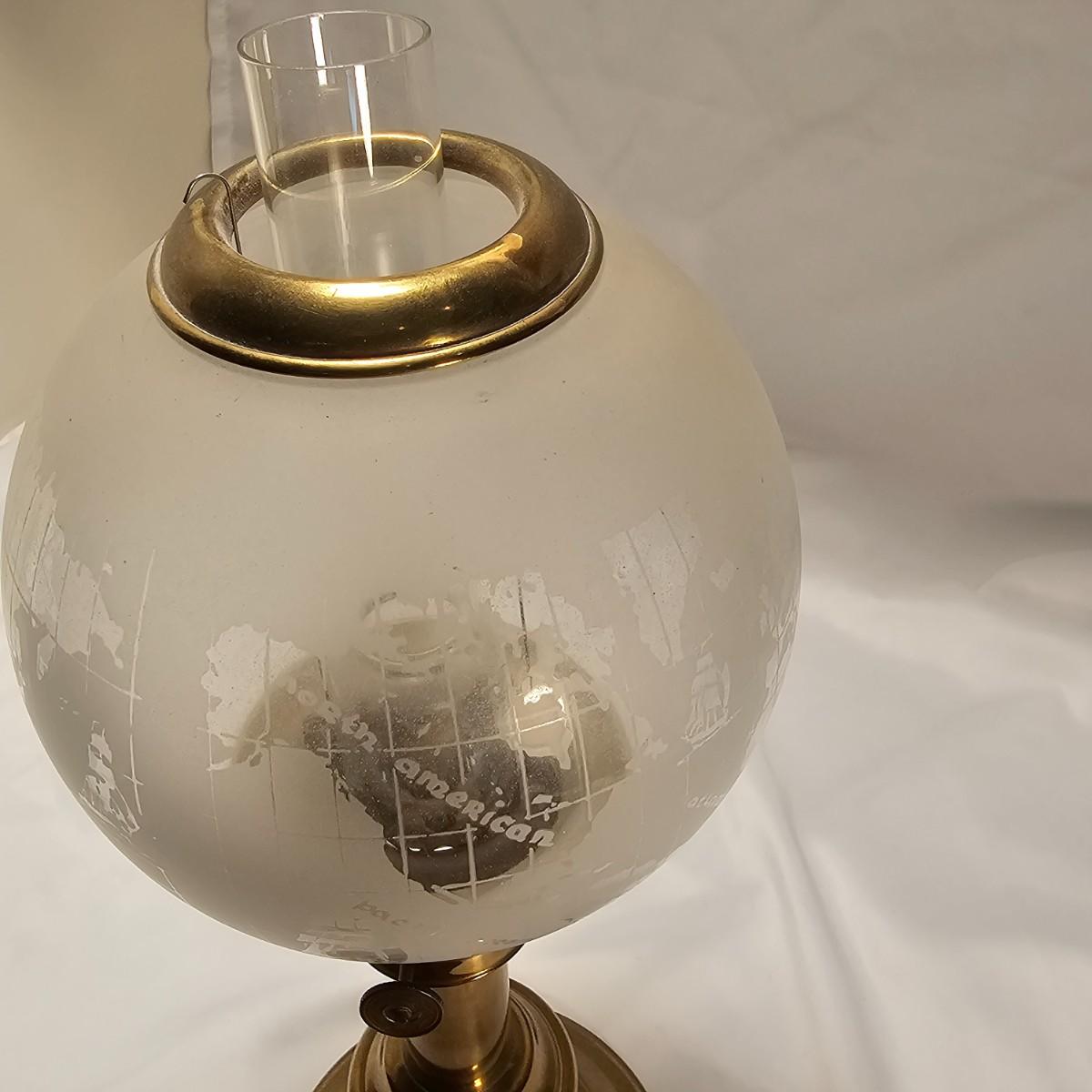 Stately brass and glass oil lamp by G.V. Harnisch of Denmark. Stamped plate on front of base. Frosted globe is world map in relief with oceans and continents marked. Lamp measures 6" D x 16"H, has some tarnish and discoloration on base. See photos for details. Shipping available.