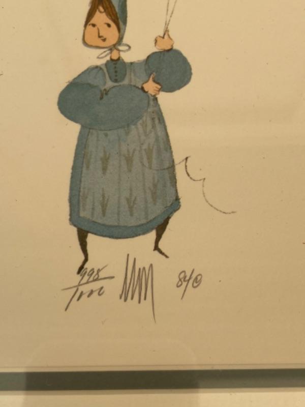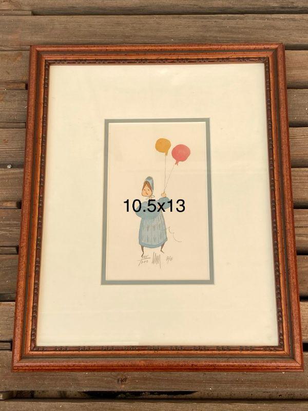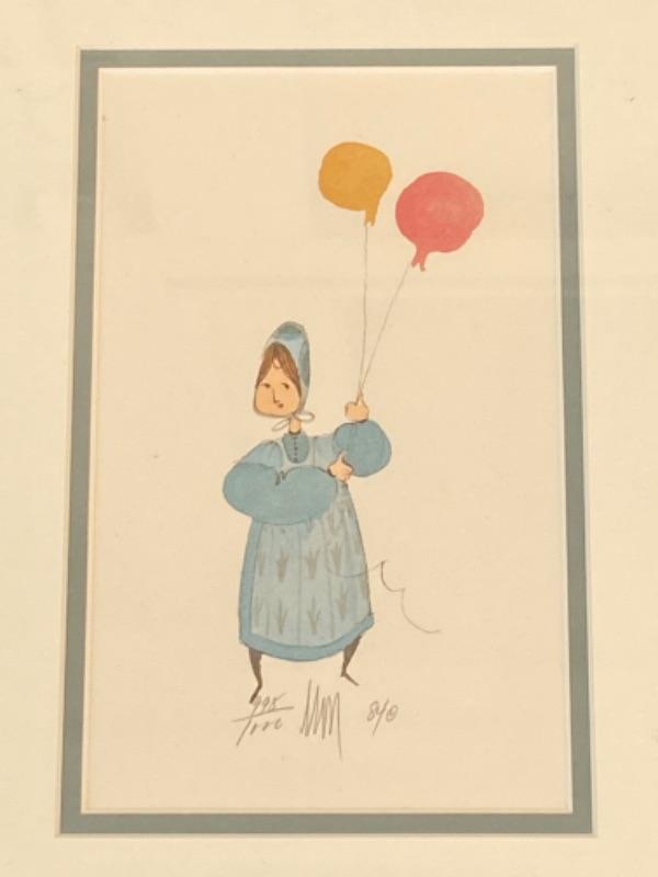 This is a vintage print of an Amish girl with two balloons, limited ed. #998 out of 1000. It is signed & framed. Frame measure approx. 10 X 13 INCHES - it is in good displayed condition. Colors look sharp.
