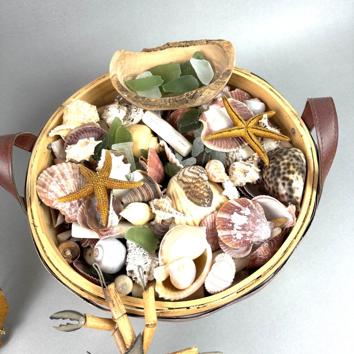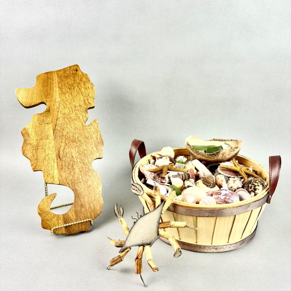 G020 Large Basket of Shells with Crab Decor and Seahorse Cutting Board