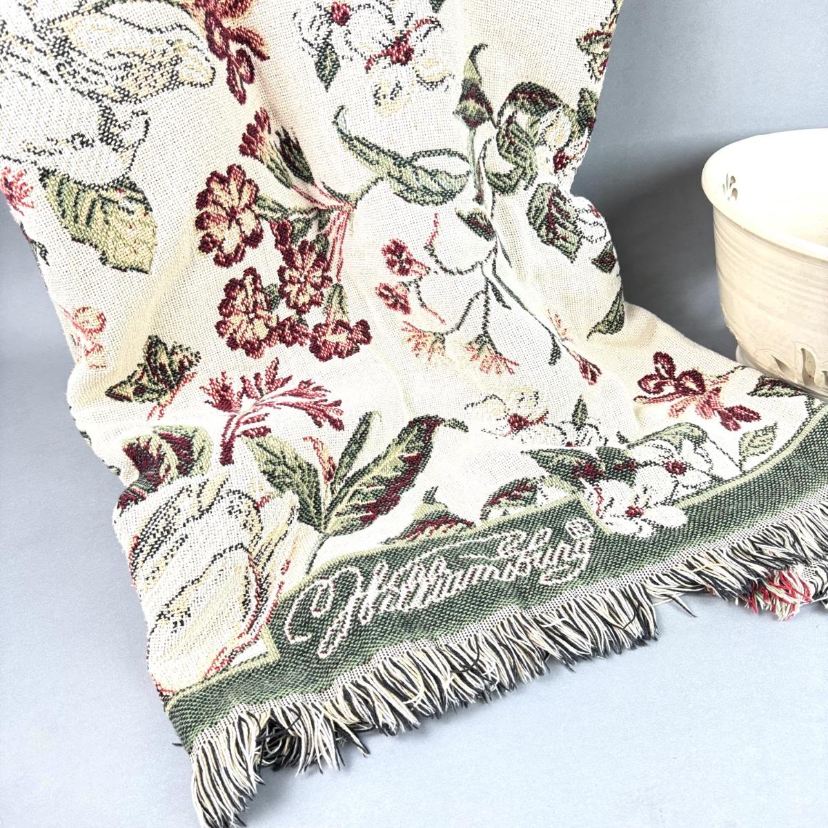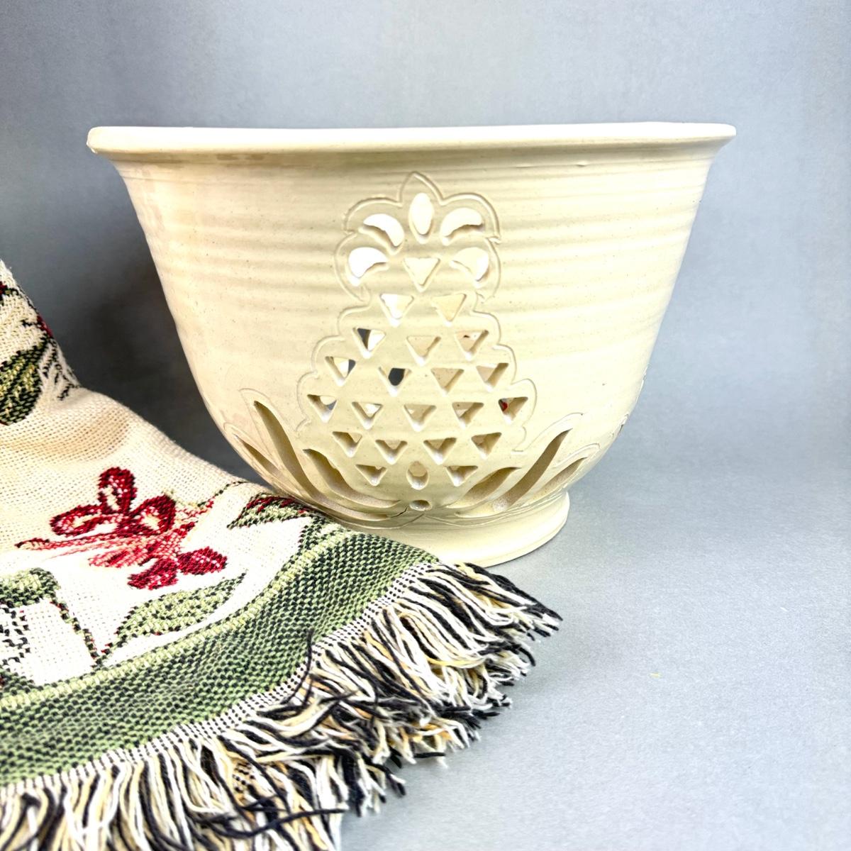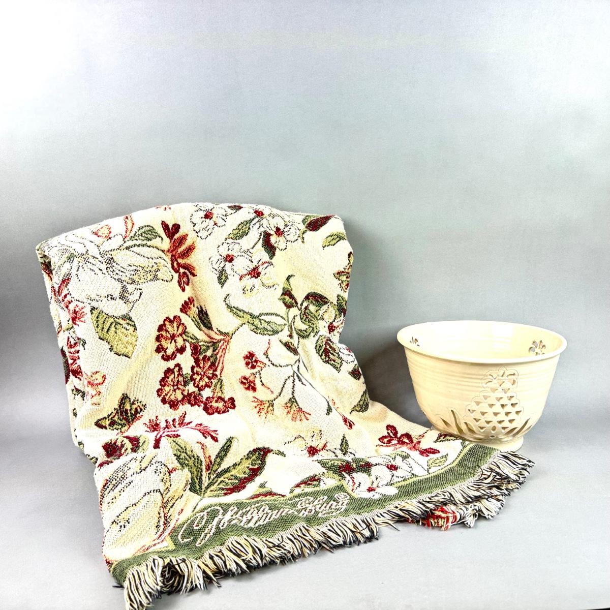 large Williamsburg throw blanket with pineapple pottery bowl measuring 10.75" diameter x 7" high