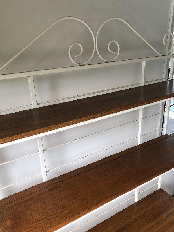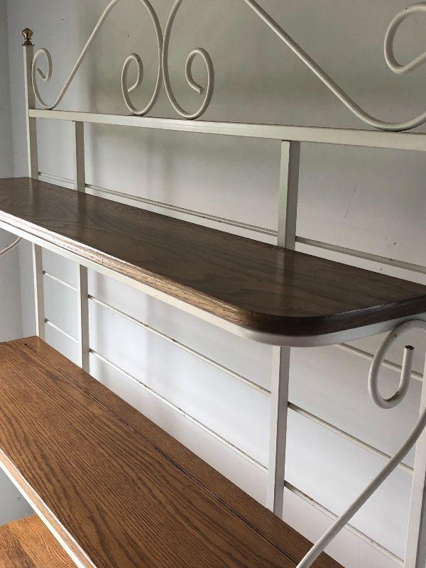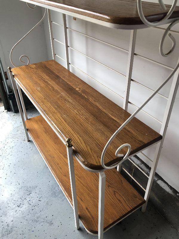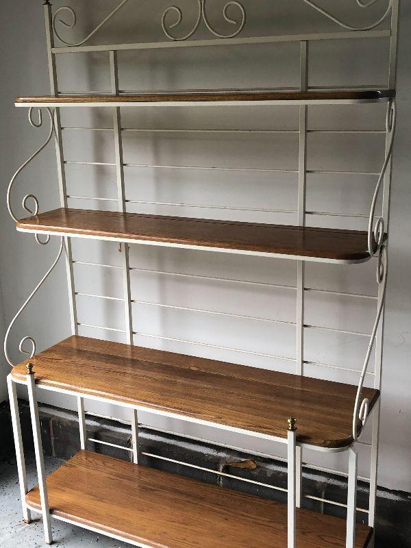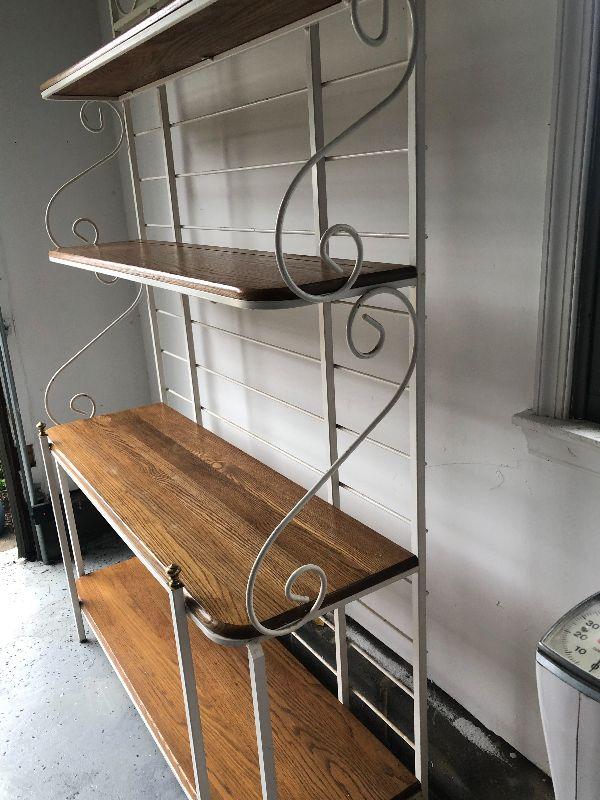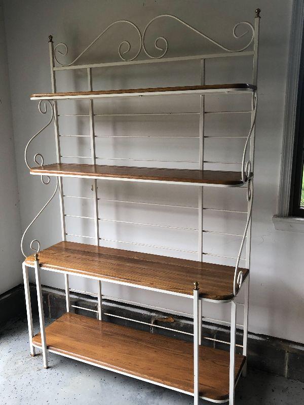 Beautiful wood and metal four tier rack with brass accents. Please see all pictures for exact contents of the lot, condition of the items, and if measurements if taken. Thank you for looking and have fun bidding.