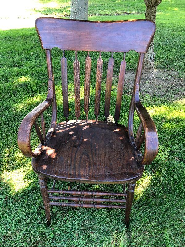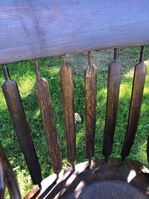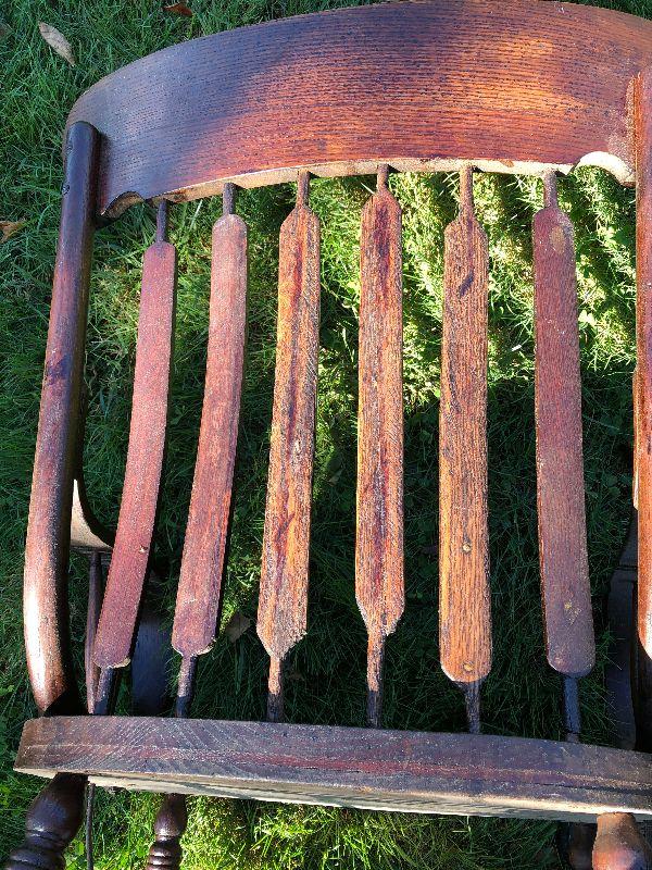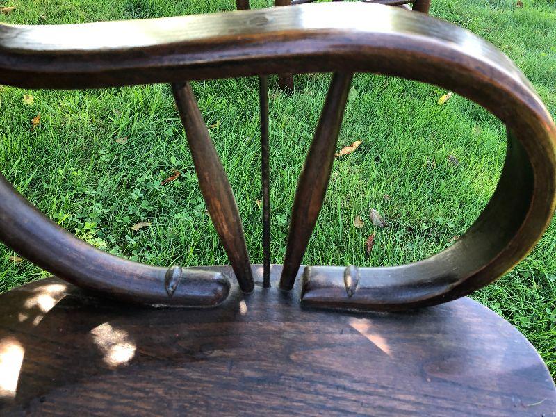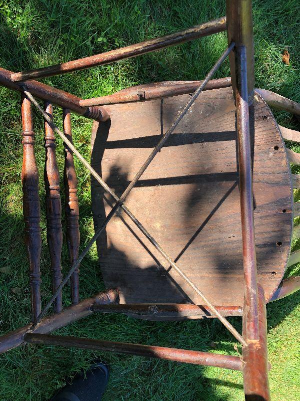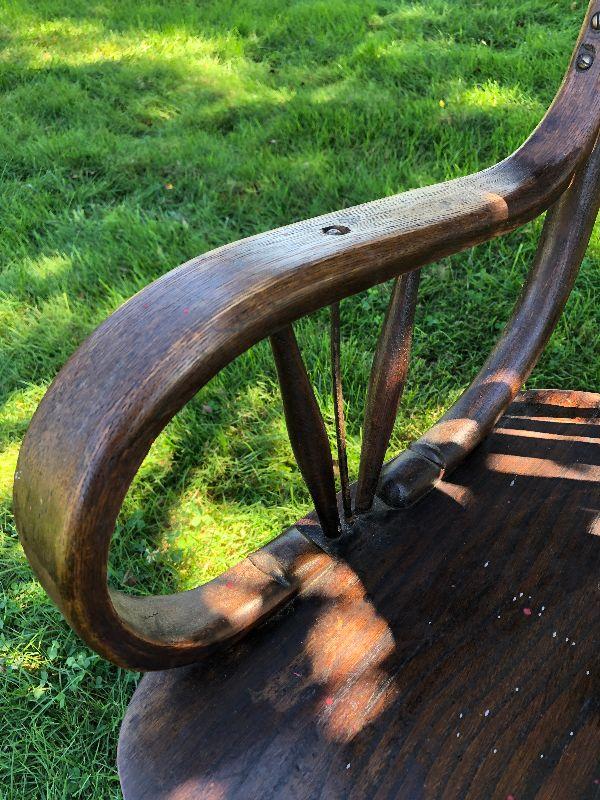 Antique chair with bentwood arms and metal supports.