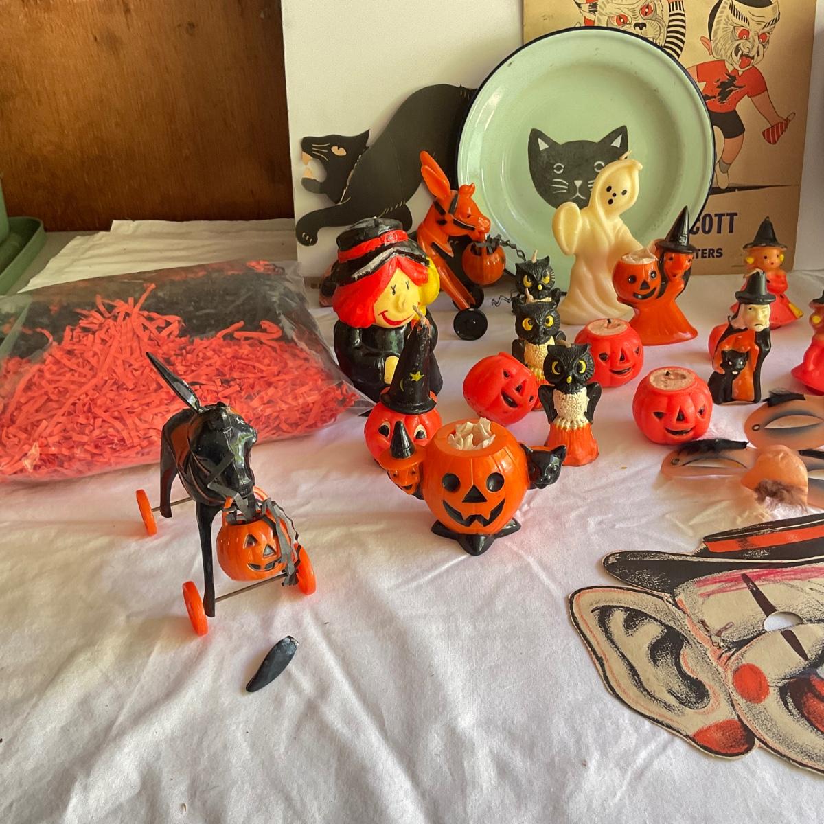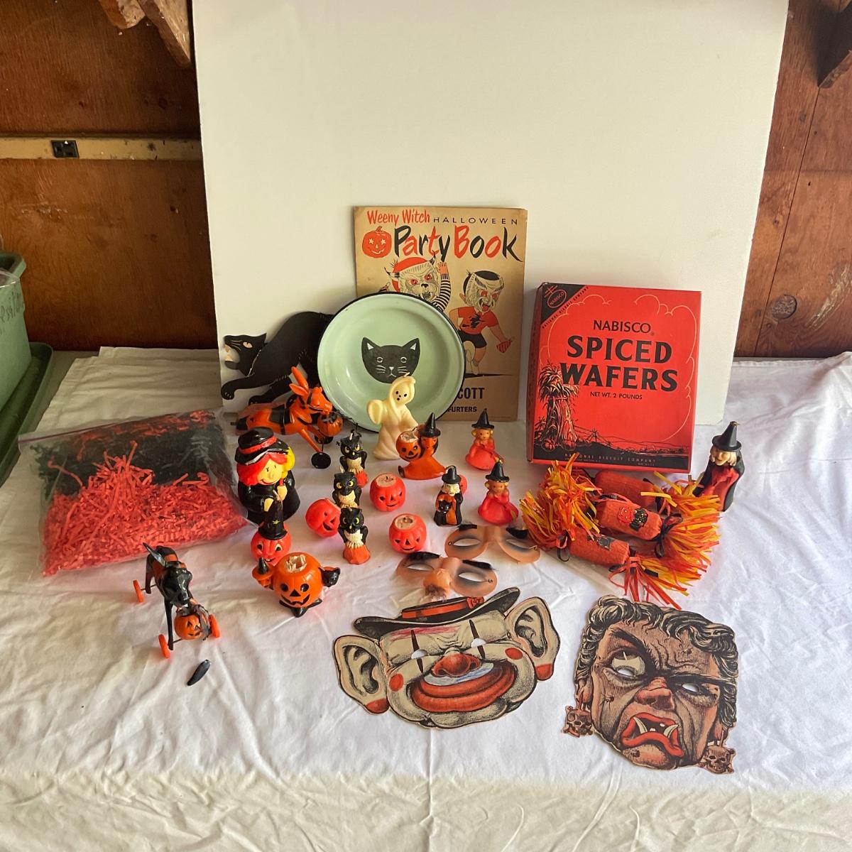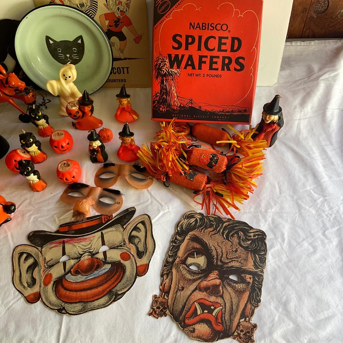 paper face hangings, vintage spiced wafers, enamel plate, plastic figures and party book