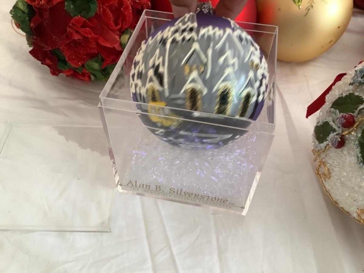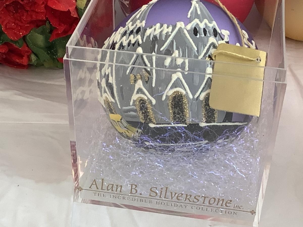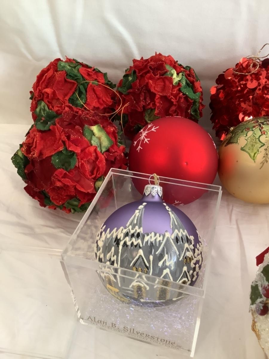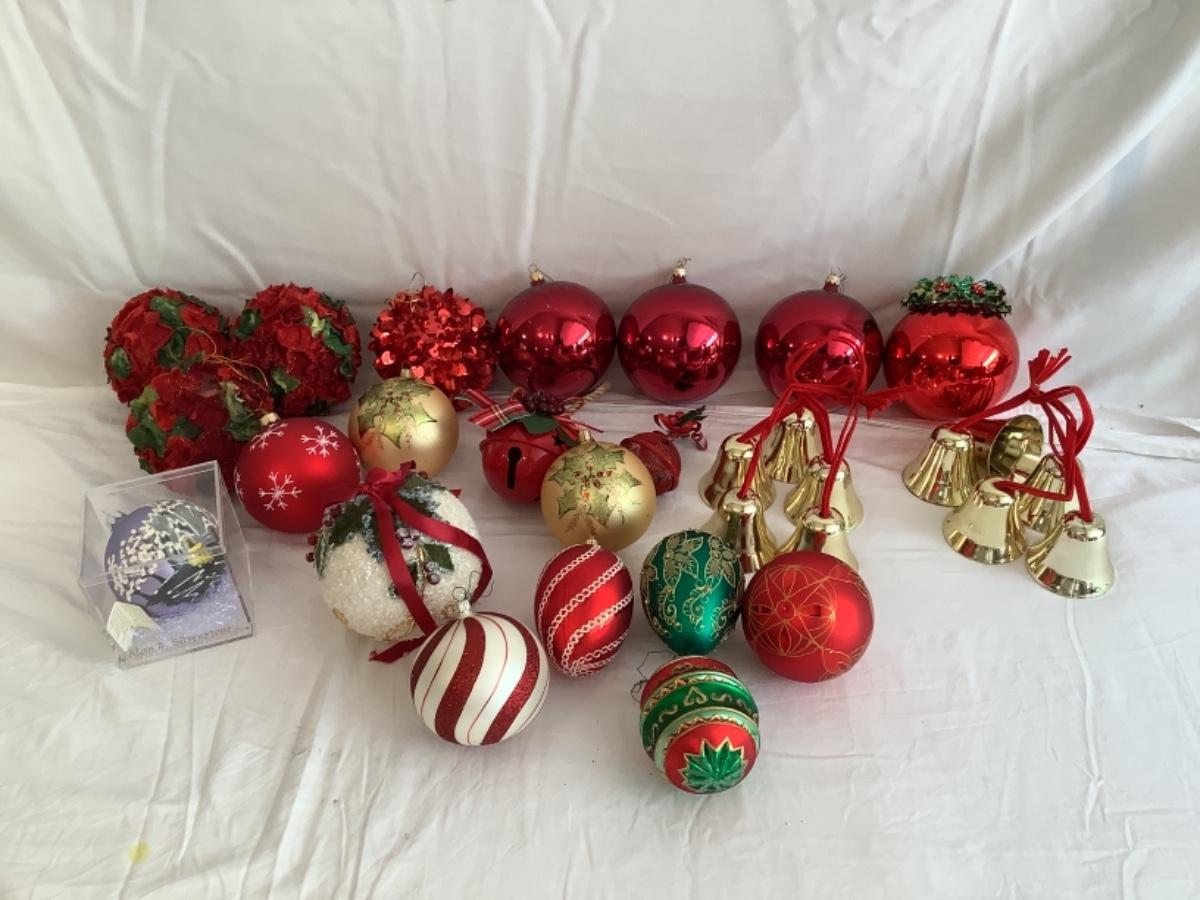 Metal bell, glass ornaments, paper mache pointsettia, plastic