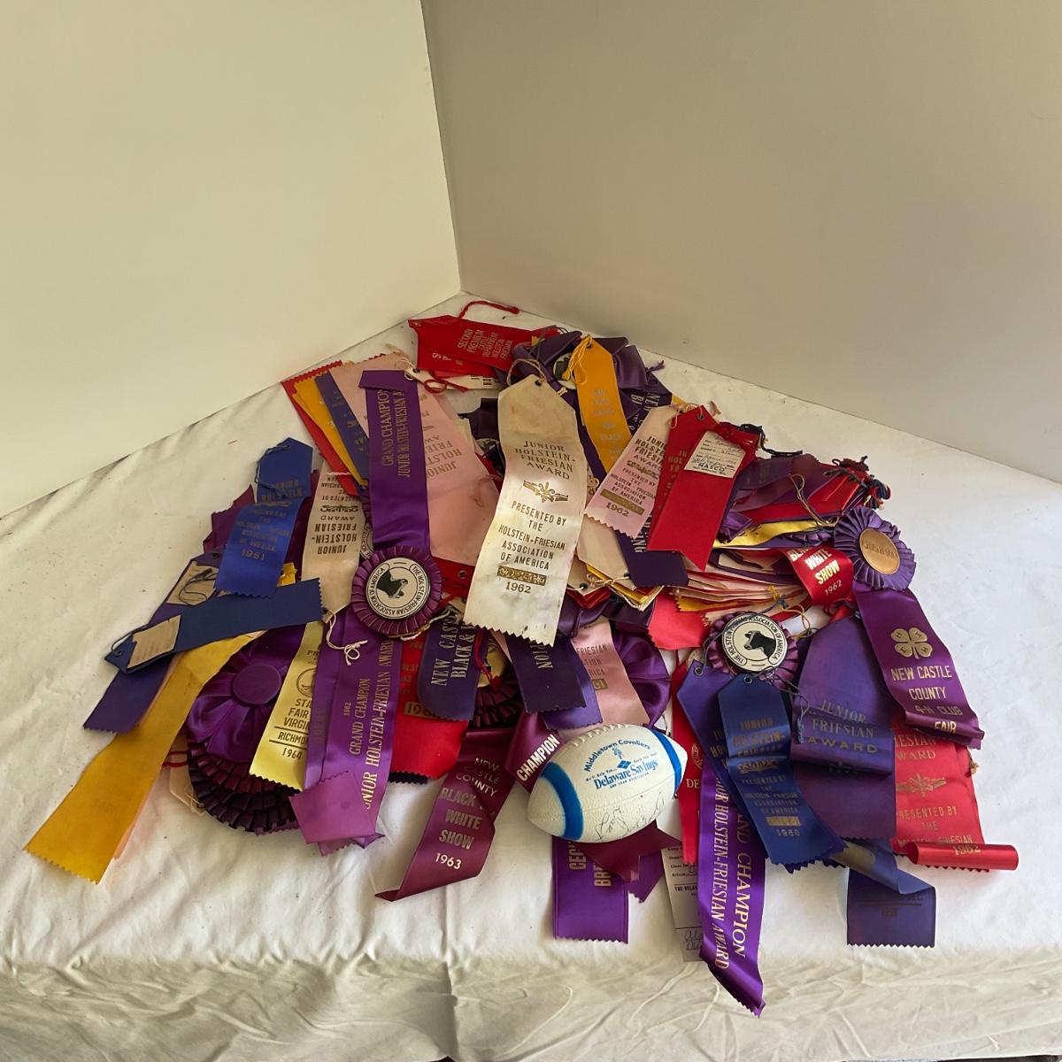 over 200 + ribbons with VA. , new castle county, and signed football, cow bell