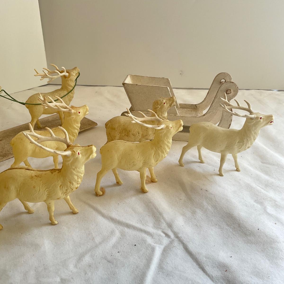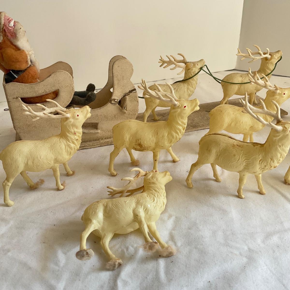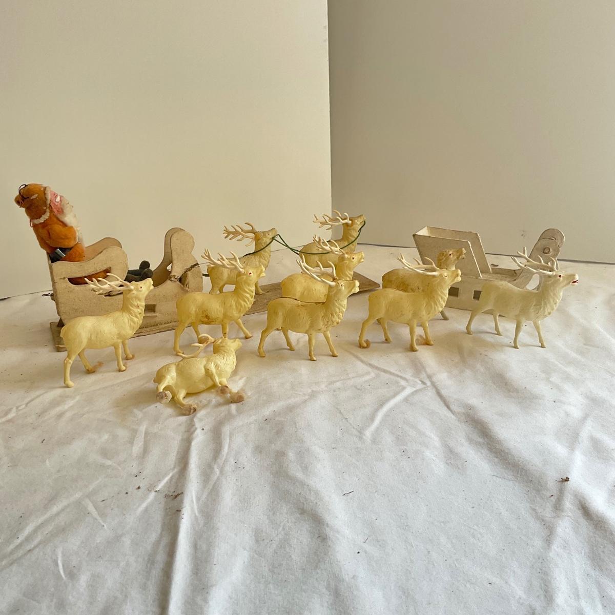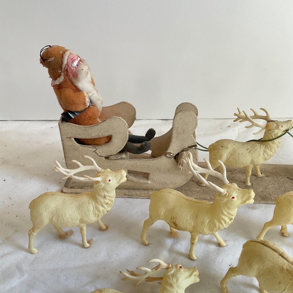 G1072 Antique Celluloid Reindeer with Paper Maché Sled and Santa