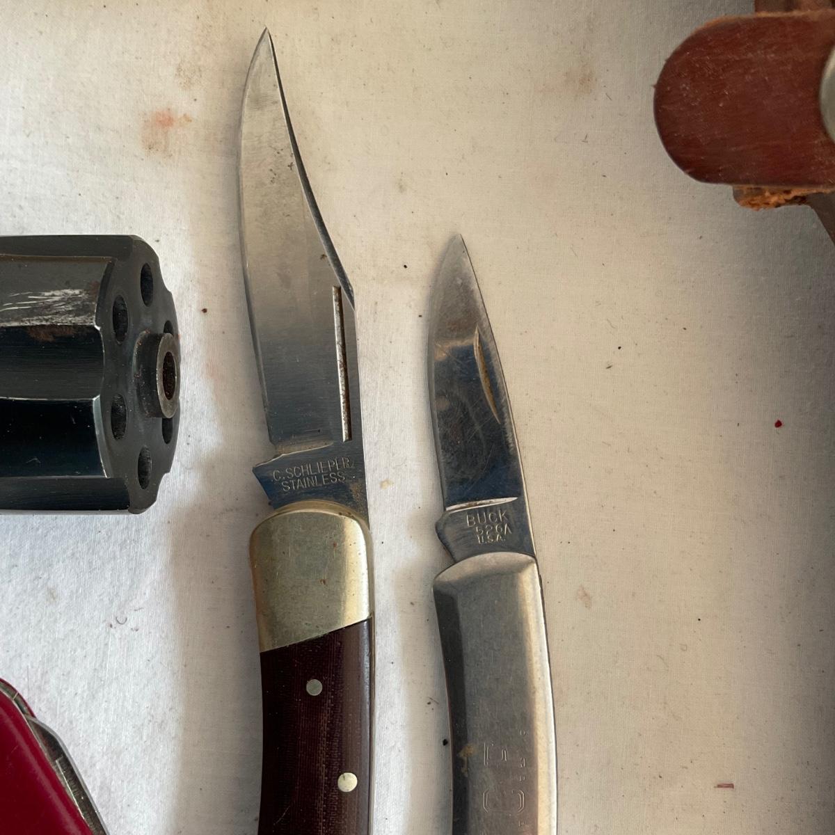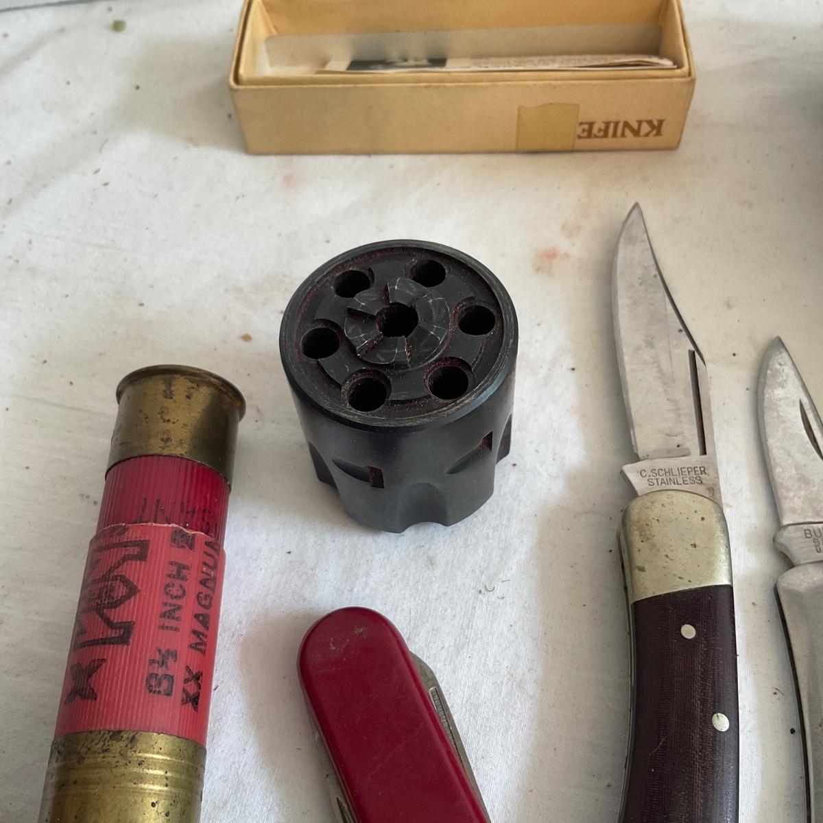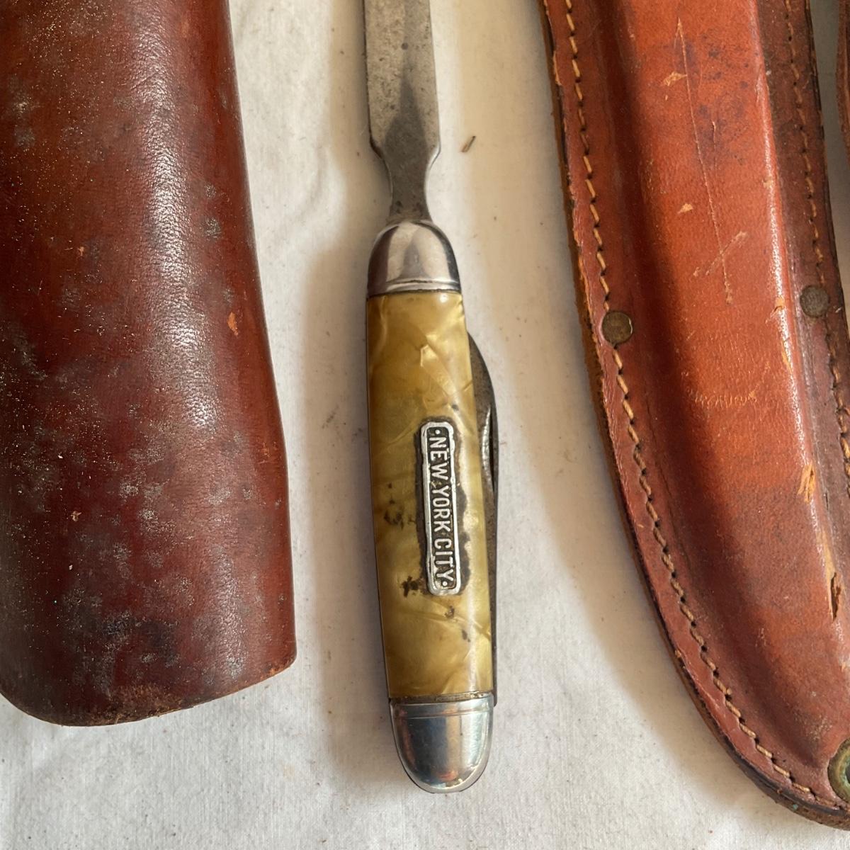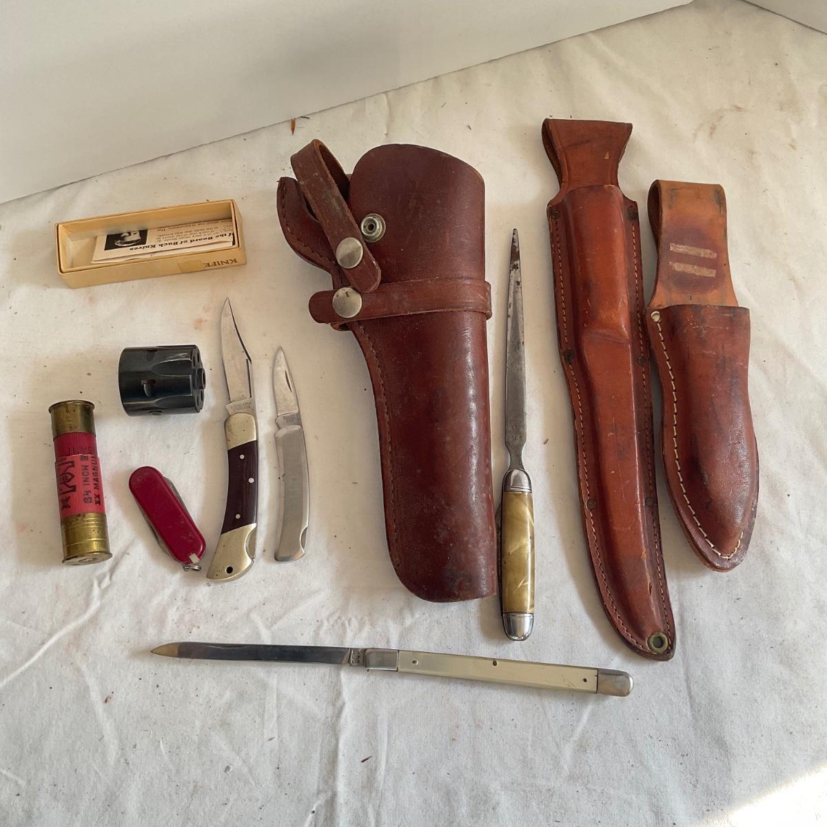 G1087 Lot of Leather Gun Holster with Knife Sheaths and Pocket Knives