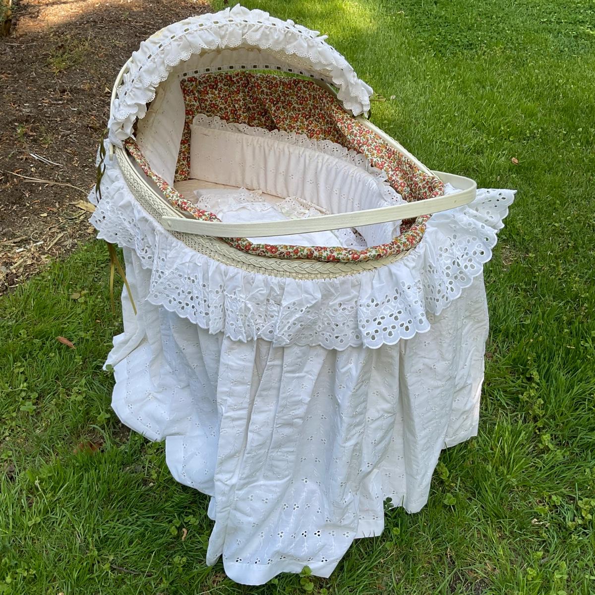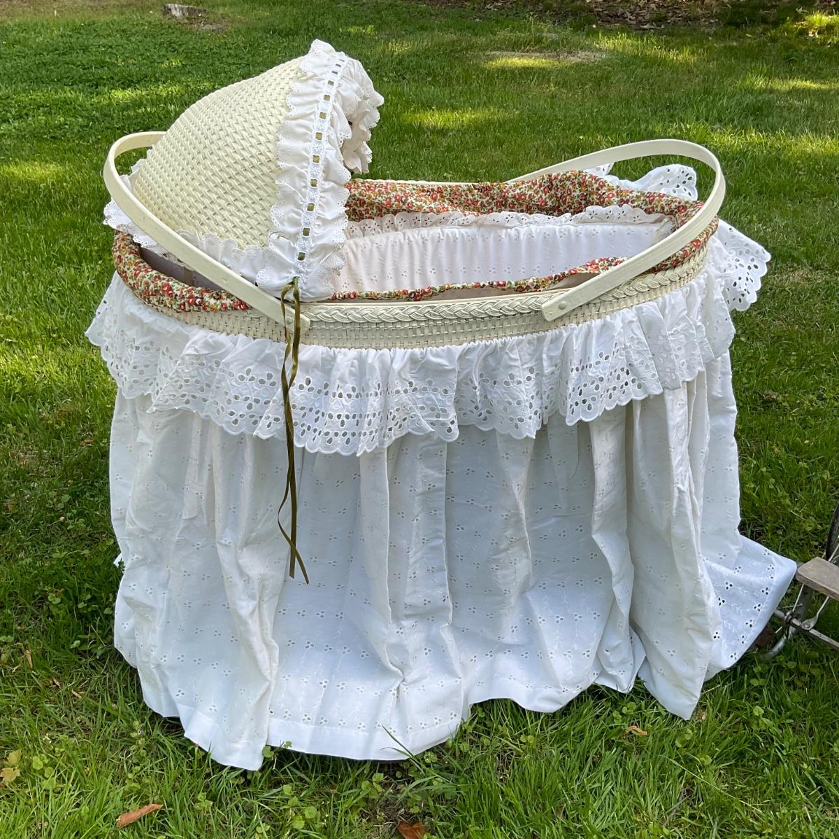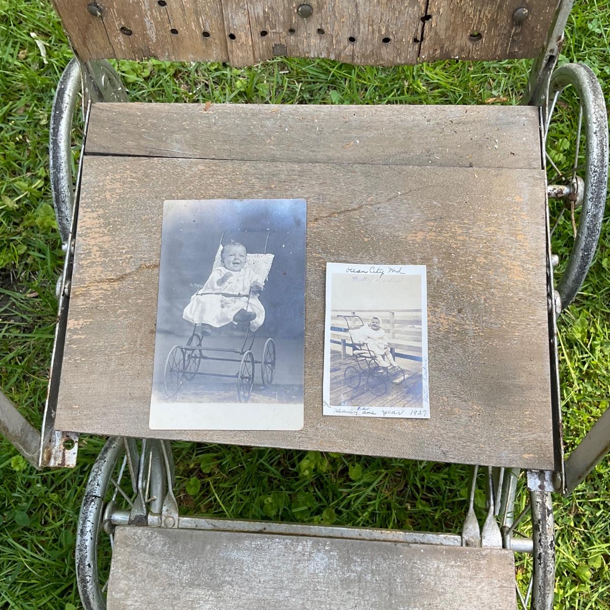 stroller has pictures of all babies throughout generations, one being ocean city md board walk , bassinet has collapsible legs with skirt and bumper in