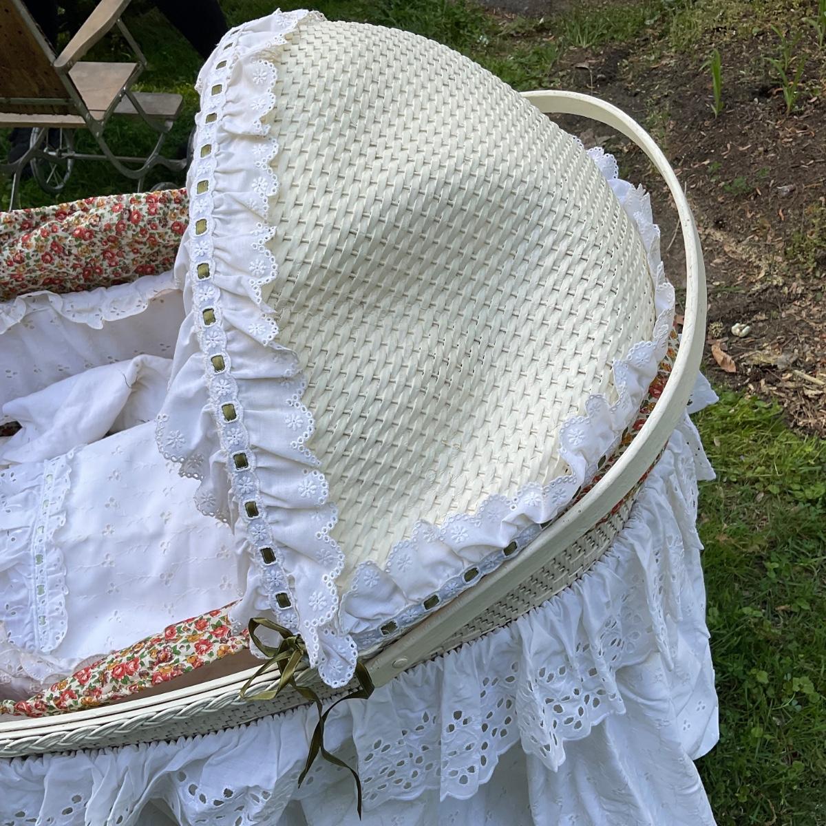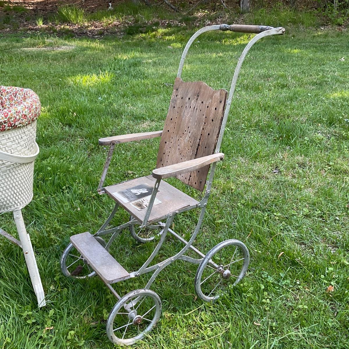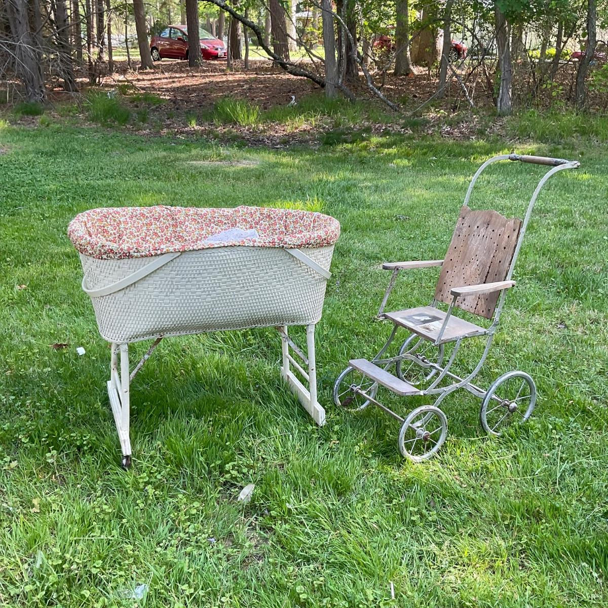 stroller has pictures of all babies throughout generations, one being ocean city md board walk , bassinet has collapsible legs with skirt and bumper in
