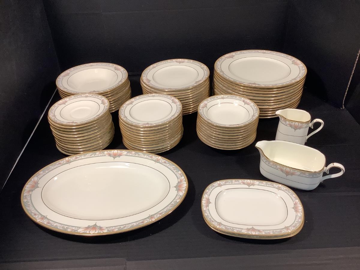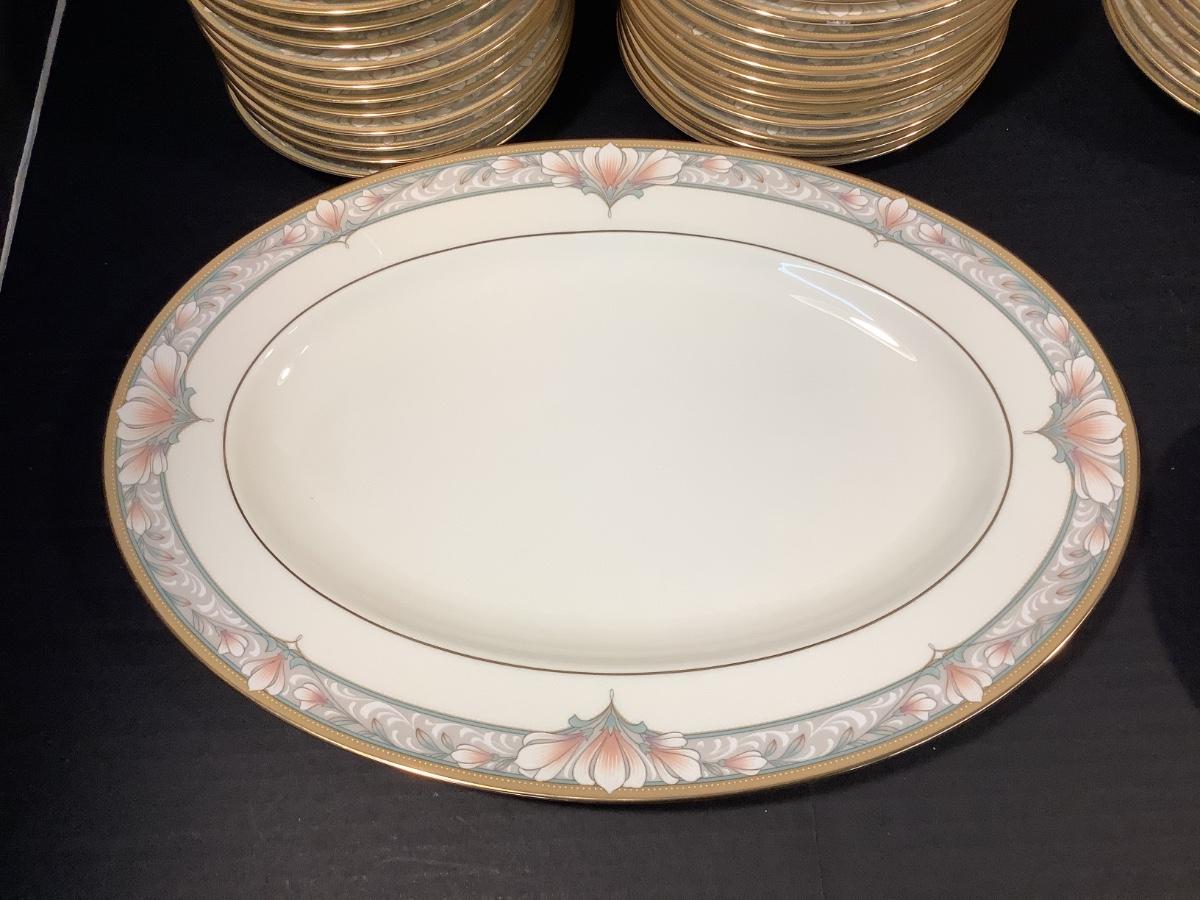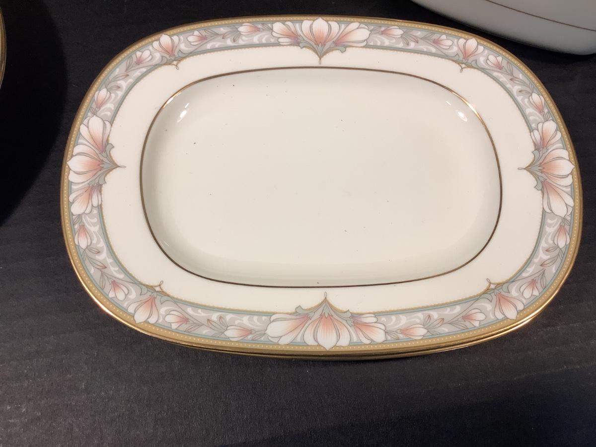 16" oval serving platter, 7-1/2" gravy boat, 3-3/4" creamer, qty (12) 6" saucers, qty (10) 8-1/4" slad bowls, qty (10) 6" dessert bowls, qty (2) 7-1/2" gravy plates, qty (12) 10-1/2" dinner plates