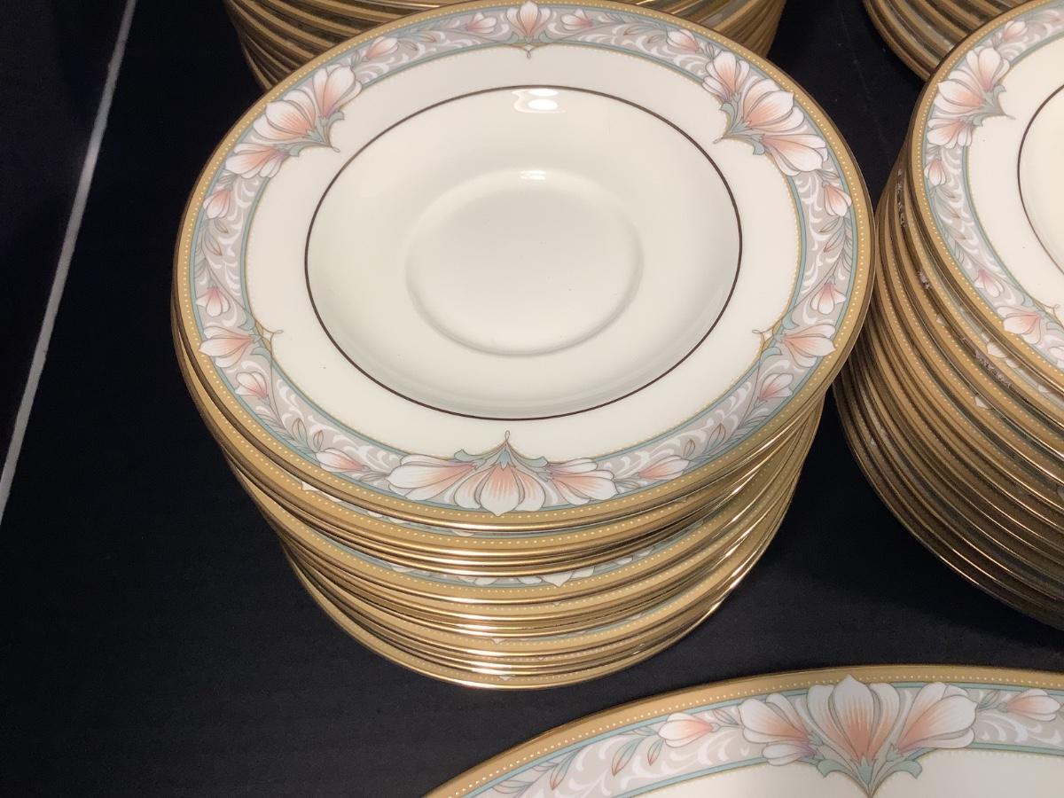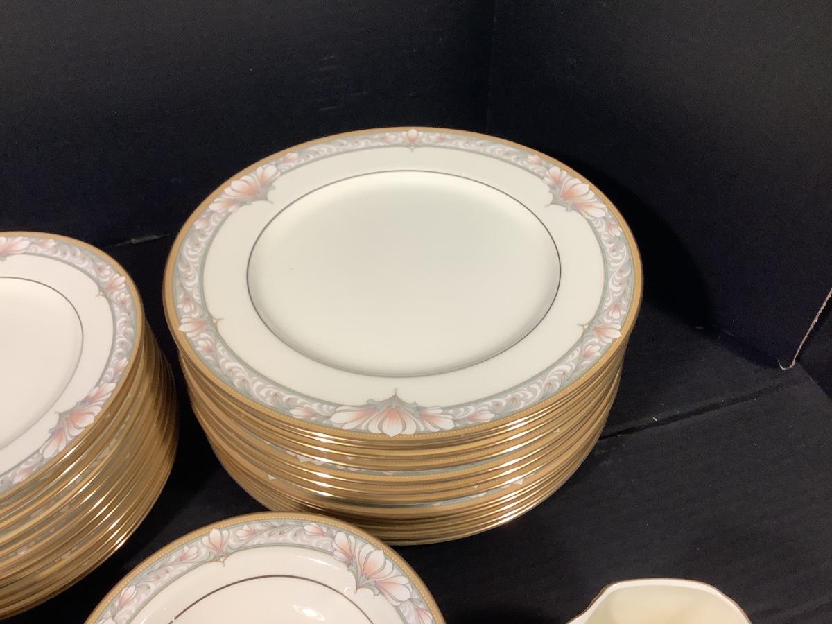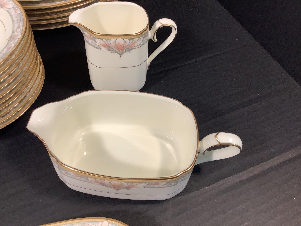 16" oval serving platter, 7-1/2" gravy boat, 3-3/4" creamer, qty (12) 6" saucers, qty (10) 8-1/4" slad bowls, qty (10) 6" dessert bowls, qty (2) 7-1/2" gravy plates, qty (12) 10-1/2" dinner plates