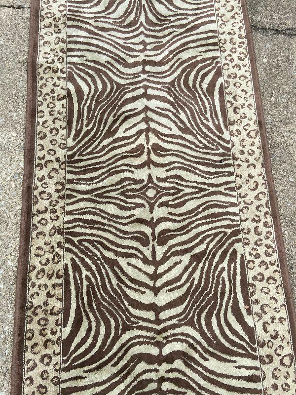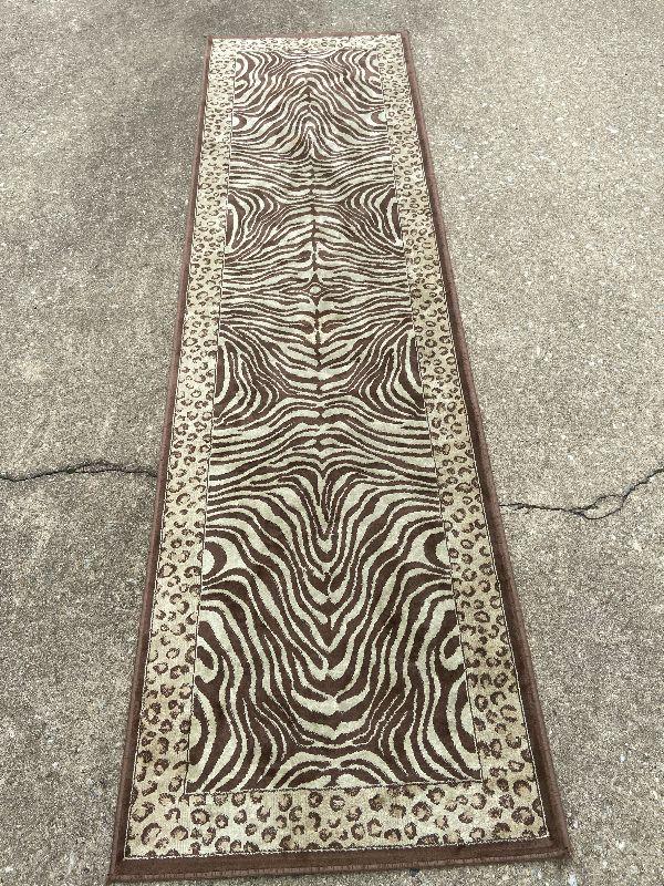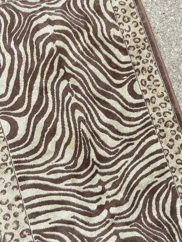 Brown animal Print rectangle rug. Please see all pictures for exact contents of the lot, condition of the items, and if measurements if taken. Thank you for looking and have fun bidding.