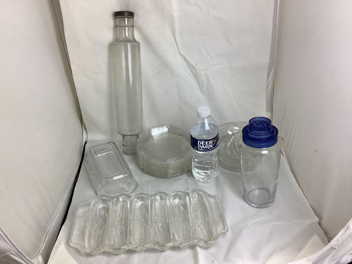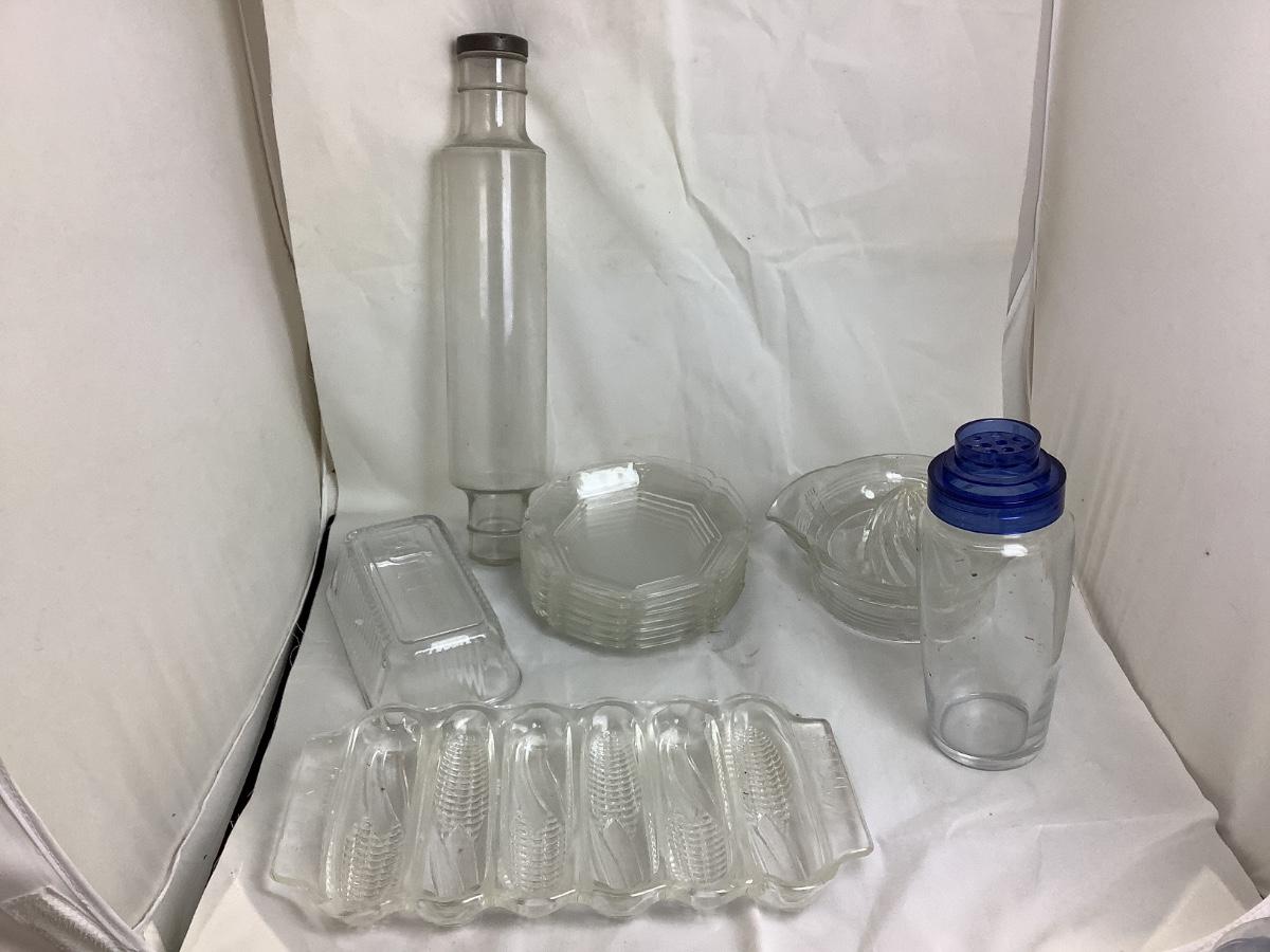 glass rolling pin, juicer, covered butter, corn plate , shaker with plastic blue top