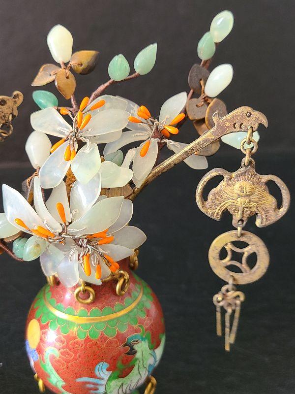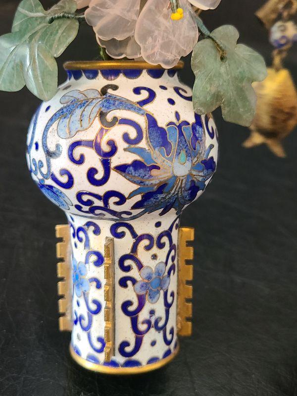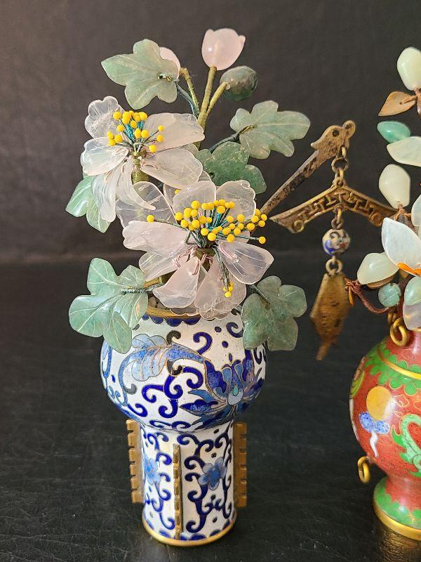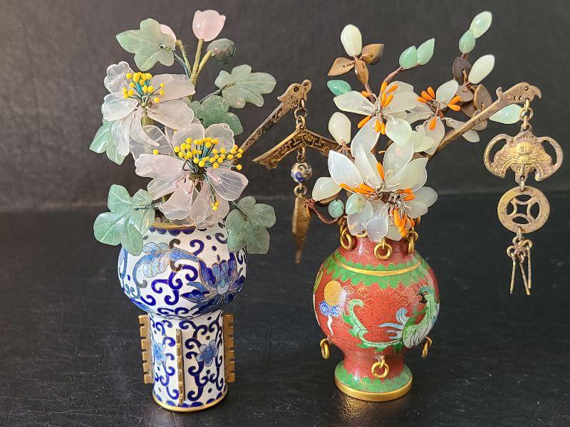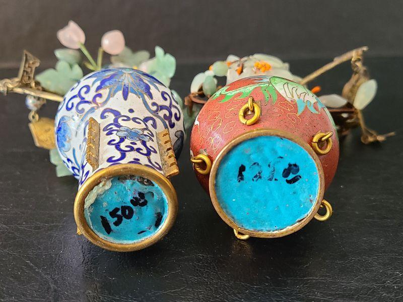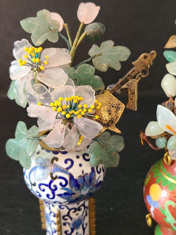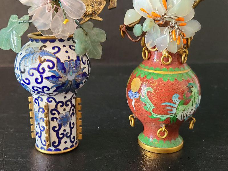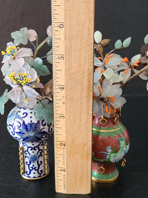 G14: Set of Two Mini Cloisonne Vases with Jade & Agate Flowers
