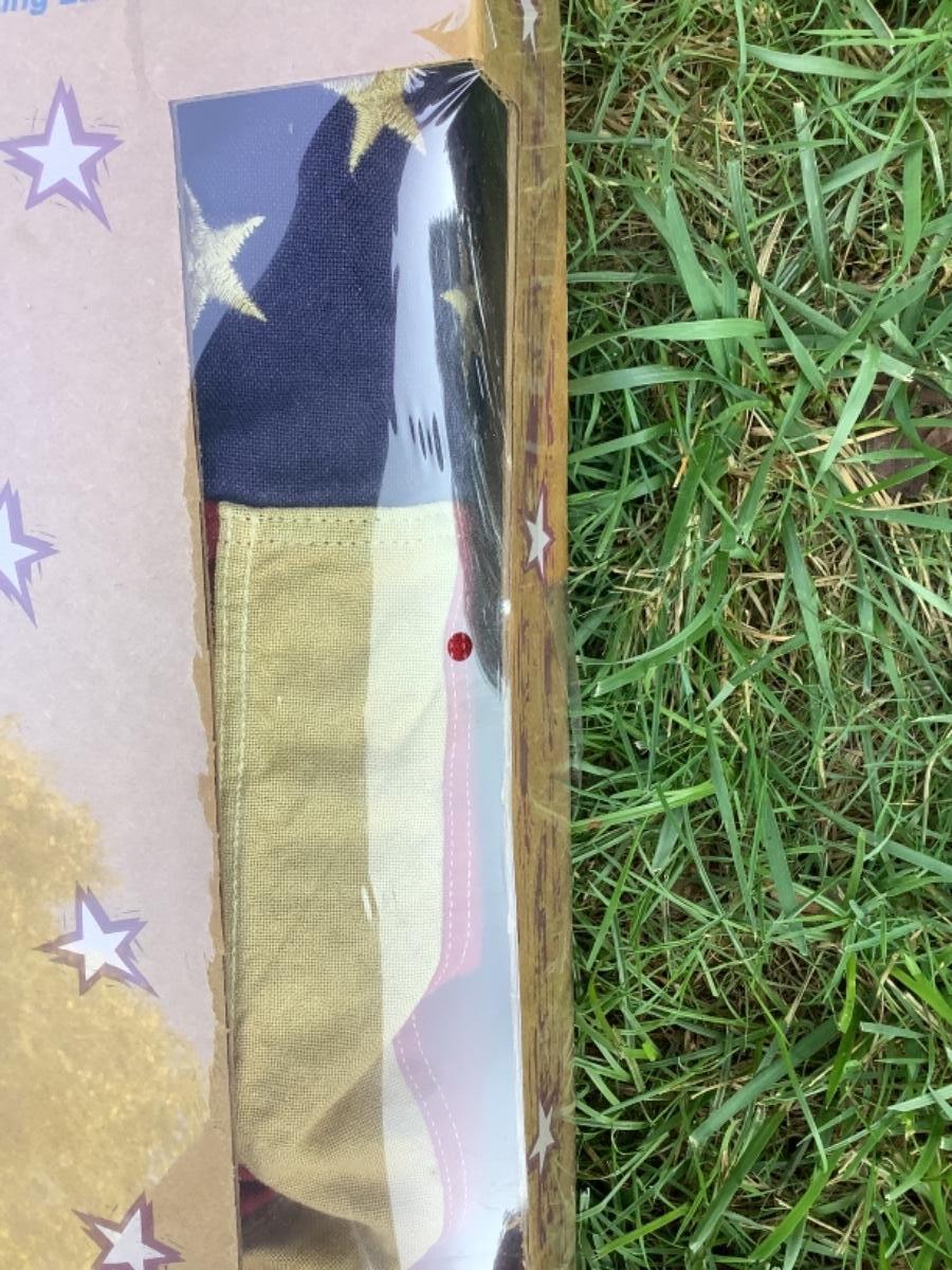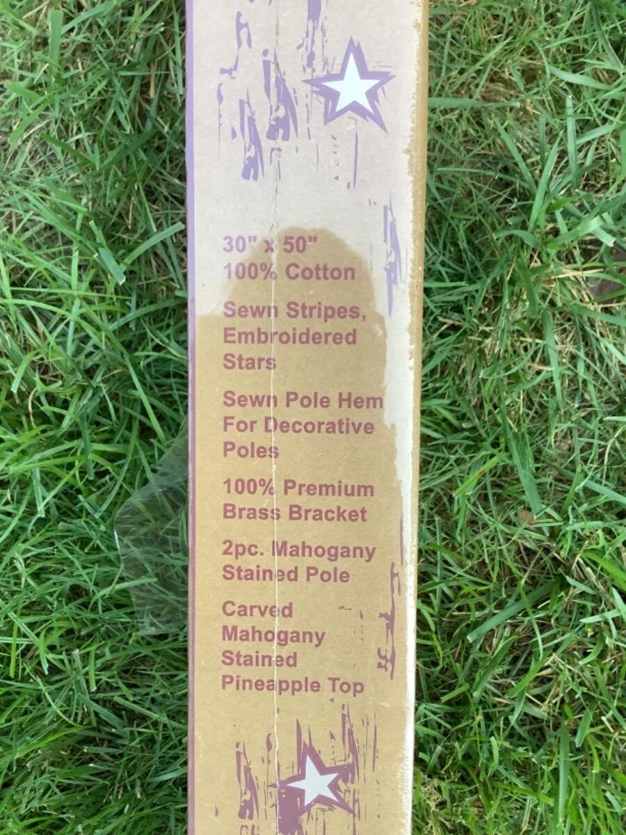 30” x 50” 100% cotton sewn stripes, embroidered stars , mahogany stained pole