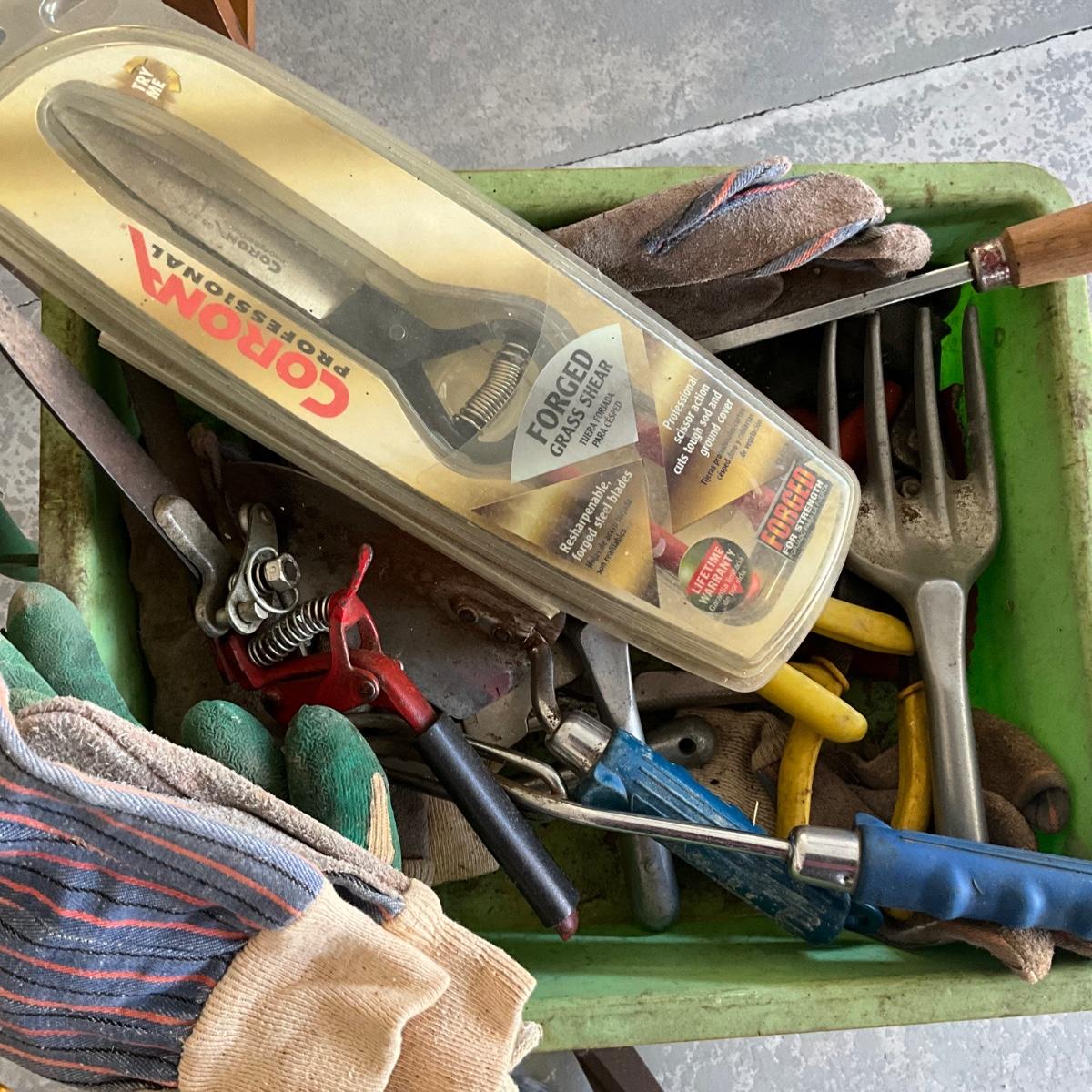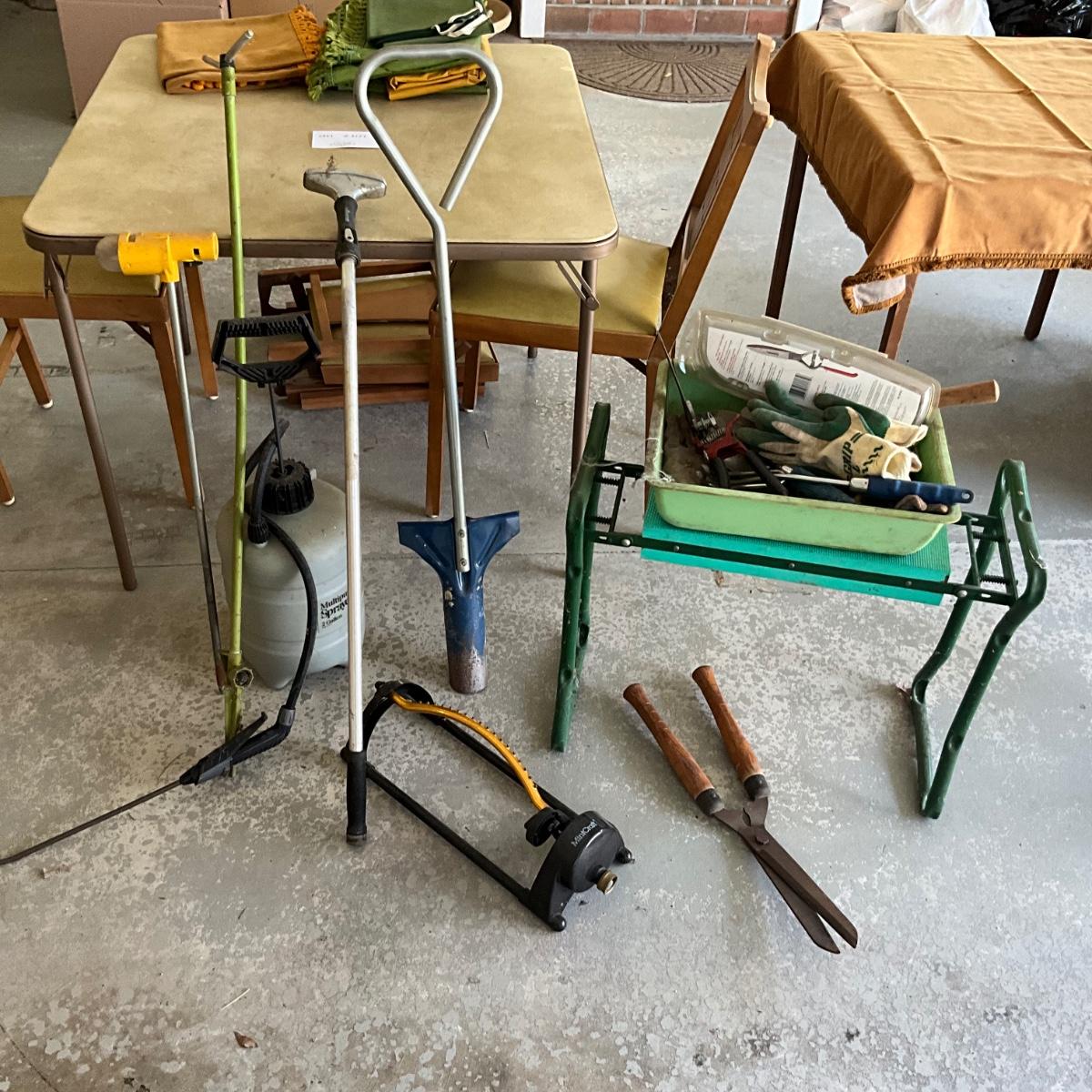 Comes with trimmers, sprinklers, sprayer, garden bench, and miscellaneous tools.