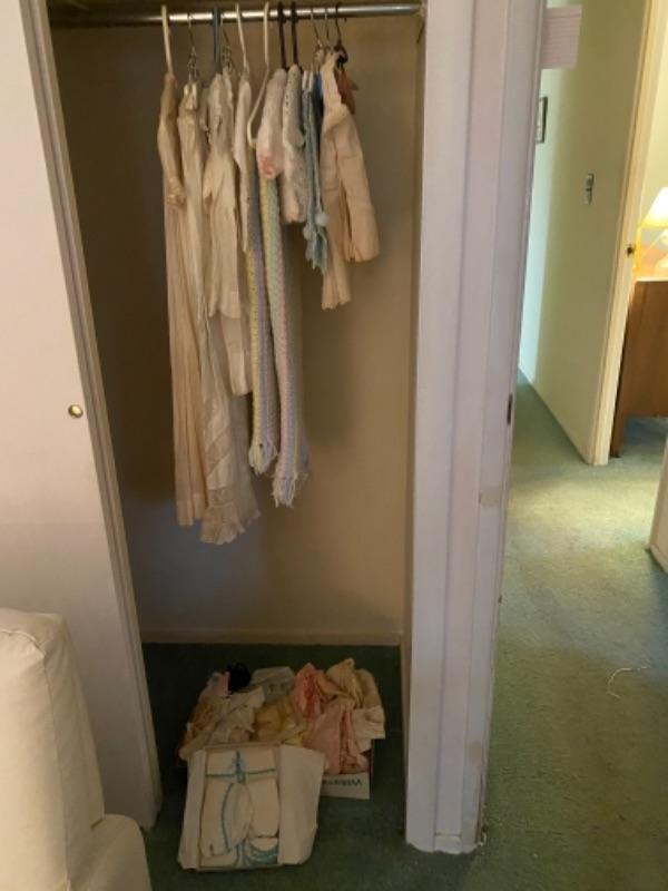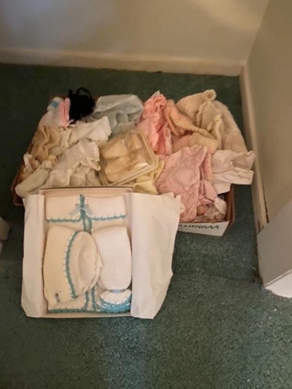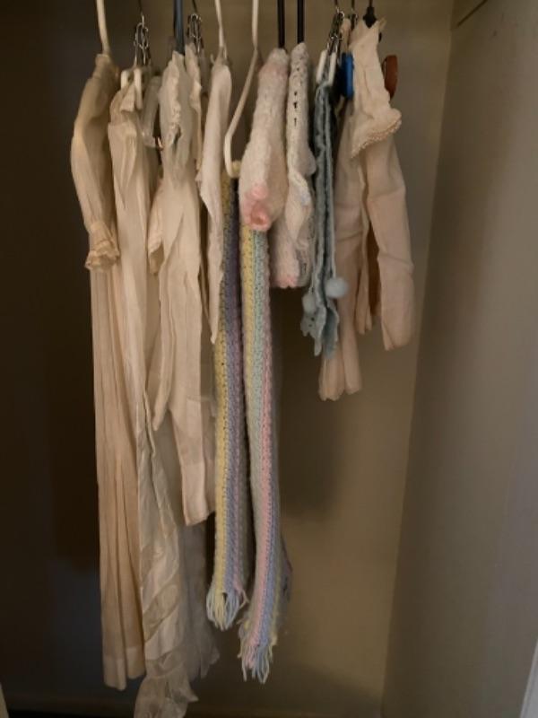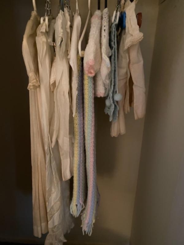 Vintage baby clothing including blanket, christening dress, baby outfits, shoes, and much more