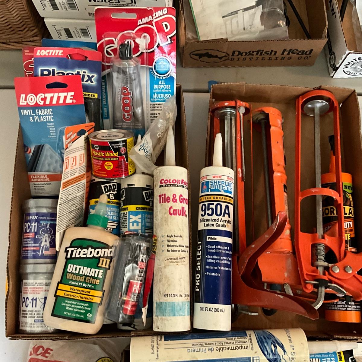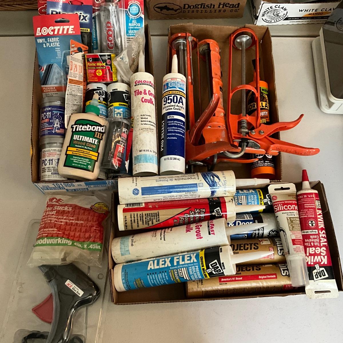 Glue gun with glue sticks, various types of glued, caulk, sealants and more
