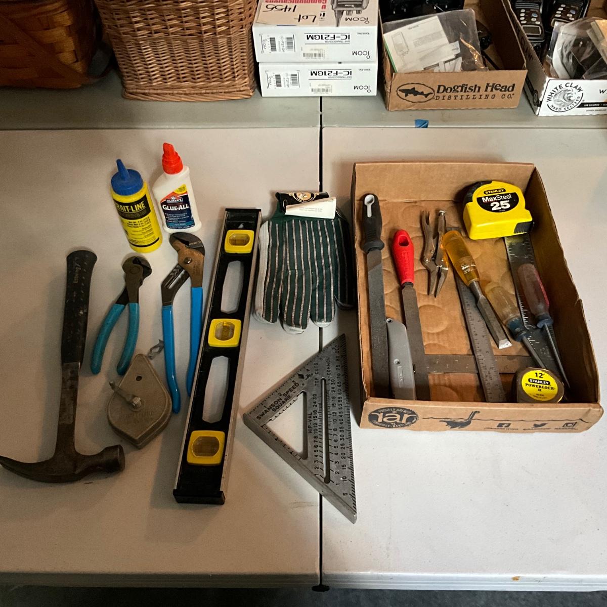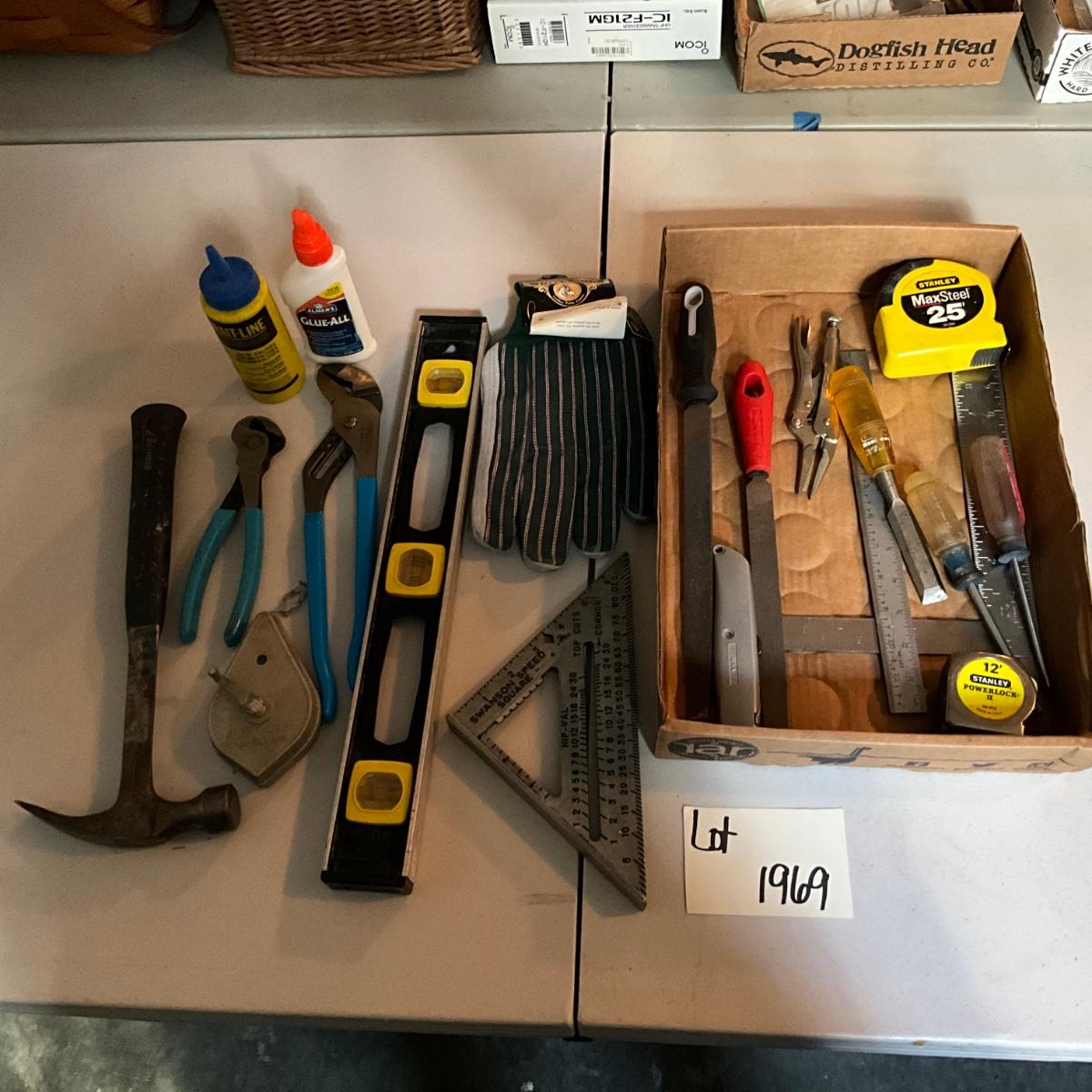 G1969 Misc. Tool Lot with files, Level, Hammer, Chalk Line , and more
